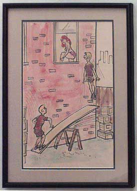 American Mid-Century (unsigned) black framed caricature watercolor of 2 boys jumping on seesaw to peek into window of nude woman