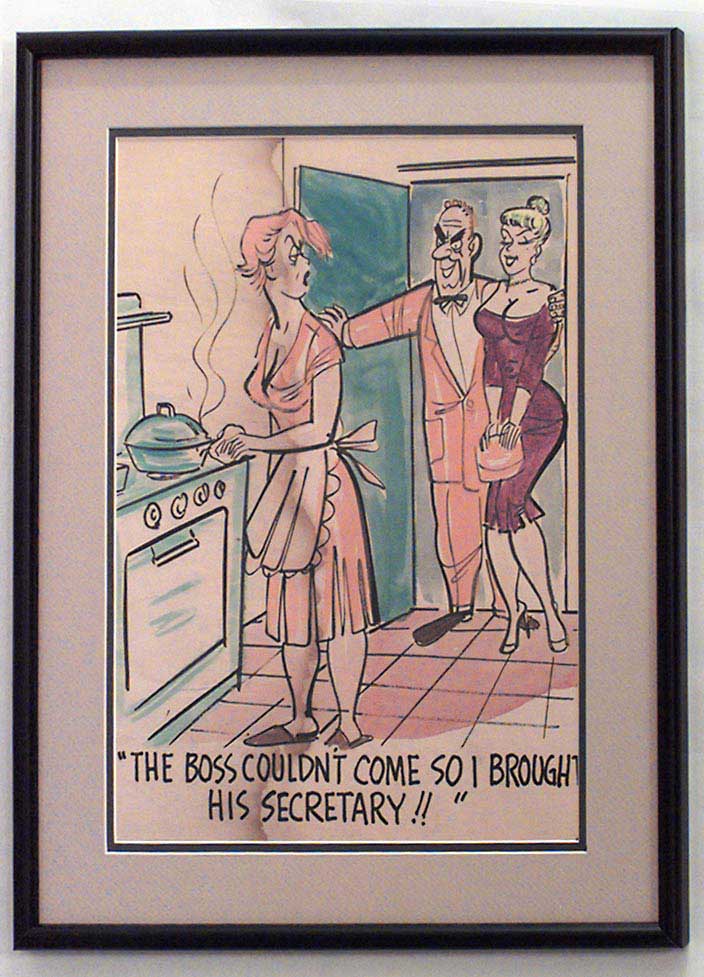 American Mid-Century (unsigned) black framed caricature watercolor of wife cooking in kitchen ("The boss couldn't come so I brought his secretary!").