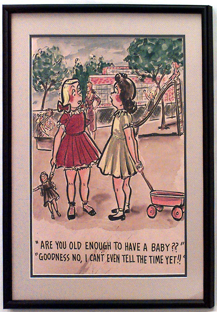 American Mid-Century (unsigned) black framed caricature watercolor of 2 girls in playground ("Are you old enough to have a baby? Goodness no, I can't even tell time yet!").