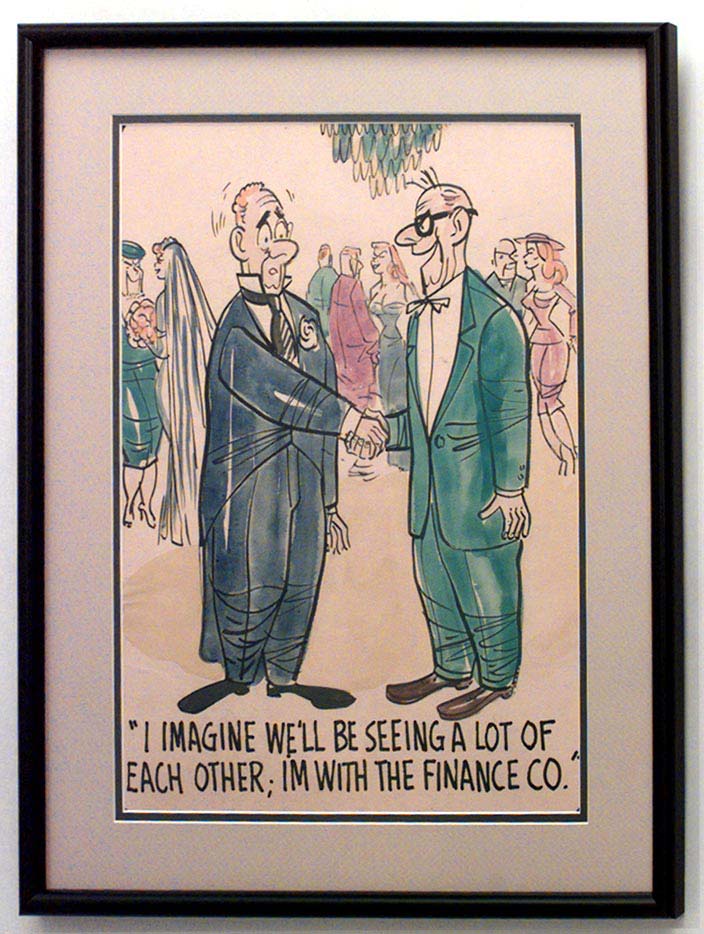 American Mid-Century (unsigned) black framed caricature watercolor of a groom & a guest at his wedding ("I imagine we'll be seeing a lot of each other; I'm with the finance co.").