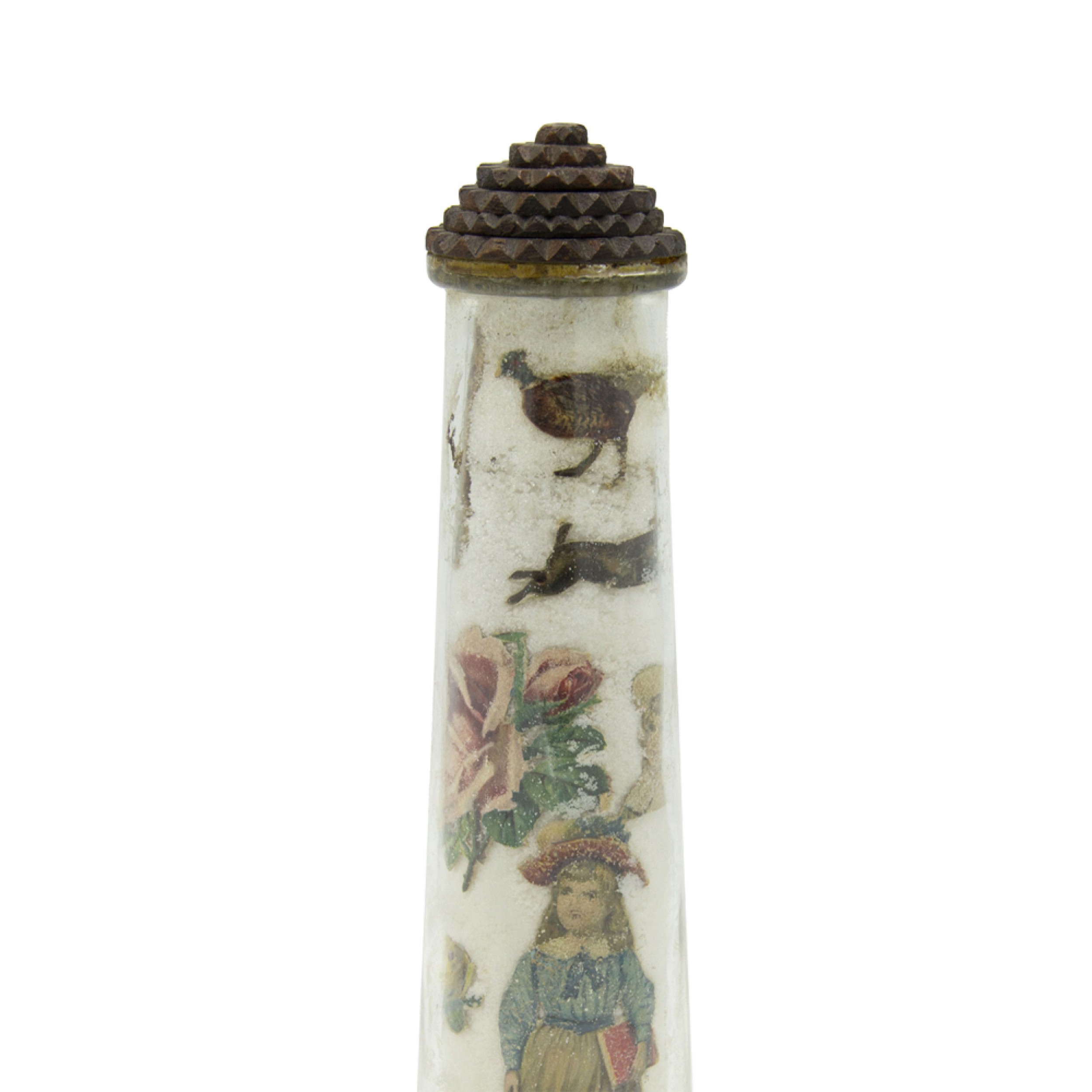 PAIR of English Victorian-style (19/20th Century) decoupage conical shaped glass bottles filled with white sand with a carved wood top (PRICED AS PAIR)