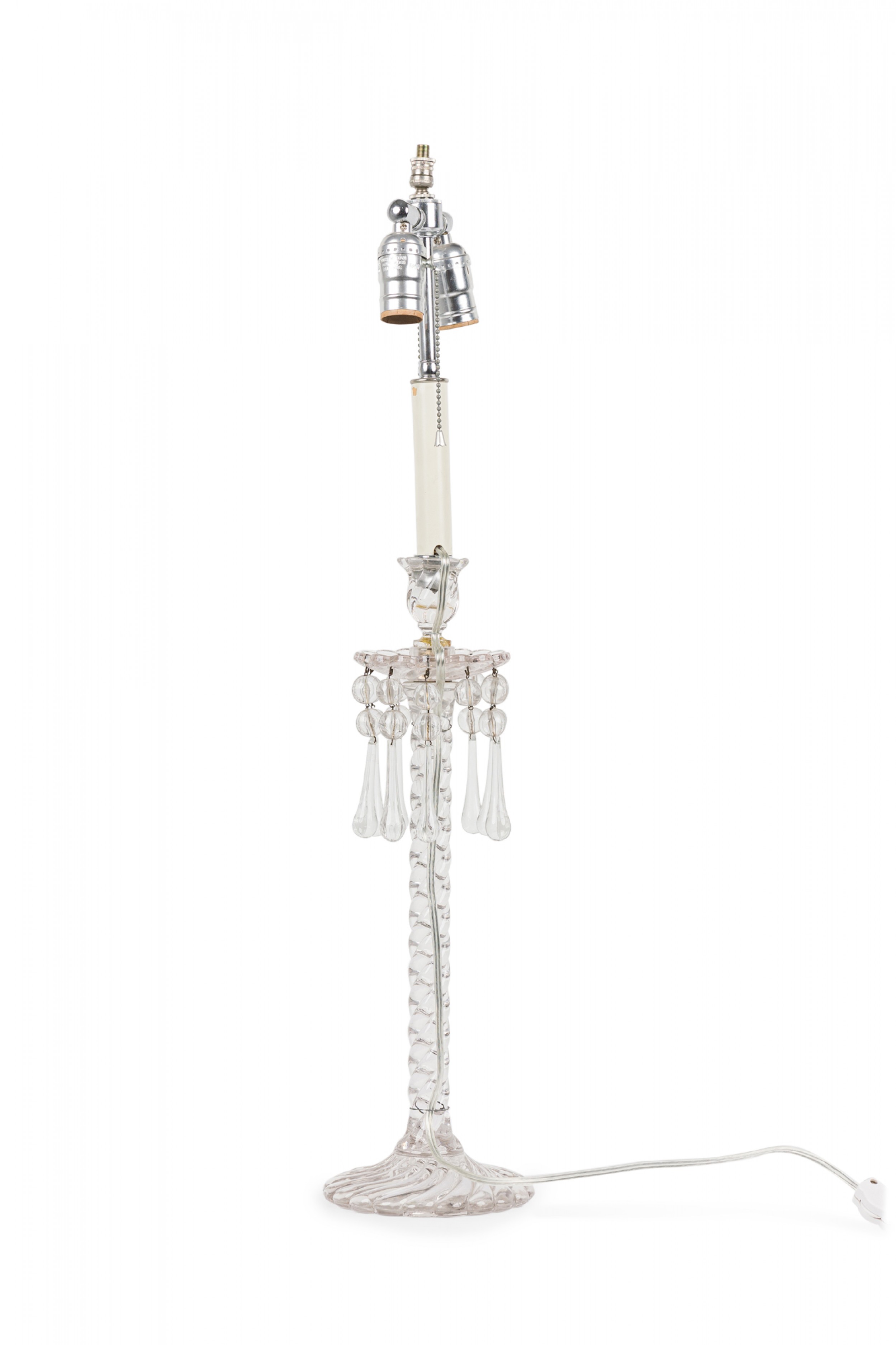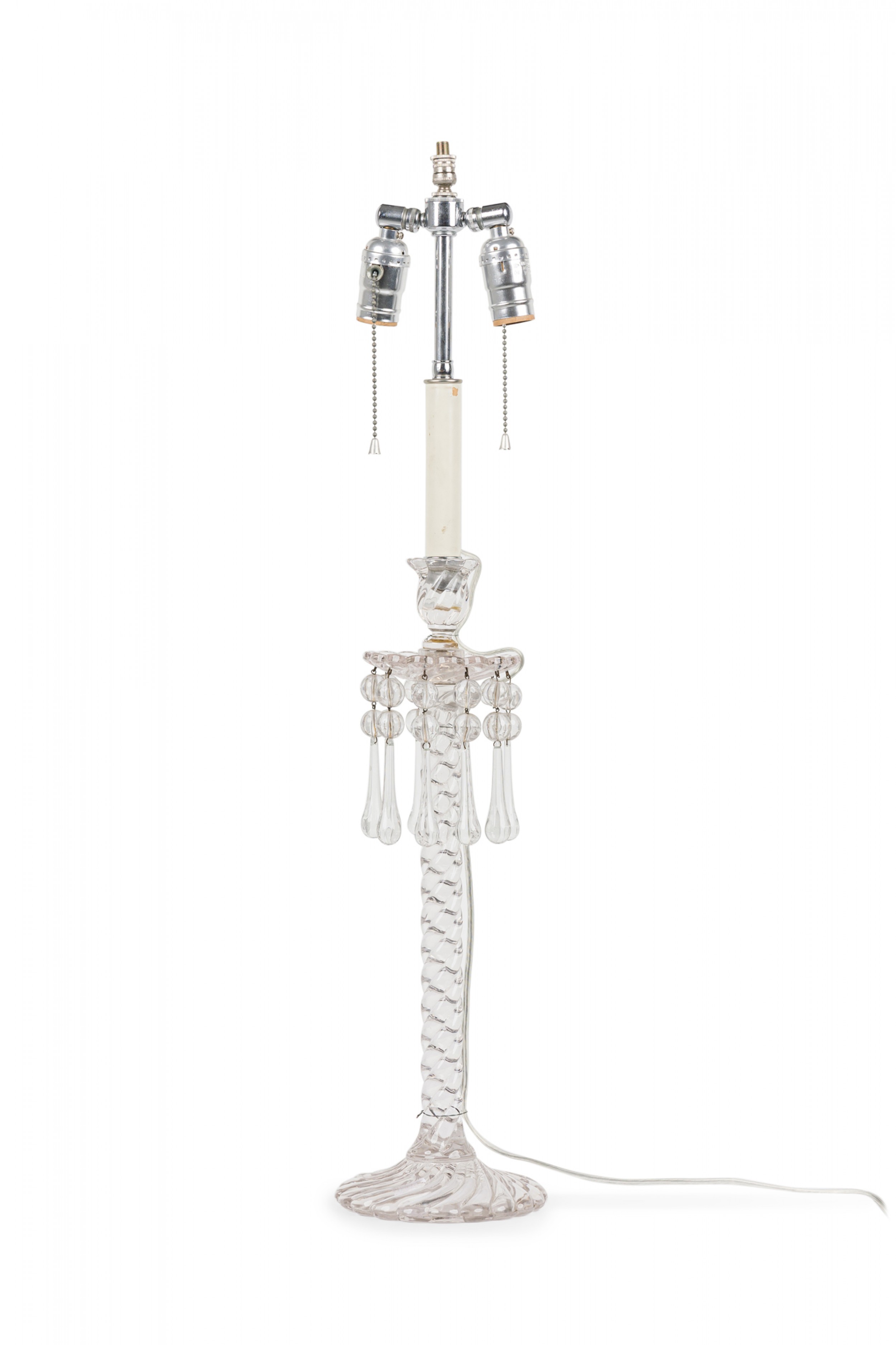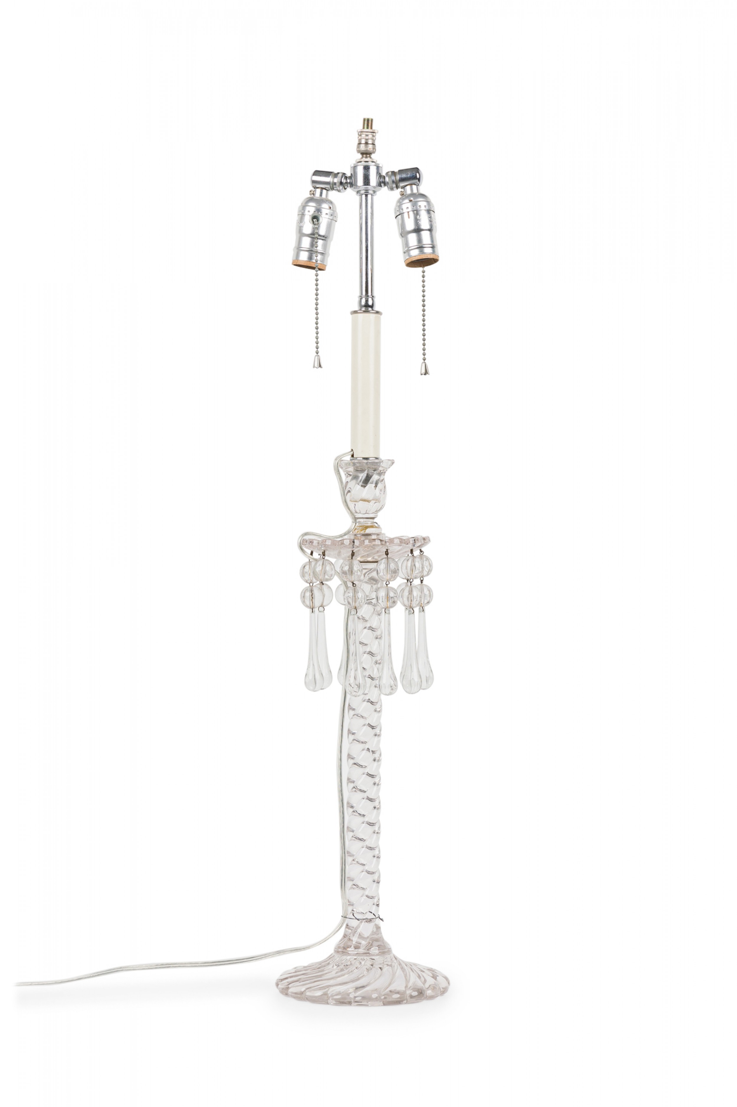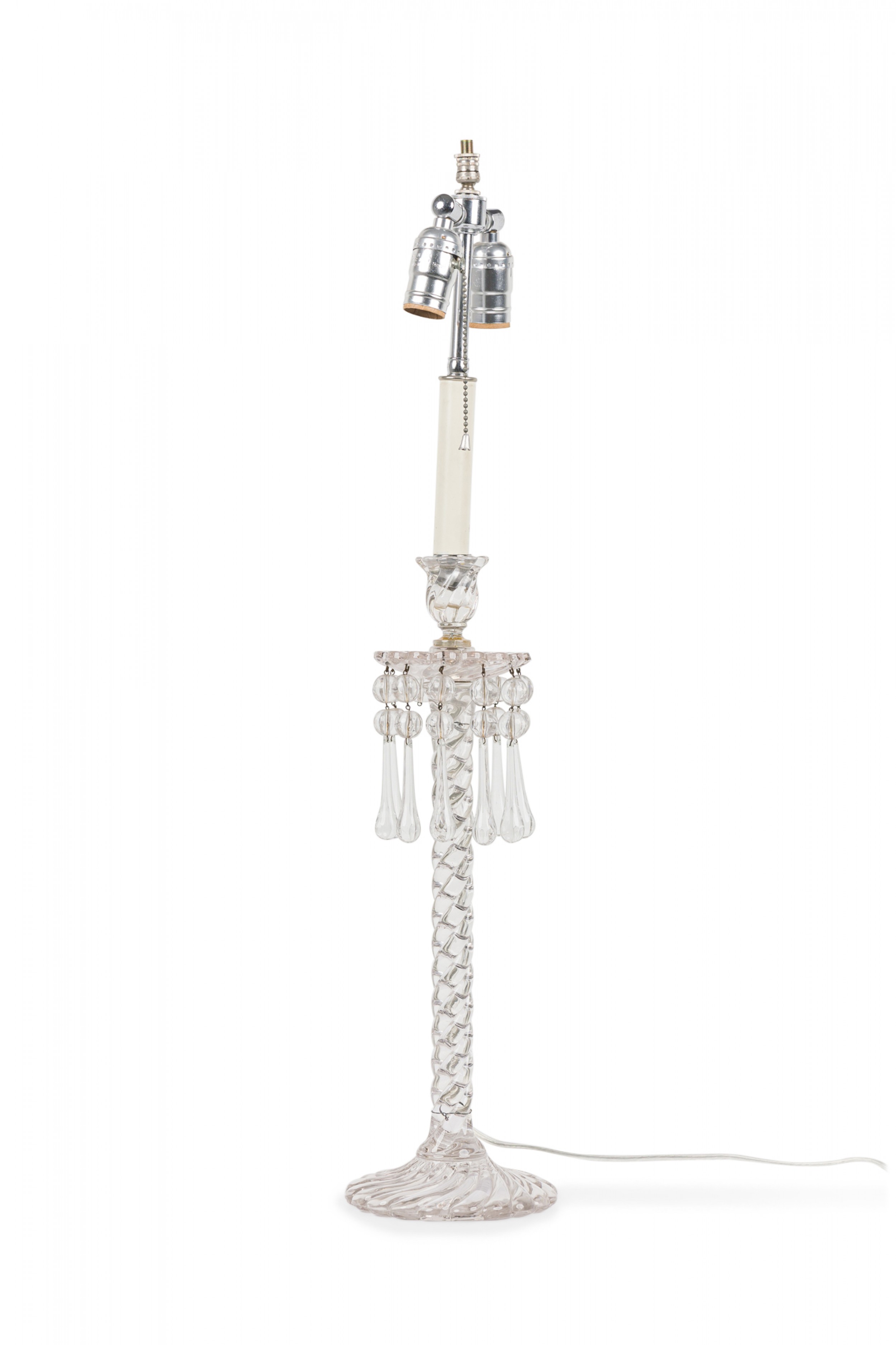 PAIR of English Victorian style (possibly Waterford) crystal glass table lamps featuring two adjustable silver metal light sockets, supported by a machine cut glass faux rope form column which includes sphere/teardrop ornaments suspended from an upturned flower form bowl ending in a circular base. (Lampshades: ABAT-JOUR) (PRICED AS PAIR).