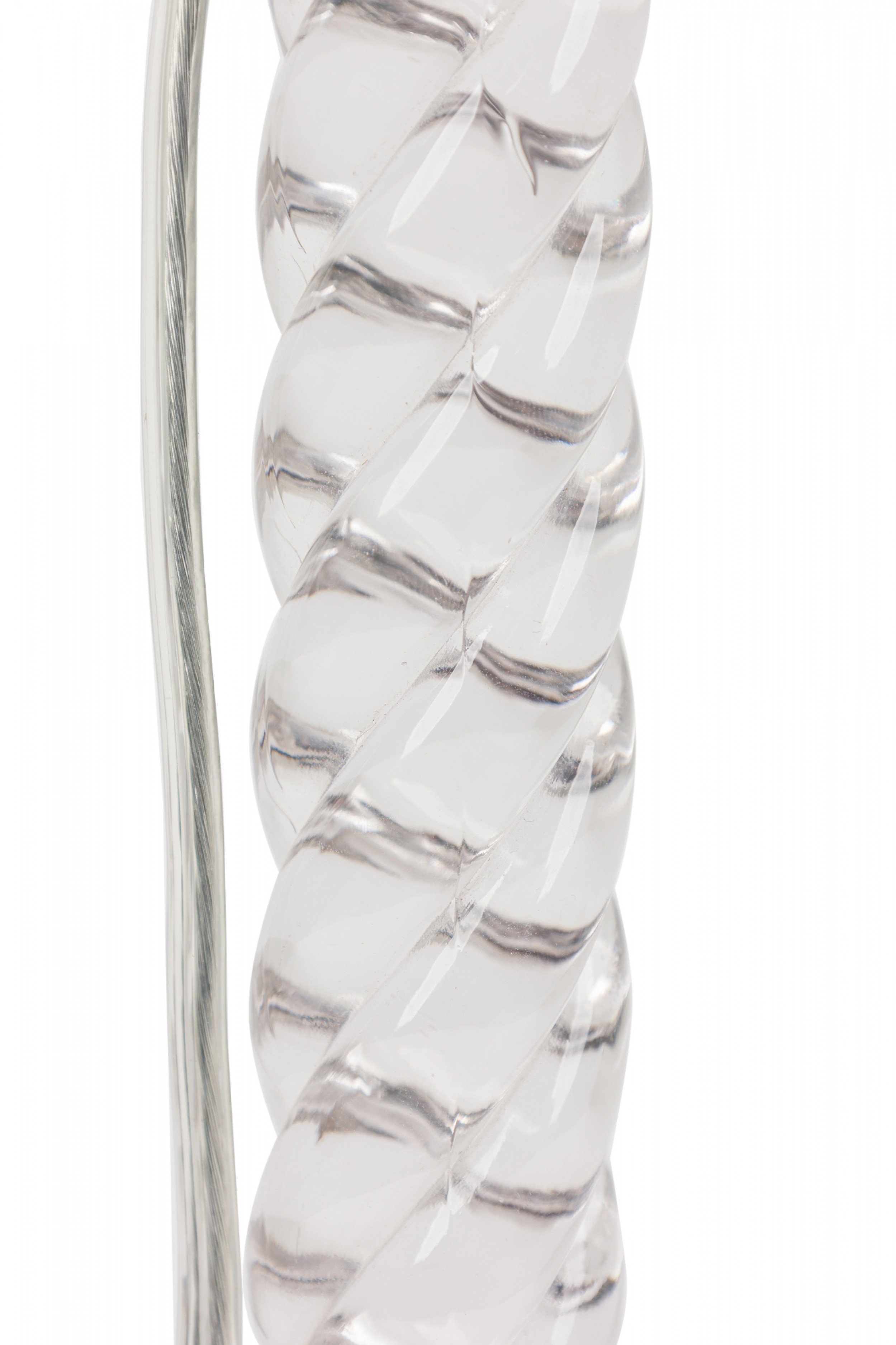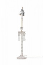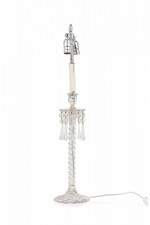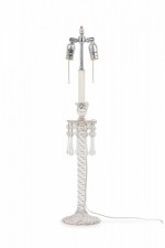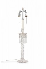 PAIR of English Victorian style (possibly Waterford) crystal glass table lamps featuring two adjustable silver metal light sockets, supported by a machine cut glass faux rope form column which includes sphere/teardrop ornaments suspended from an upturned flower form bowl ending in a circular base. (Lampshades: ABAT-JOUR) (PRICED AS PAIR)