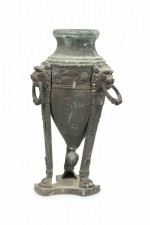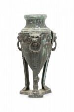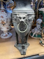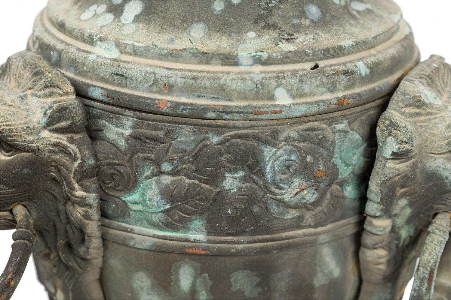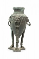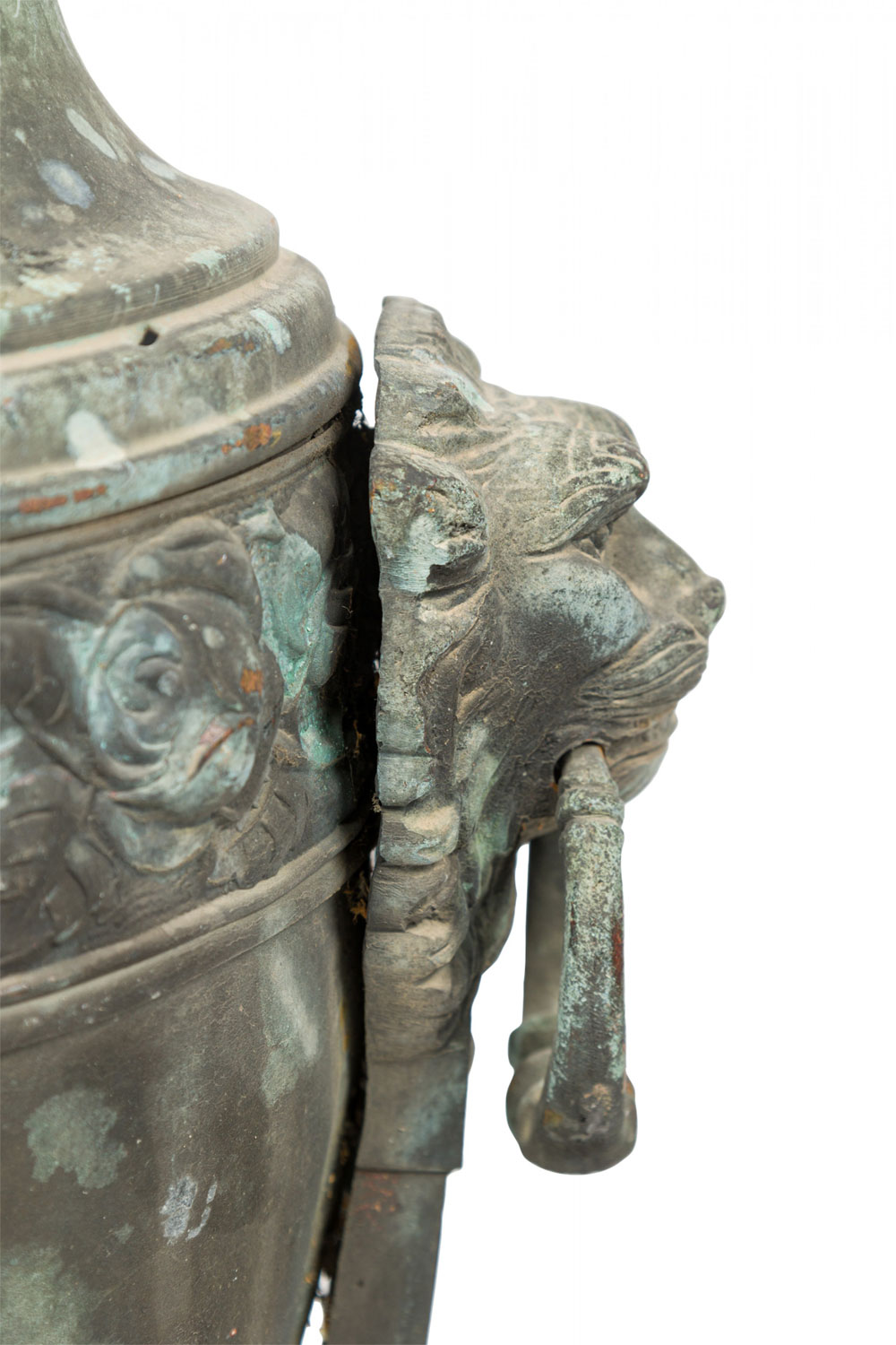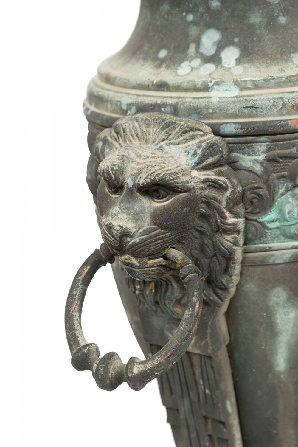 PAIR of Italian Neo-classic (19th Century) bronze Athenian form urns with natural patina, featuring lions' head embellishments with ring handles, resting on three lions feet joined by a triangular base (PRICED AS PAIR)