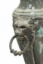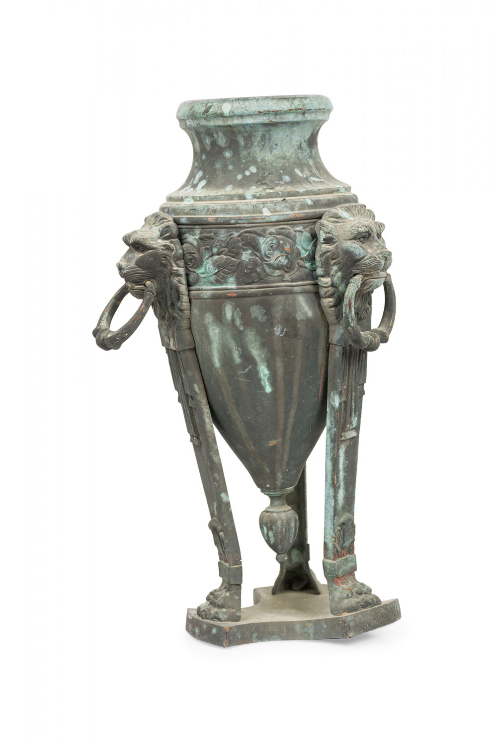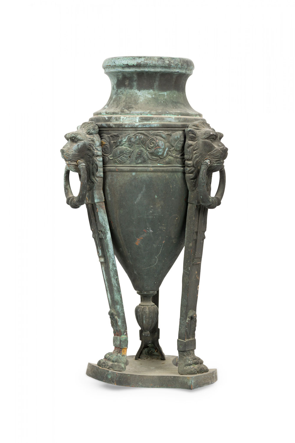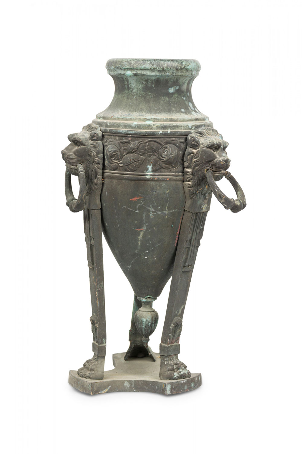 PAIR of Italian Neo-classic (19th Century) bronze Athenian form urns with natural patina, featuring lions' head embellishments with ring handles, resting on three lions feet joined by a triangular base (PRICED AS PAIR).