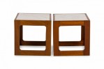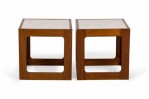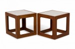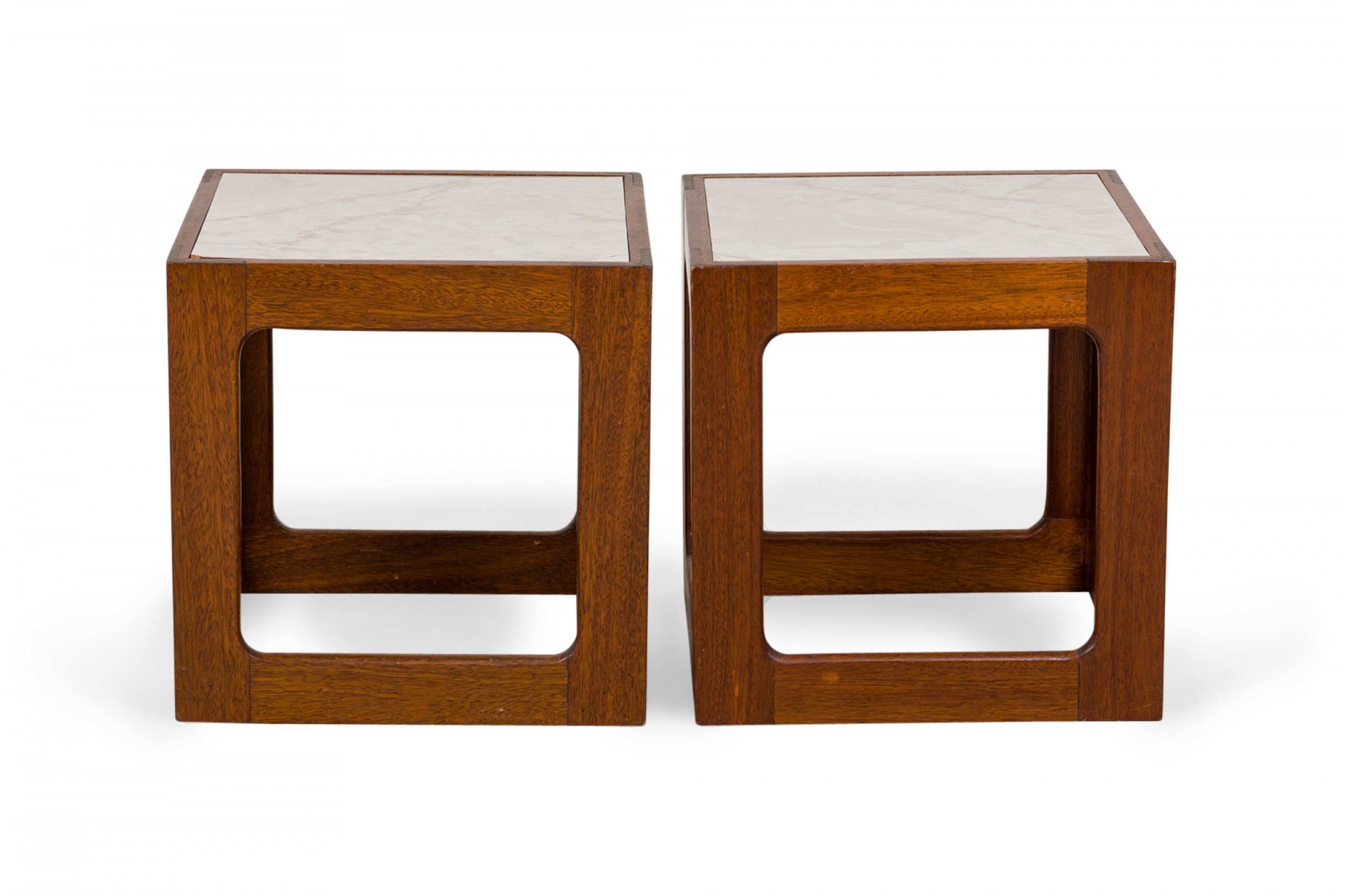 PAIR of American Mid-Century end / side tables with wooden open cube frames supporting inset white faux marble tops. (ADRIAN PEARSALL)(PRICED AS PAIR)(Matching coffee table: DUF0571).
