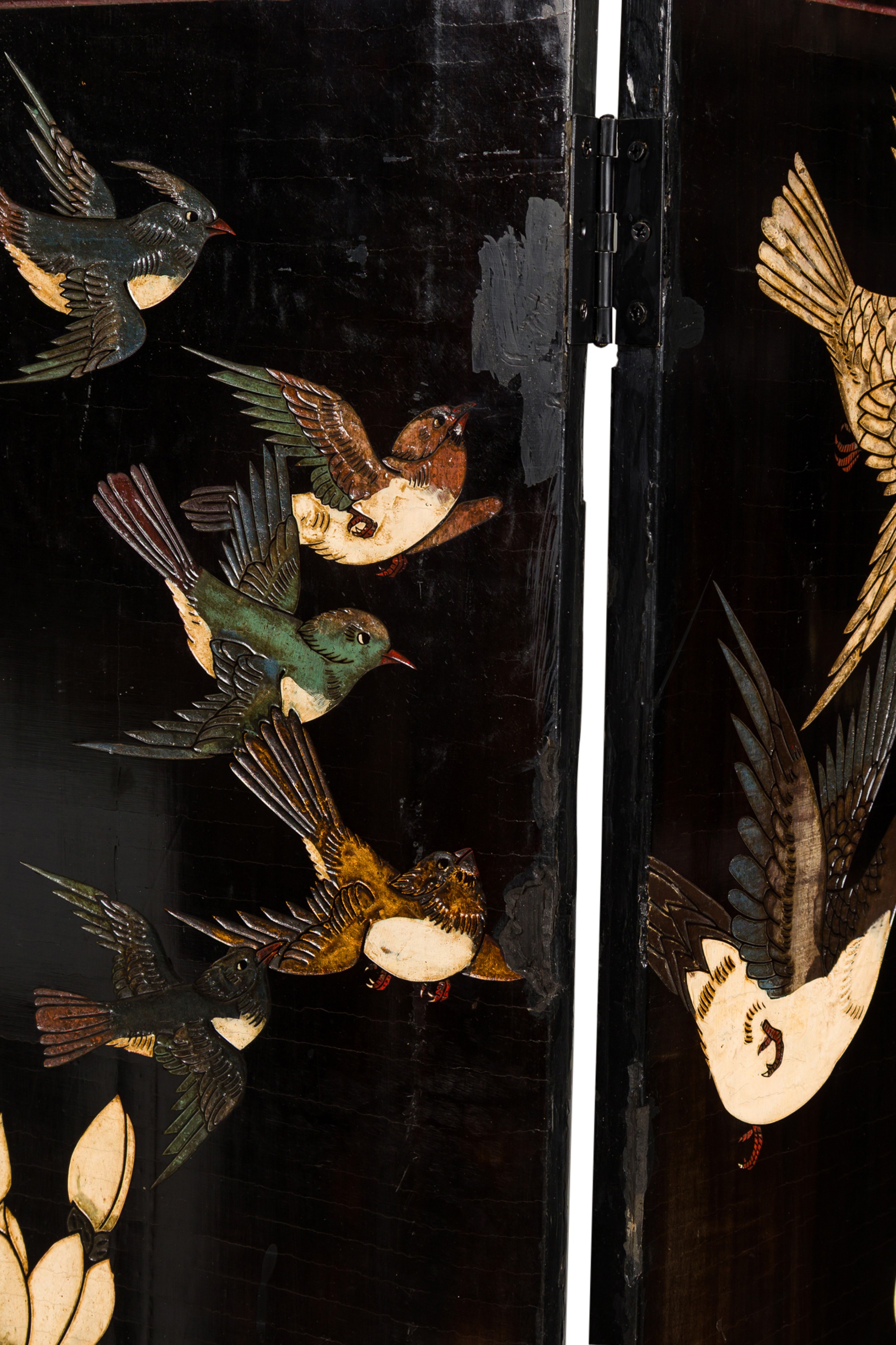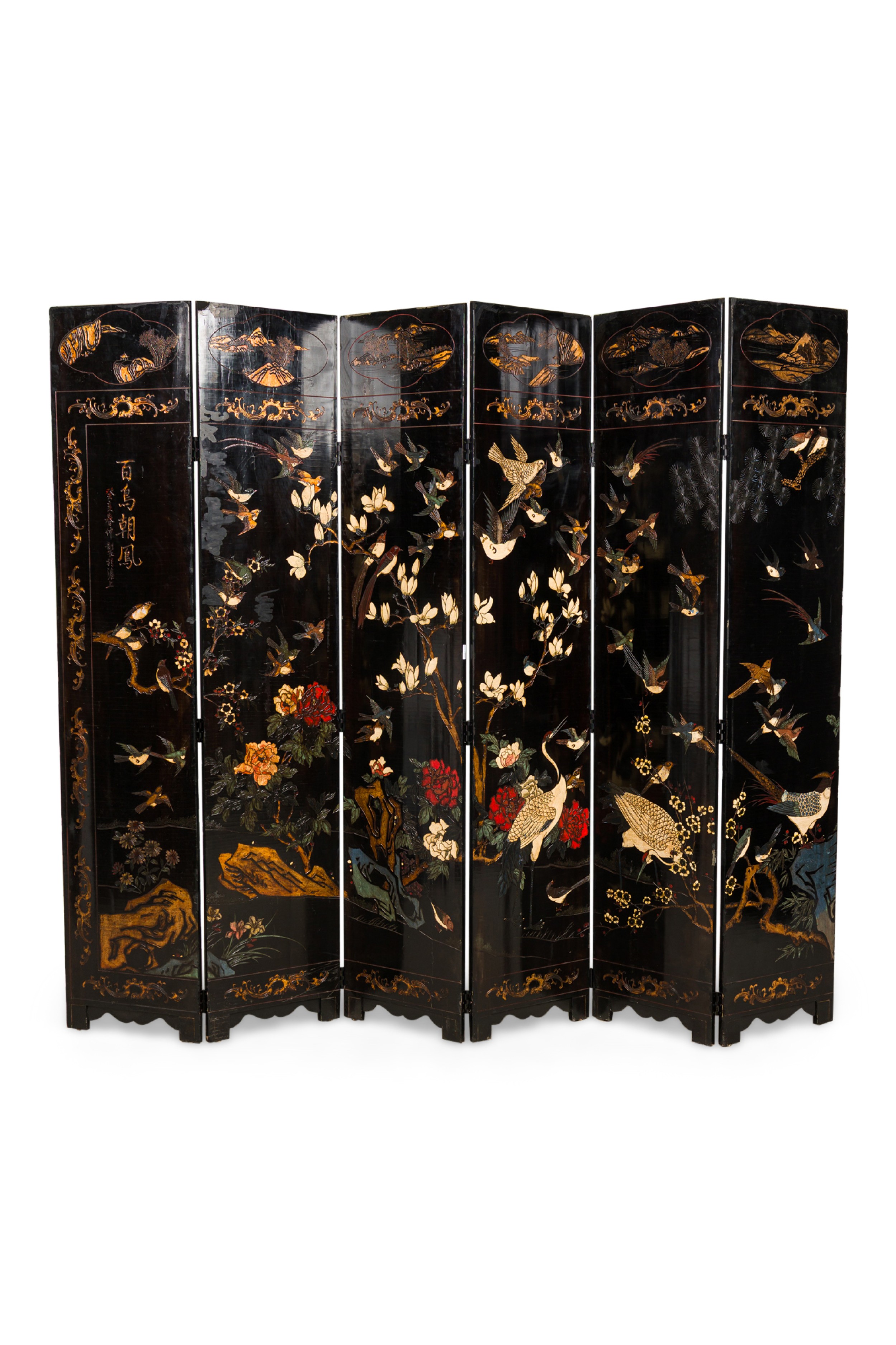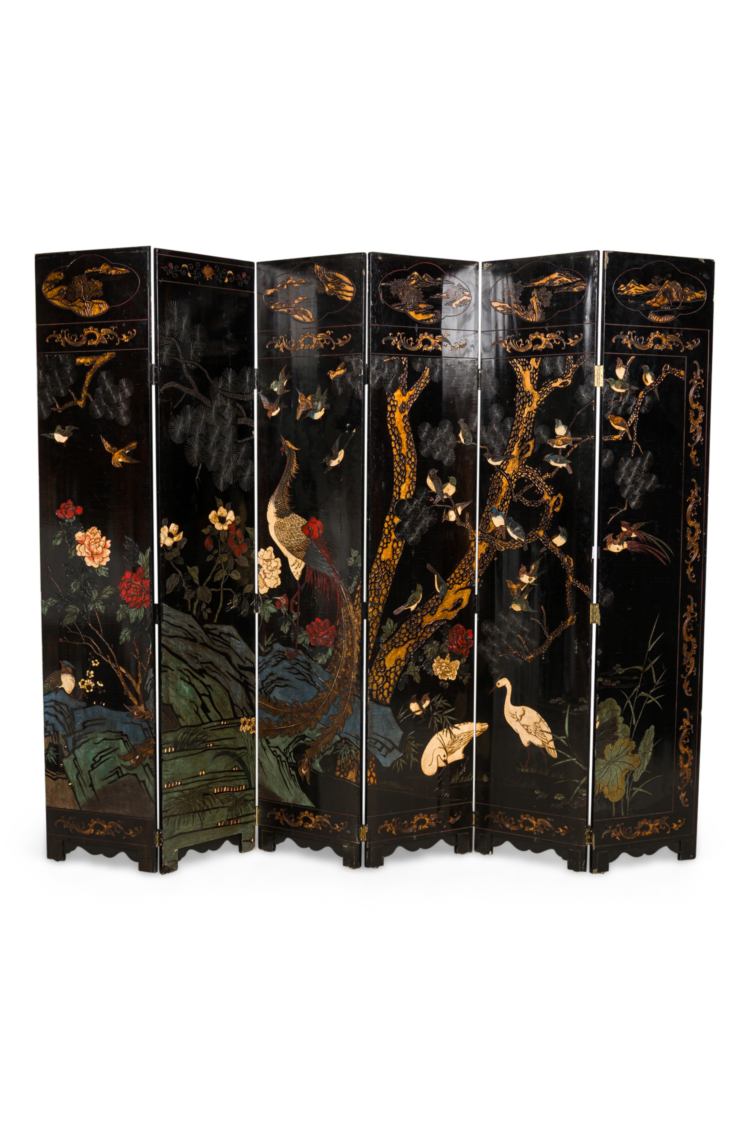 PAIR of Chinese (19th Century) 6-paneled folding black lacquered screens having gilt and decorative painted figural variety of perched birds on branches, pine, insects, prunus, flowers, reeded marshland and calligraphy with a scroll & foliate border. (PRICED AS PAIR).