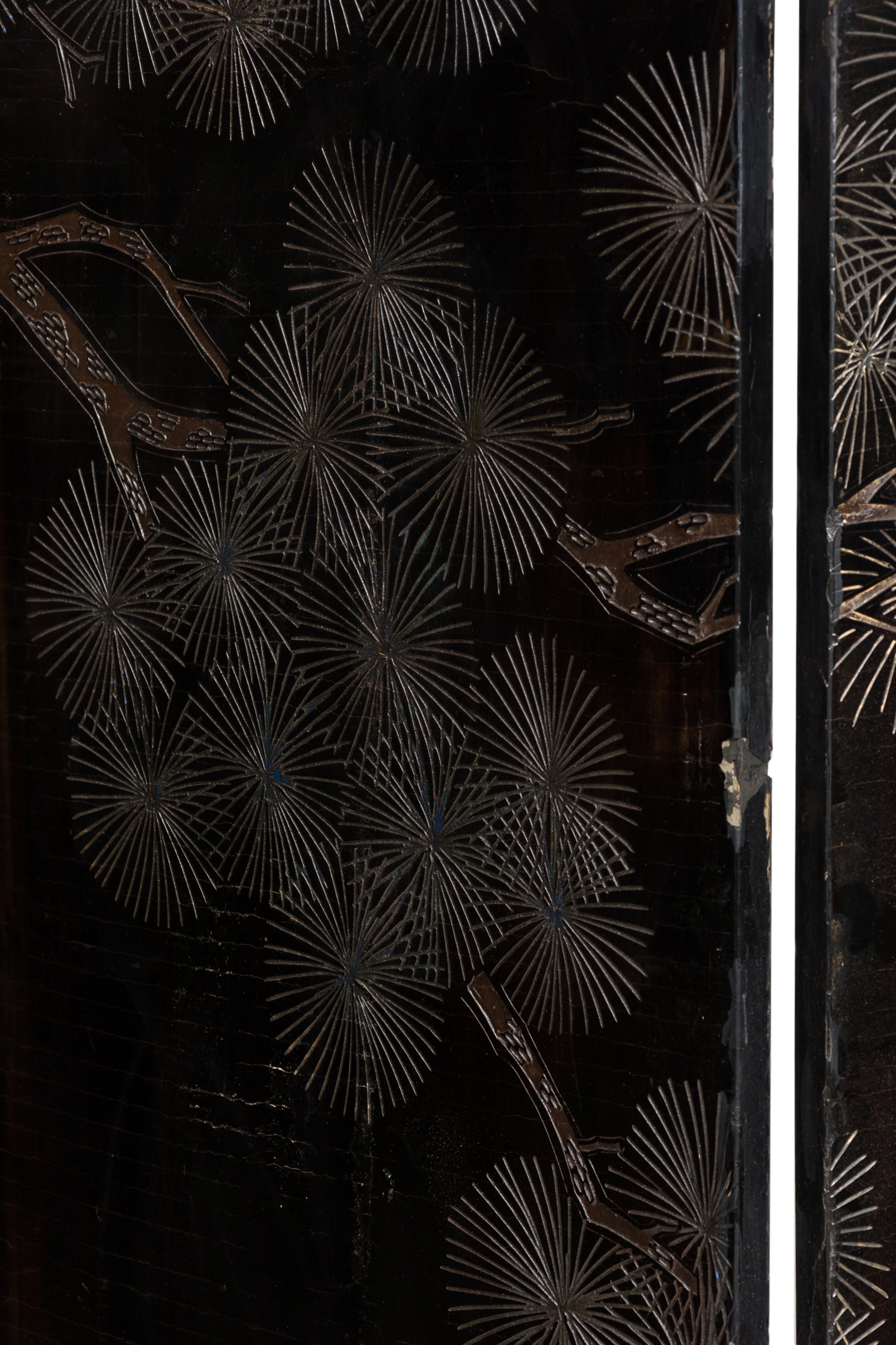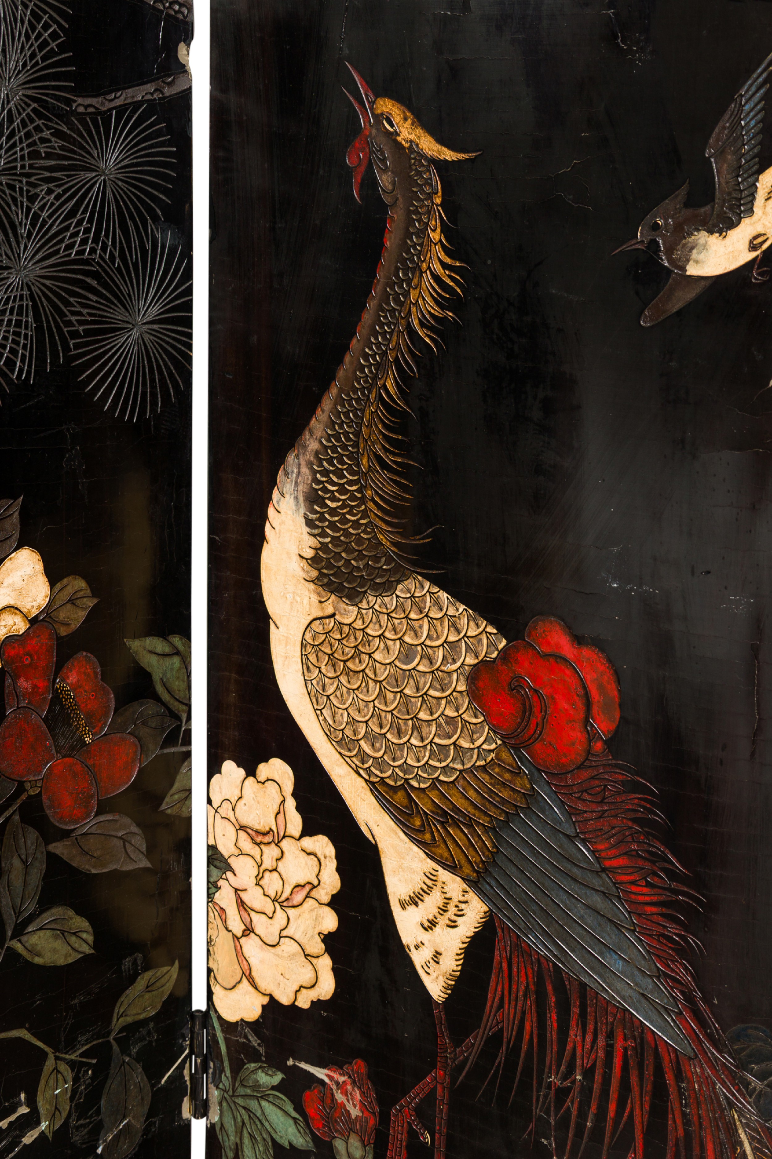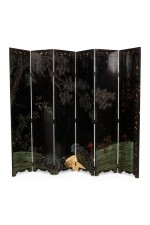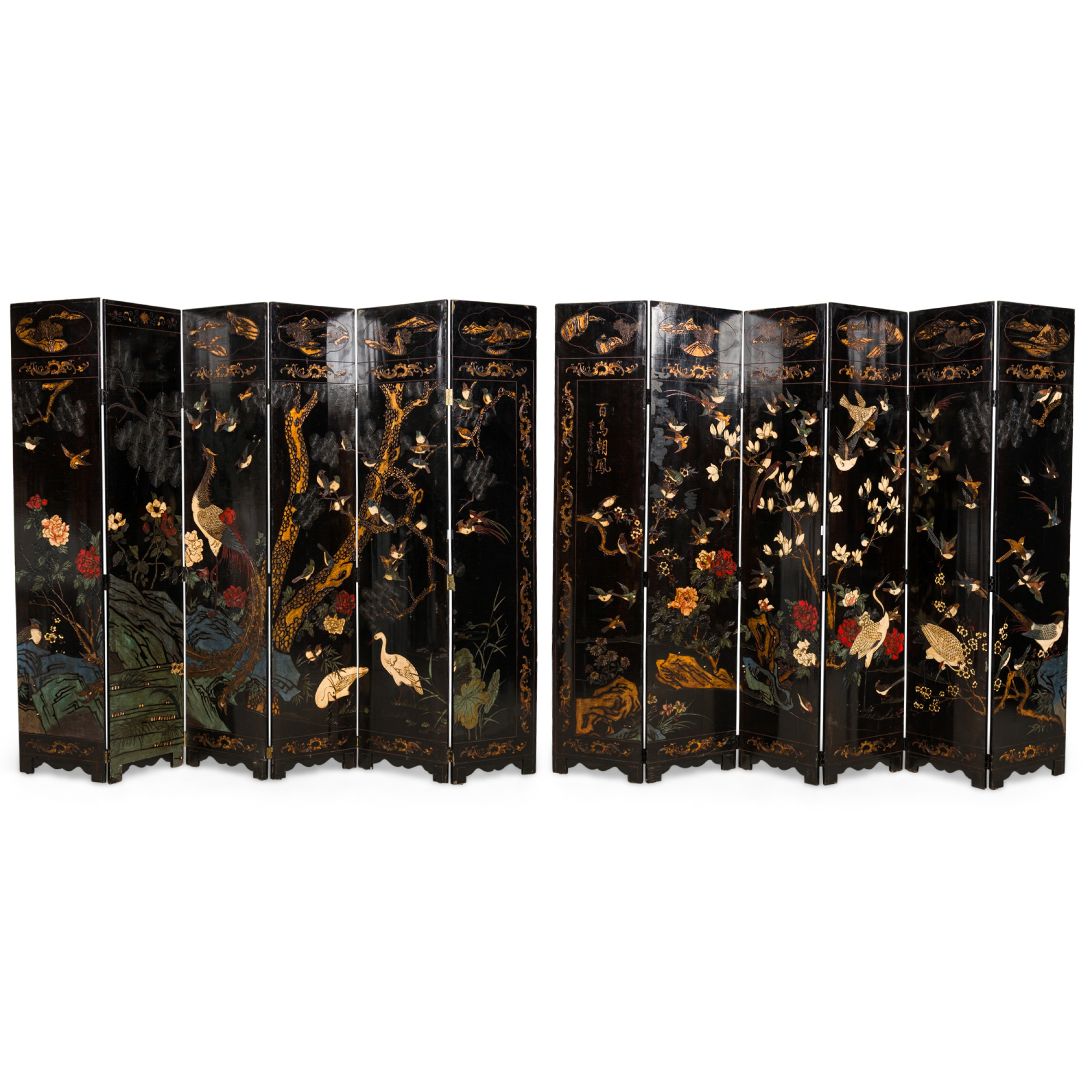 PAIR of Chinese (19th Century) 6-paneled folding black lacquered screens having gilt and decorative painted figural variety of perched birds on branches, pine, insects, prunus, flowers, reeded marshland and calligraphy with a scroll & foliate border. (PRICED AS PAIR).