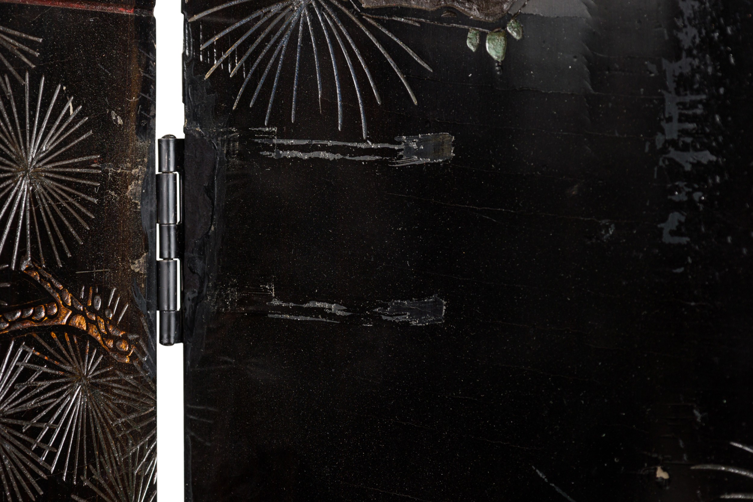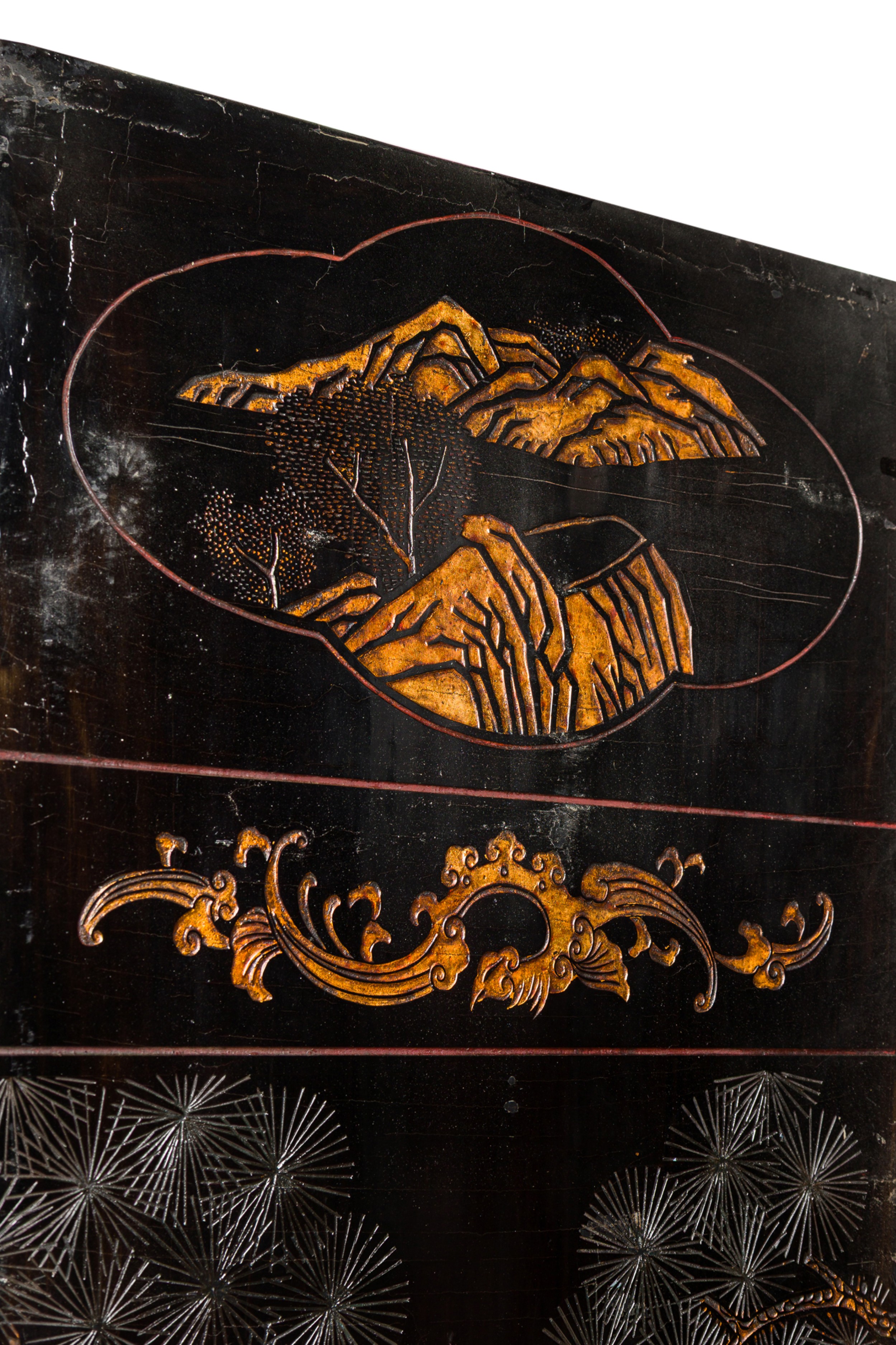 Style: Asian Materials & Techniques: Enamel, gilt / giltwood, painted, wood Category: Accessories/Décor/Bric-a-Brac Condition: wear and chipping on laquer. Good; Minor losses