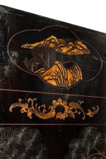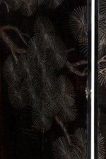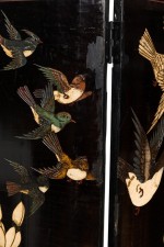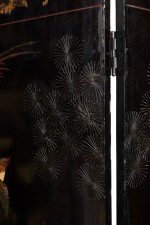 PAIR of Chinese (19th Century) 6-paneled folding black lacquered screens having gilt and decorative painted figural variety of perched birds on branches, pine, insects, prunus, flowers, reeded marshland and calligraphy with a scroll & foliate border. (PRICED AS PAIR)