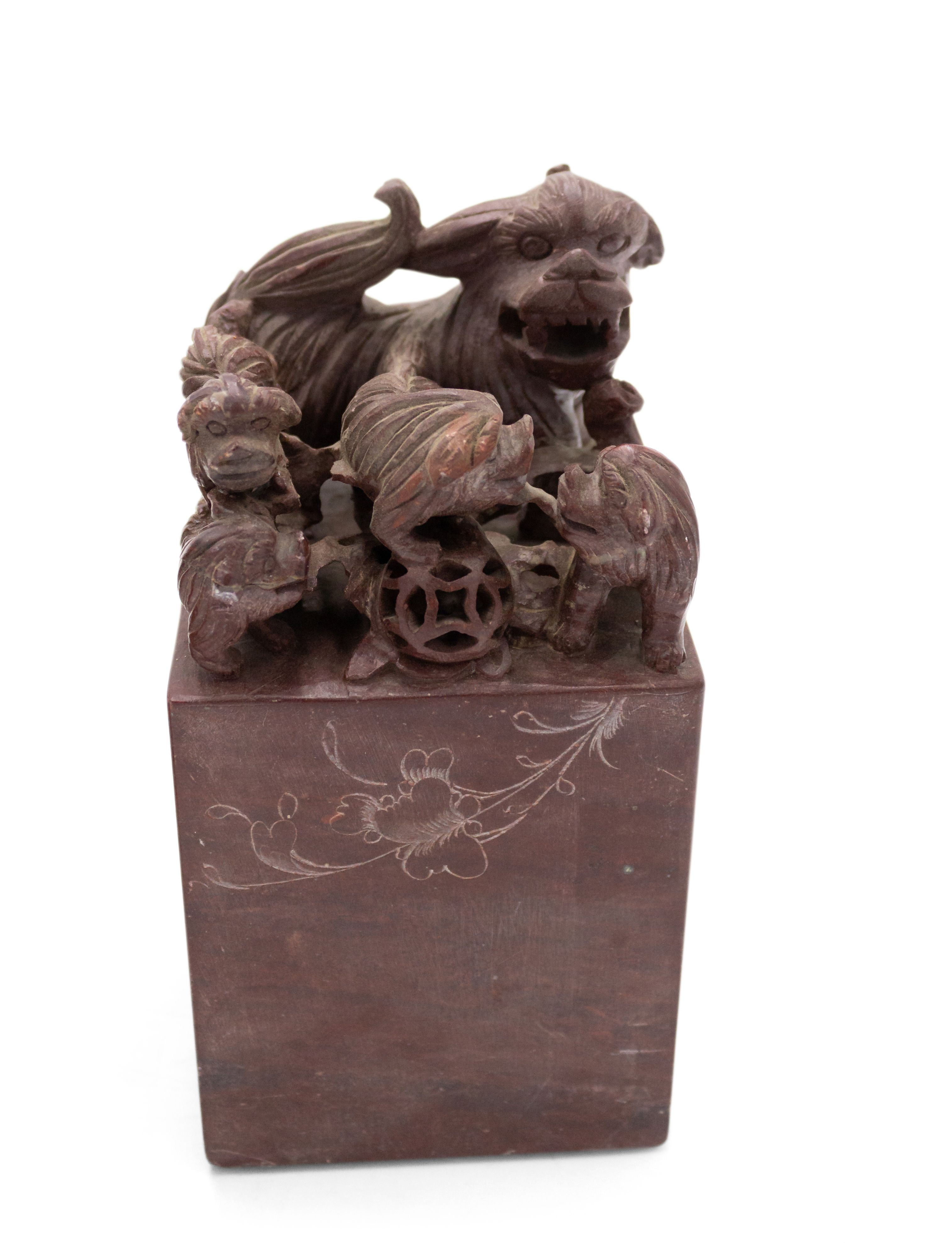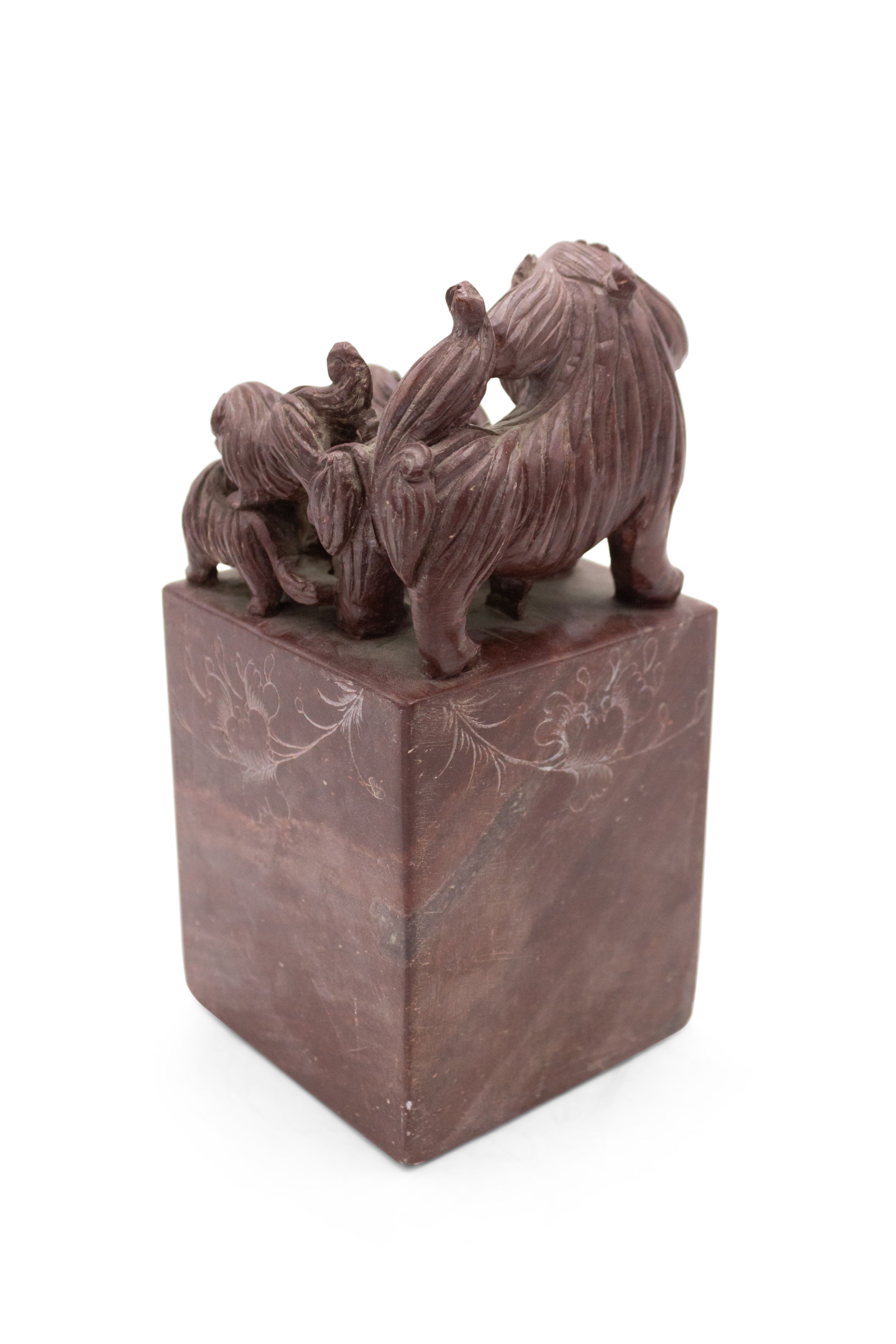 PAIR of Asian Chinese-style (19/20th Century) carved brown stone bookends depicting a group of dogs over a lightly engraved base. (PRICED AS PAIR)