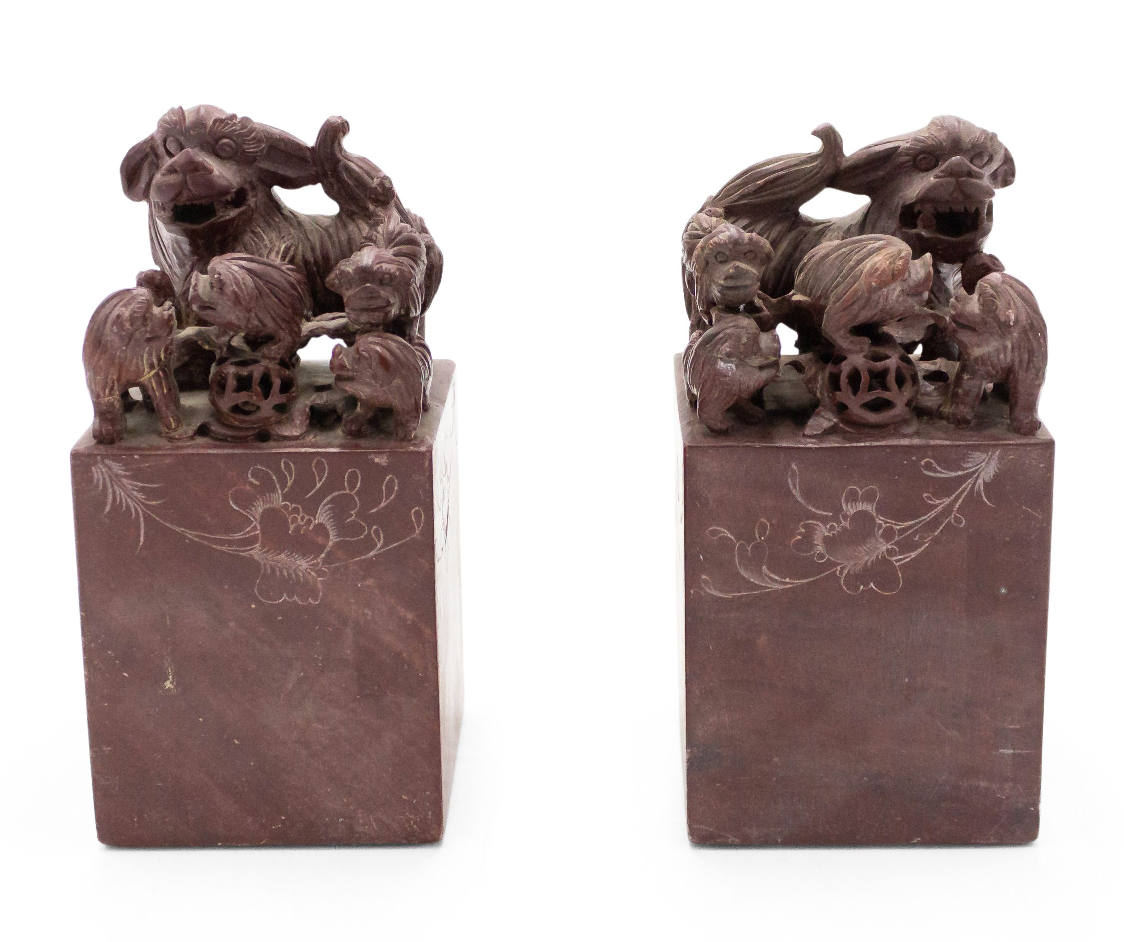 PAIR of Asian Chinese-style (19/20th Century) carved brown stone bookends depicting a group of dogs over a lightly engraved base. (PRICED AS PAIR).