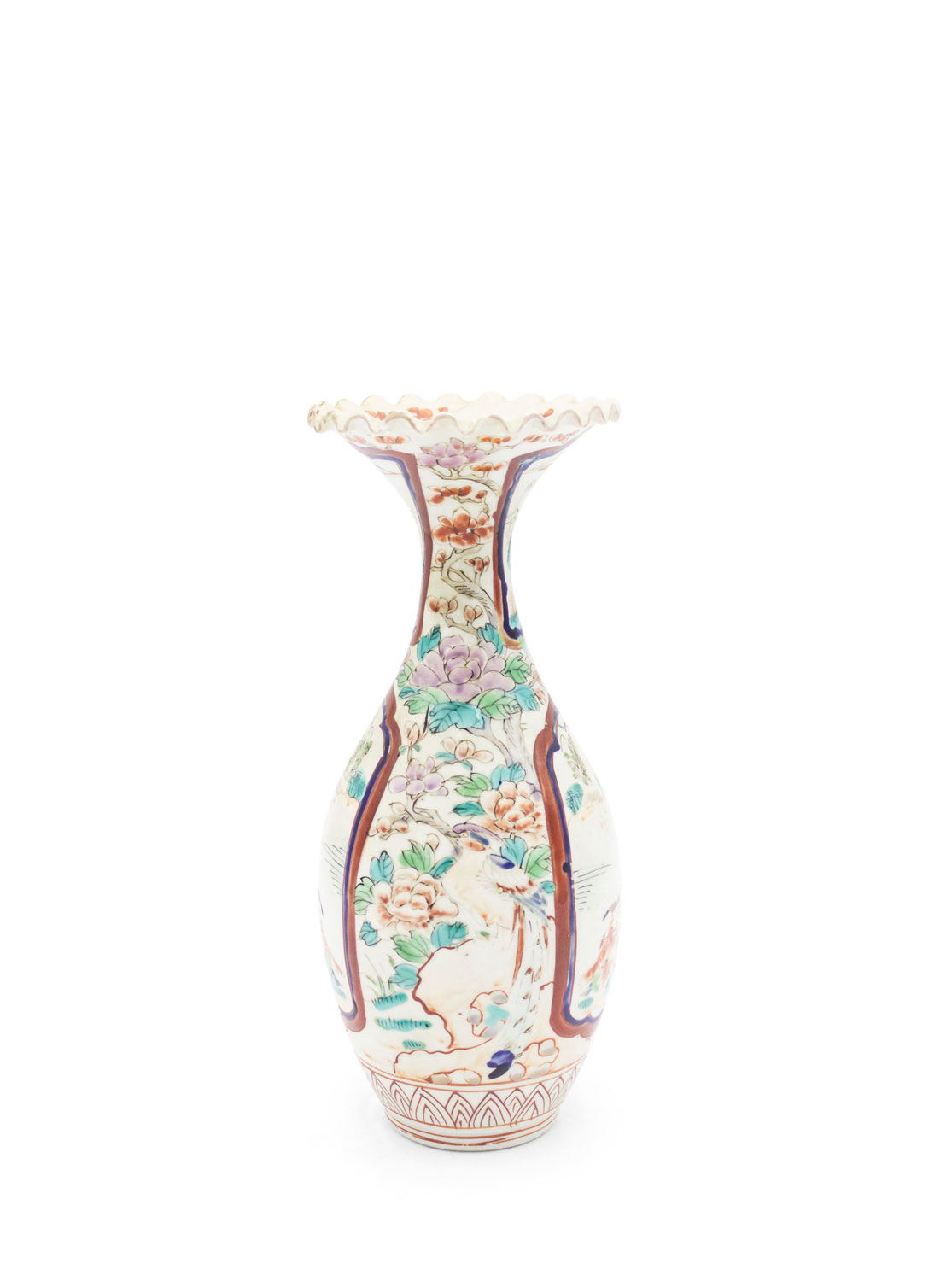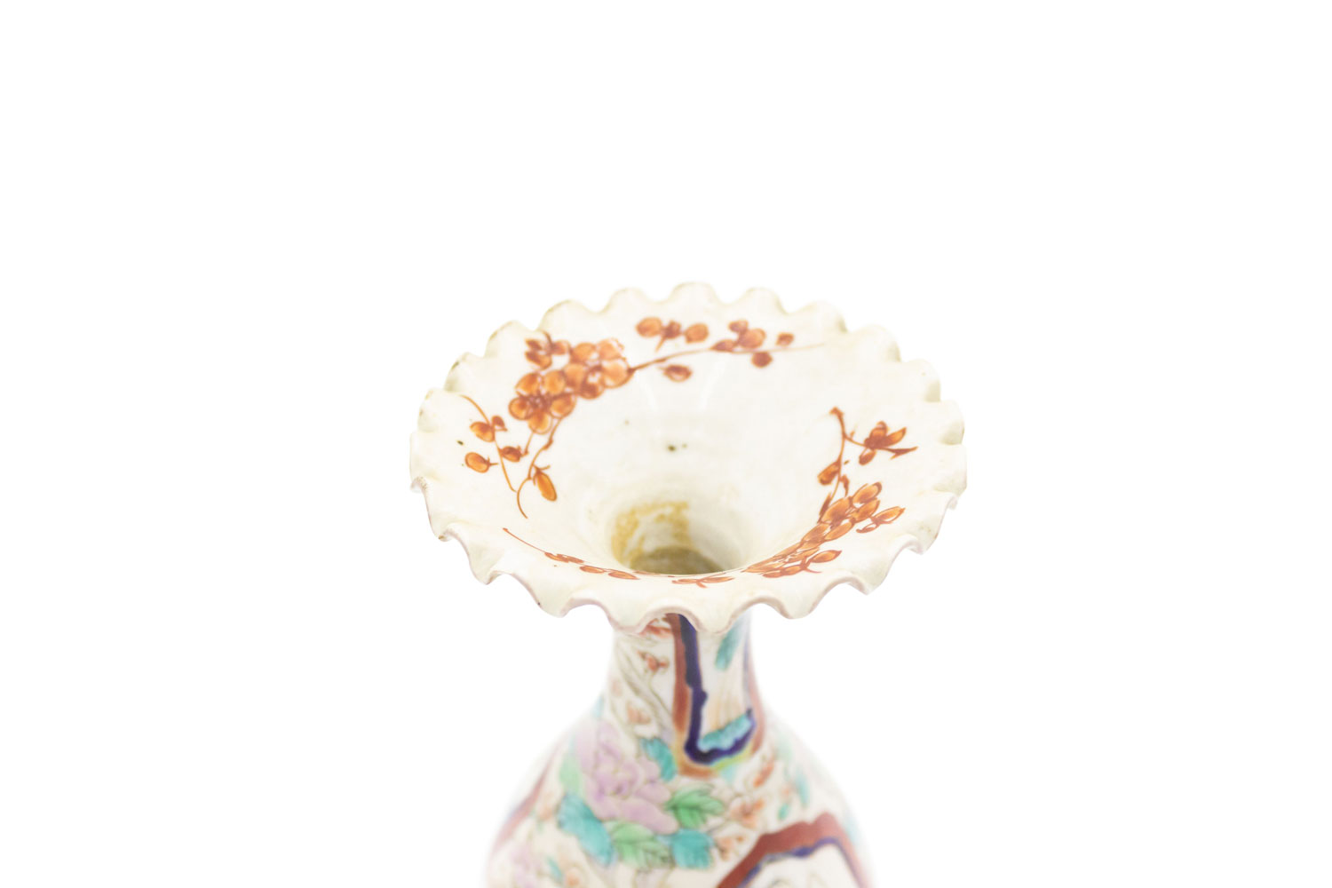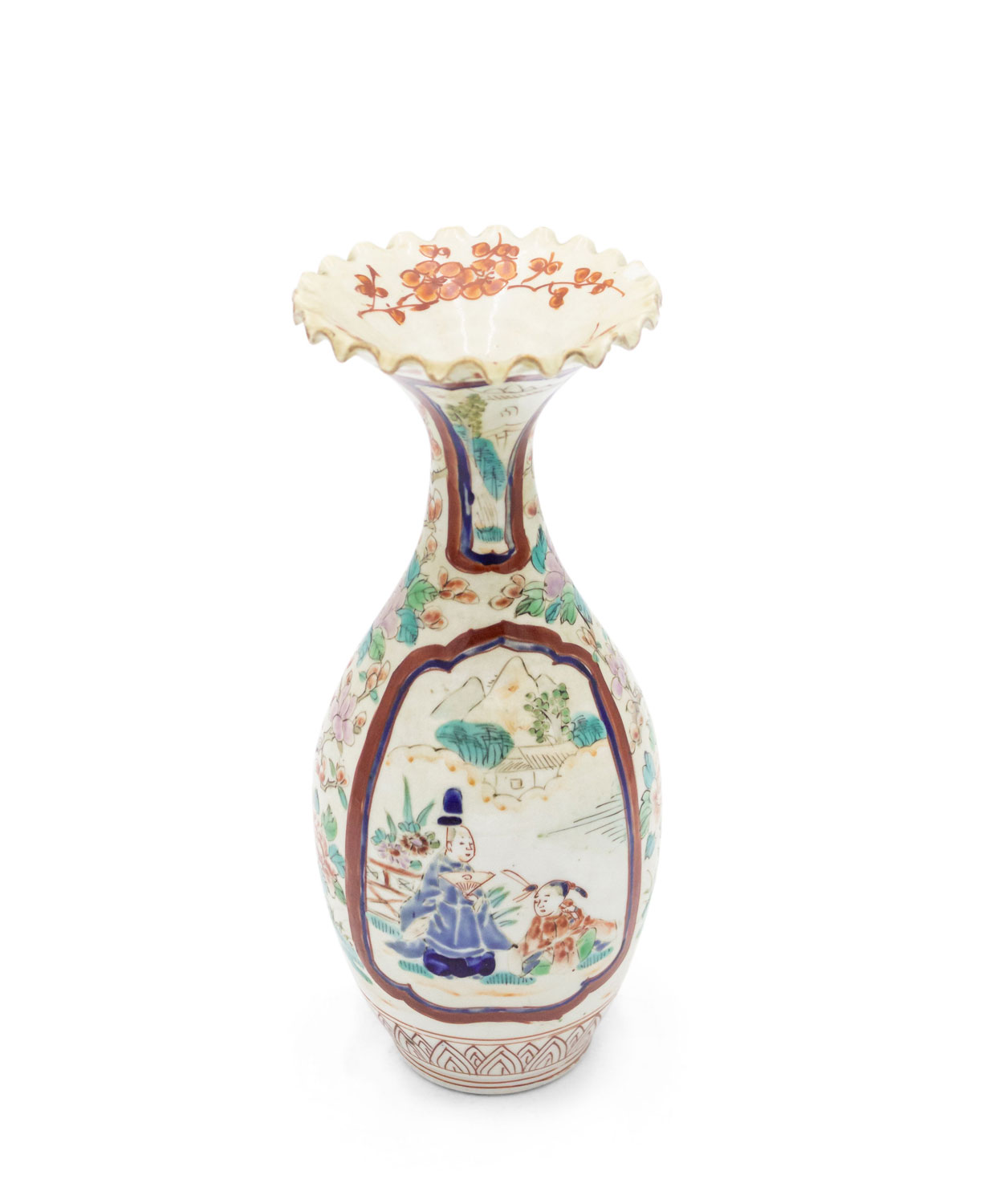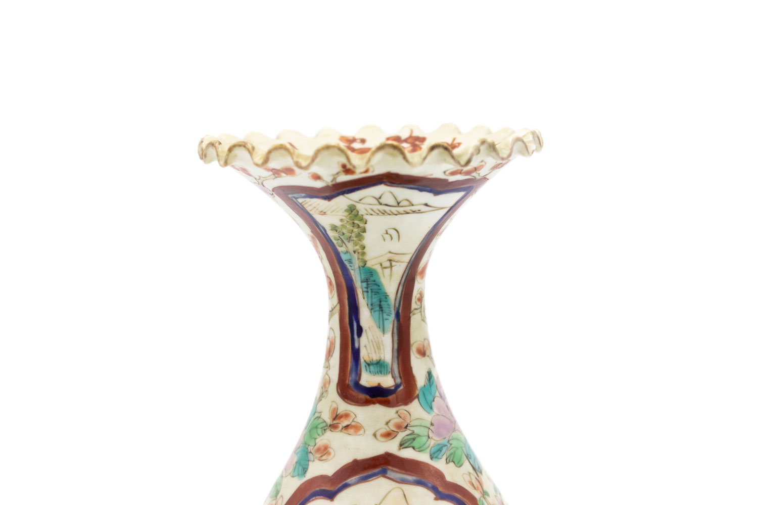 PAIR of Asian Chinese Imari (18th Cent) porcelain small vases with a scalloped top and scenes of figures and flowers. (Small chip to 1 top) (PRICED AS PAIR)