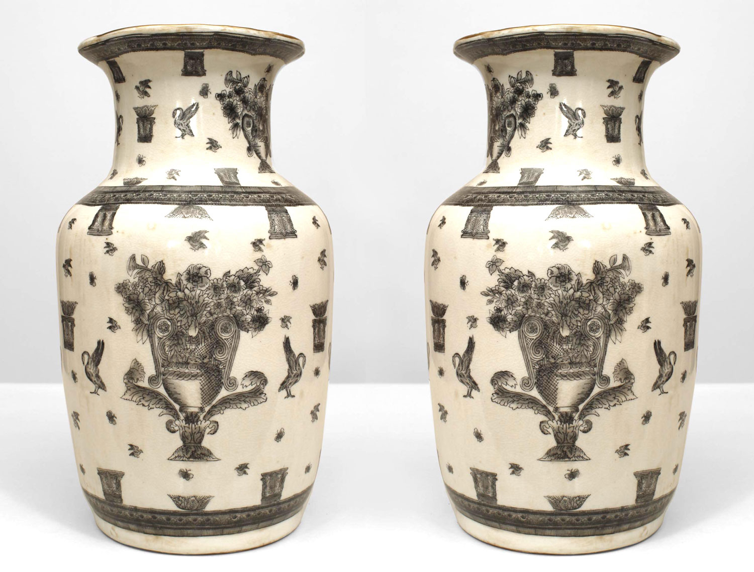 PAIR of Asian Chinese style (19th Cent) white and black decorated vases with large urns filled with flowers along with birds and butterflies. 1 AS IS-repaired (PRICED AS PAIR).