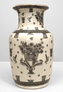 PAIR of Asian Chinese style (19th Cent) white and black decorated vases with large urns filled with flowers along with birds and butterflies. 1 AS IS-repaired (PRICED AS PAIR)