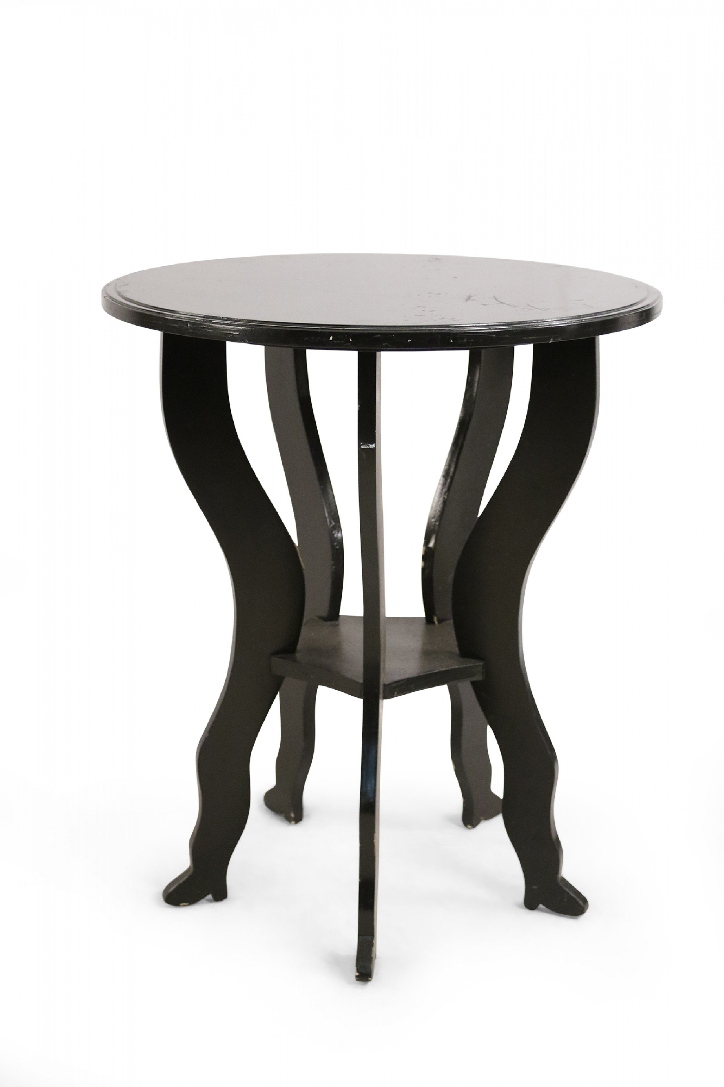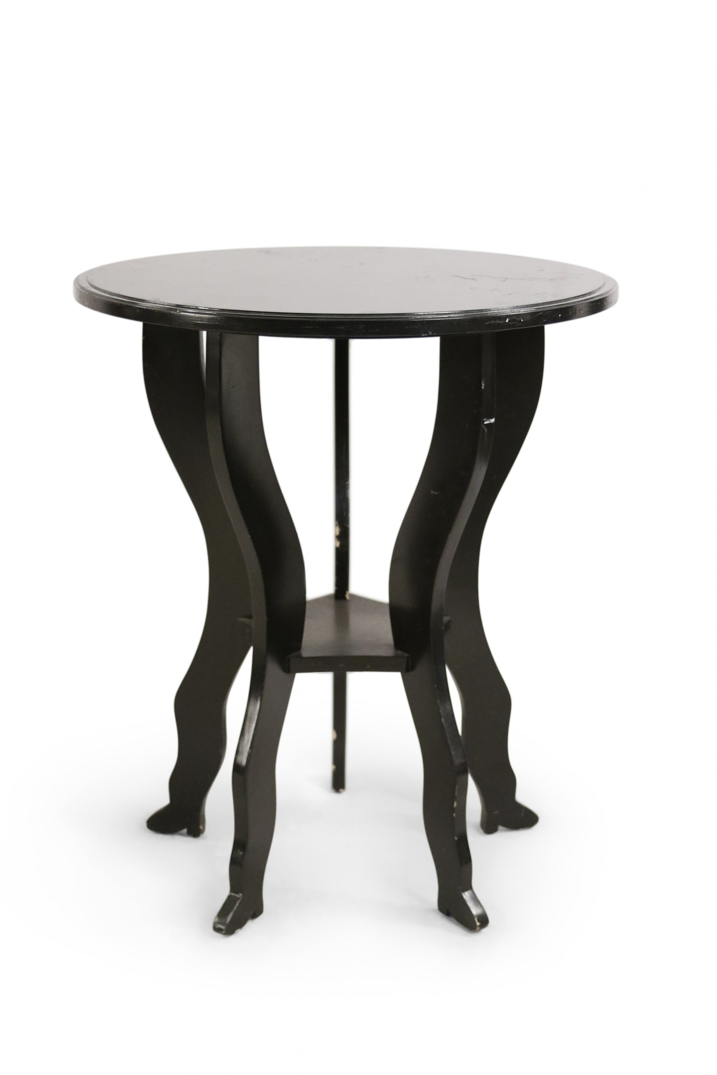 PAIR of Contemporary wooden end tables with a brown painted finish with a circular top and five shaped legs with a lower 5-sided stretcher shelf. (PRICED AS PAIR) (Similar table: NWL0612)