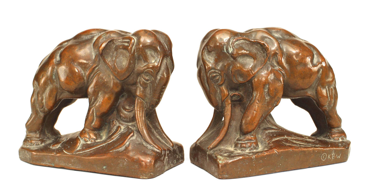 PAIR of Continental (possibly Austrian - 20th Century) bronze-patinated copper bookends in the form of elephants. (PRICED AS PAIR)