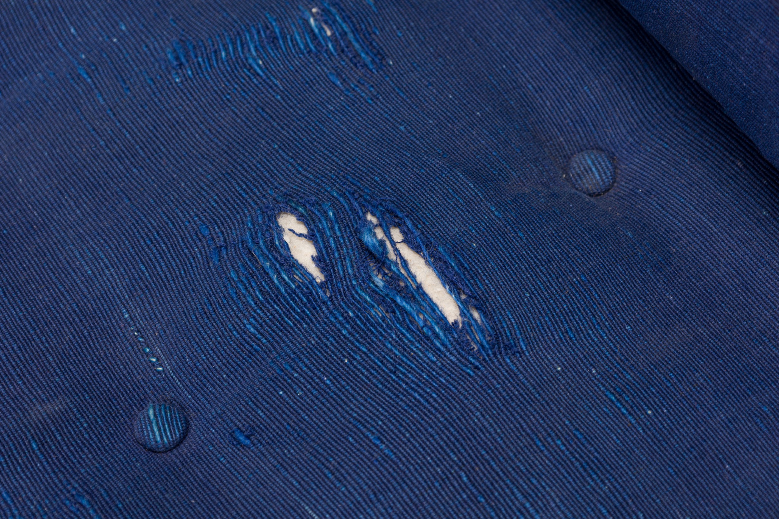 Style: Mid-Century Materials & Techniques: Fabric, tufted, upholstered, walnut, wood Category: Seating Condition: Tears in upholstery. One chair's upholstery is open across the top rail along the seam. Fair; Minor structural damages