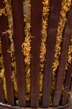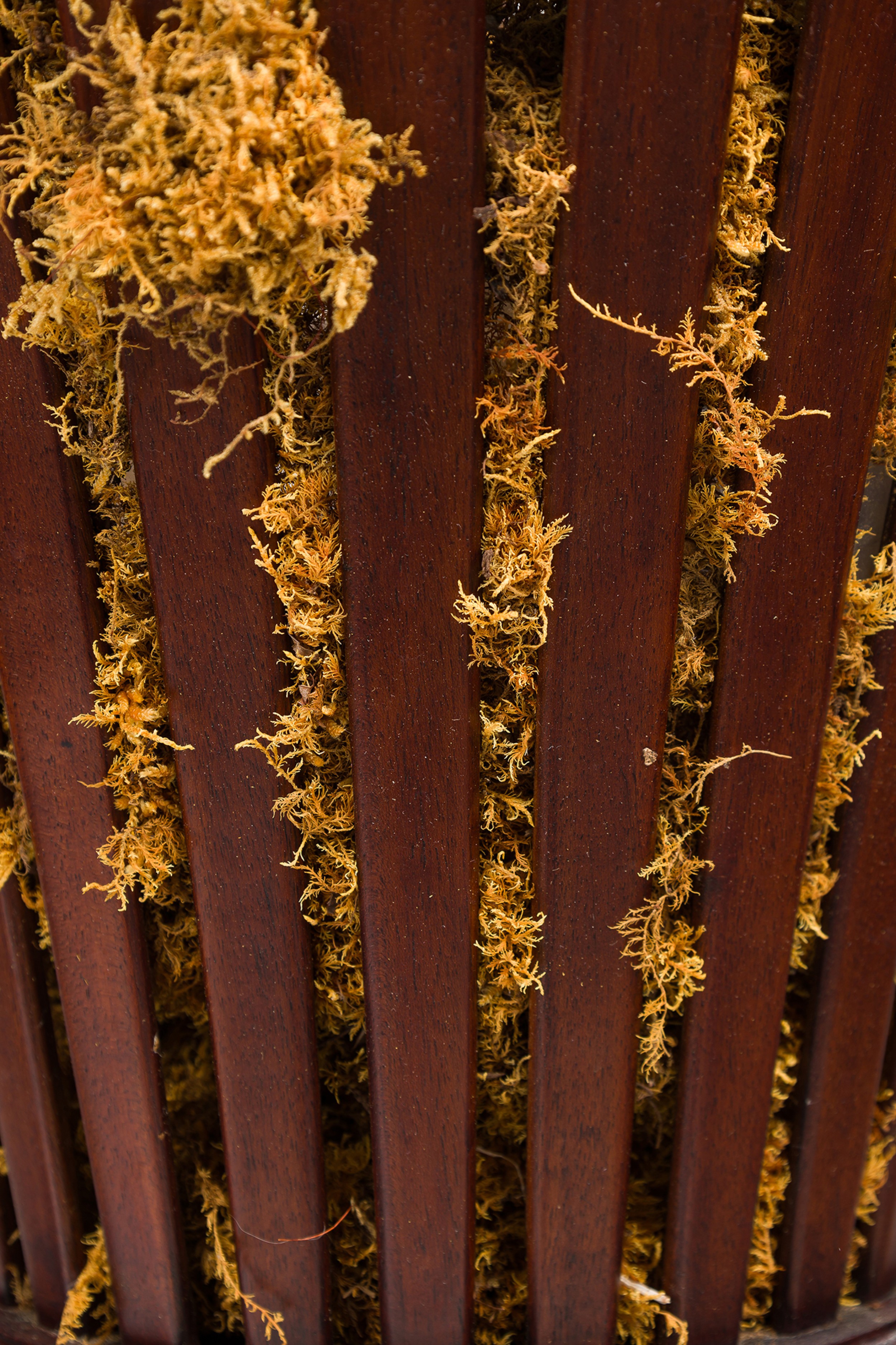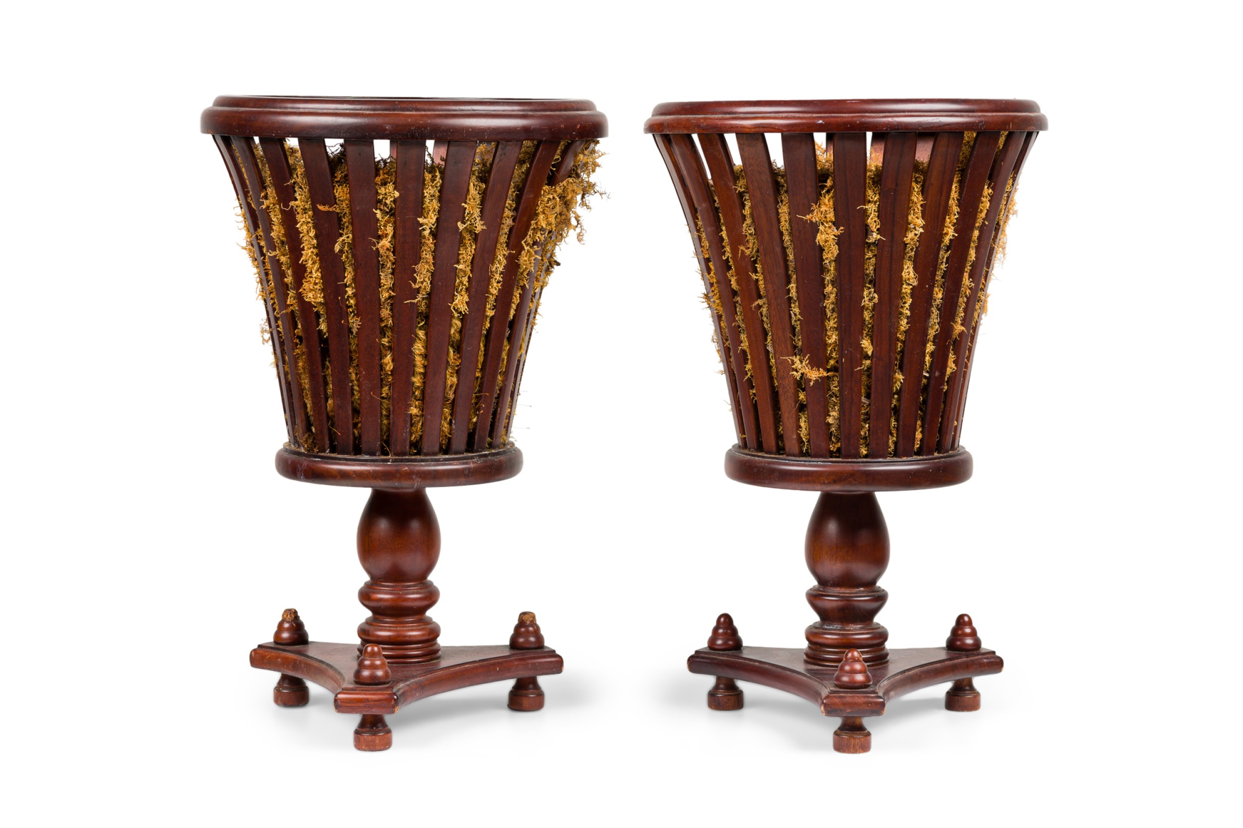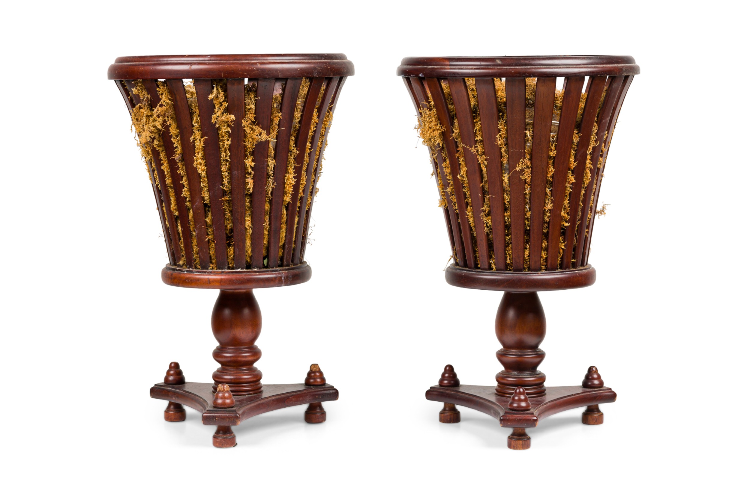 PAIR of English Regency style (20th Century) slatted mahogany jardinieres / planters supported by pedastal bases with classic columns and three feet (PRICED AS PAIR) (some damages to the slats)