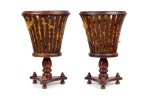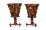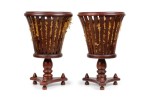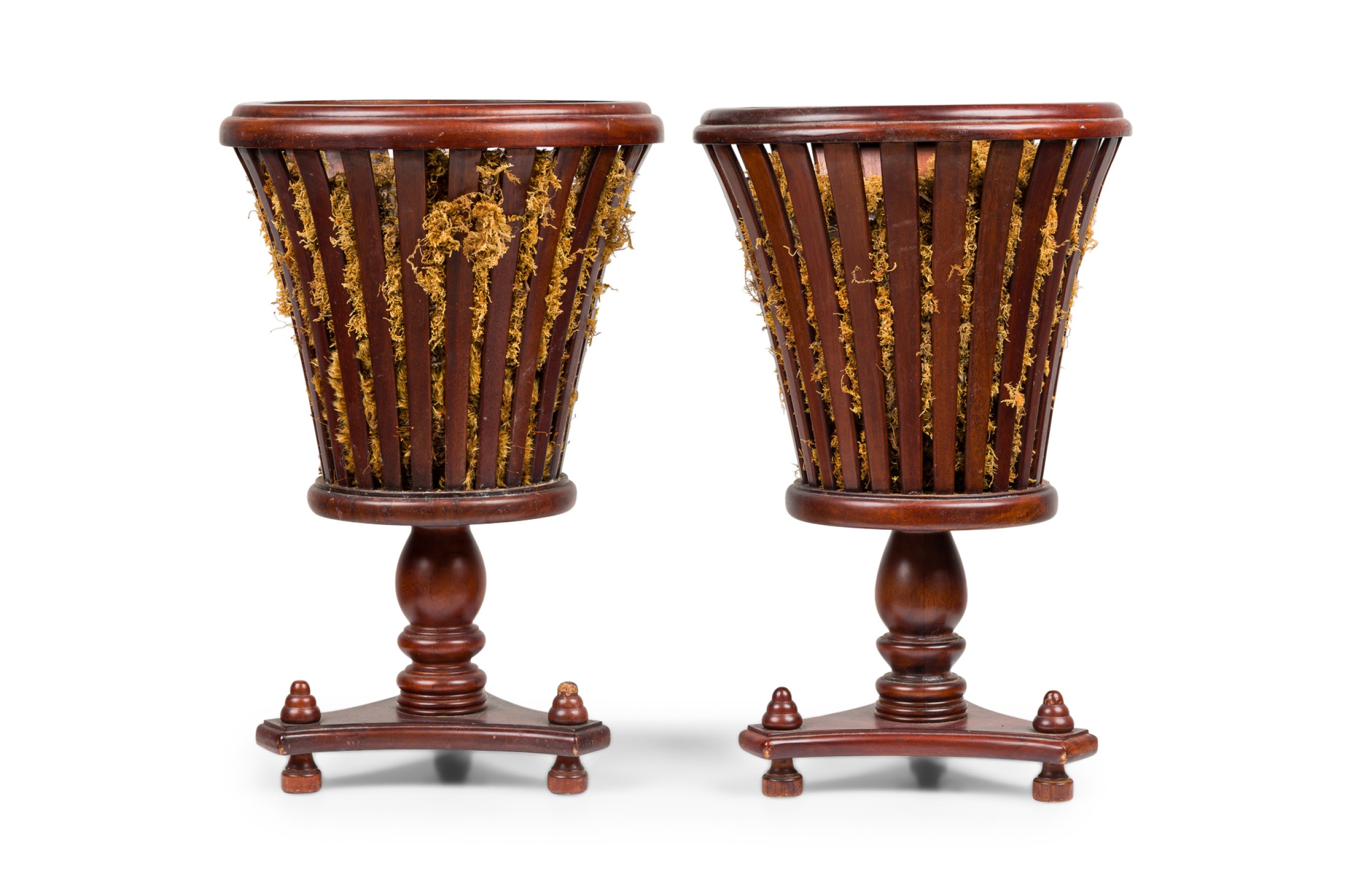 PAIR of English Regency style (20th Century) slatted mahogany jardinieres / planters supported by pedastal bases with classic columns and three feet (PRICED AS PAIR) (some damages to the slats).