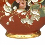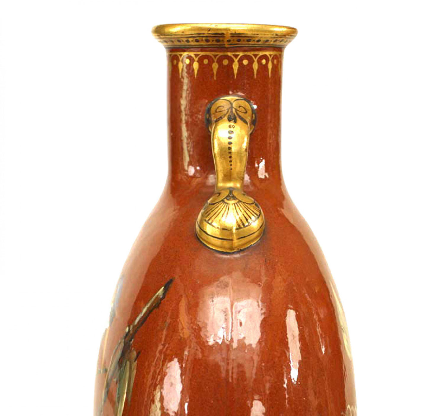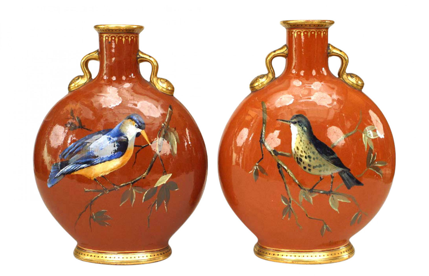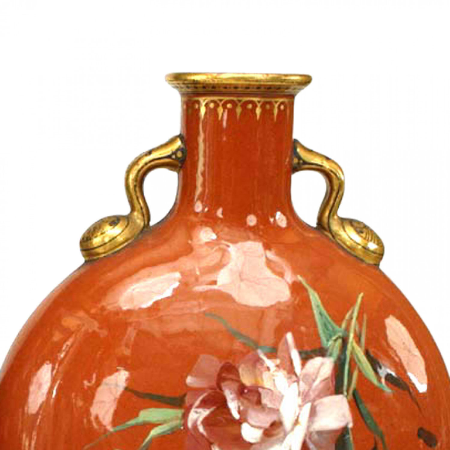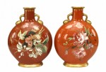 PAIR of English Victorian style rust ground porcelain Pilgrim flask vases with gilt accents & painted with birds & floral clasps (Minton, 1948) (PRICED AS PAIR)