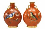 PAIR of English Victorian style rust ground porcelain Pilgrim flask vases with gilt accents & painted with birds & floral clasps (Minton, 1948) (PRICED AS PAIR).