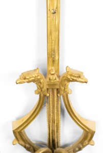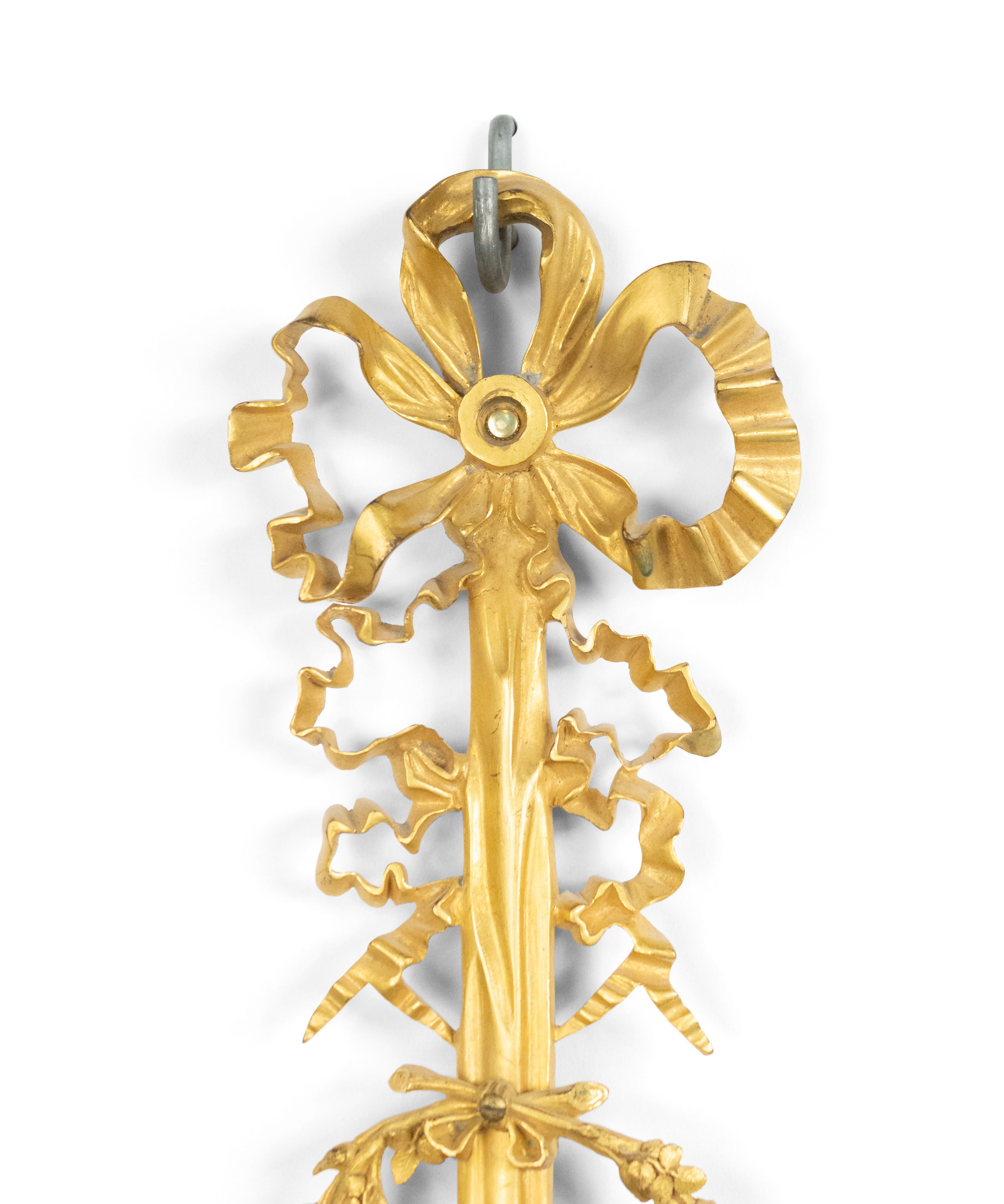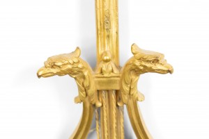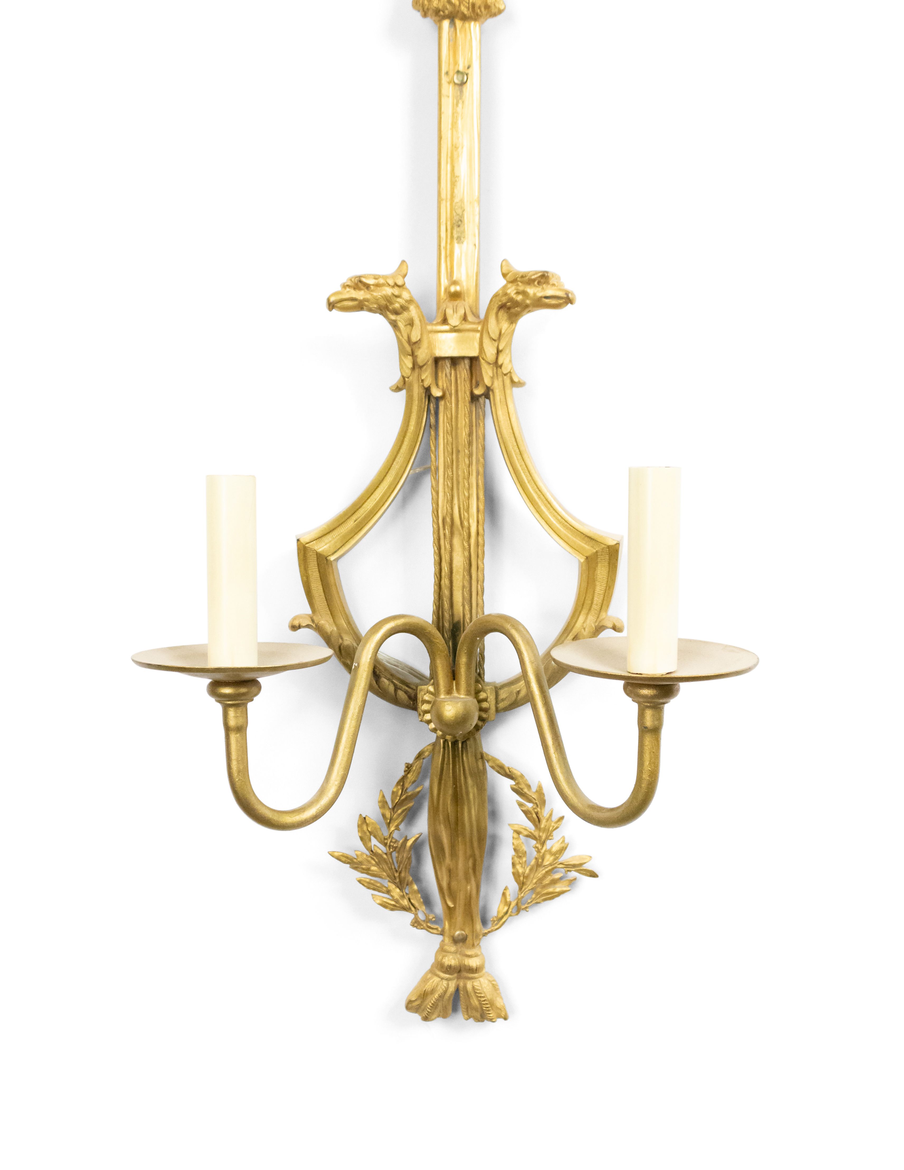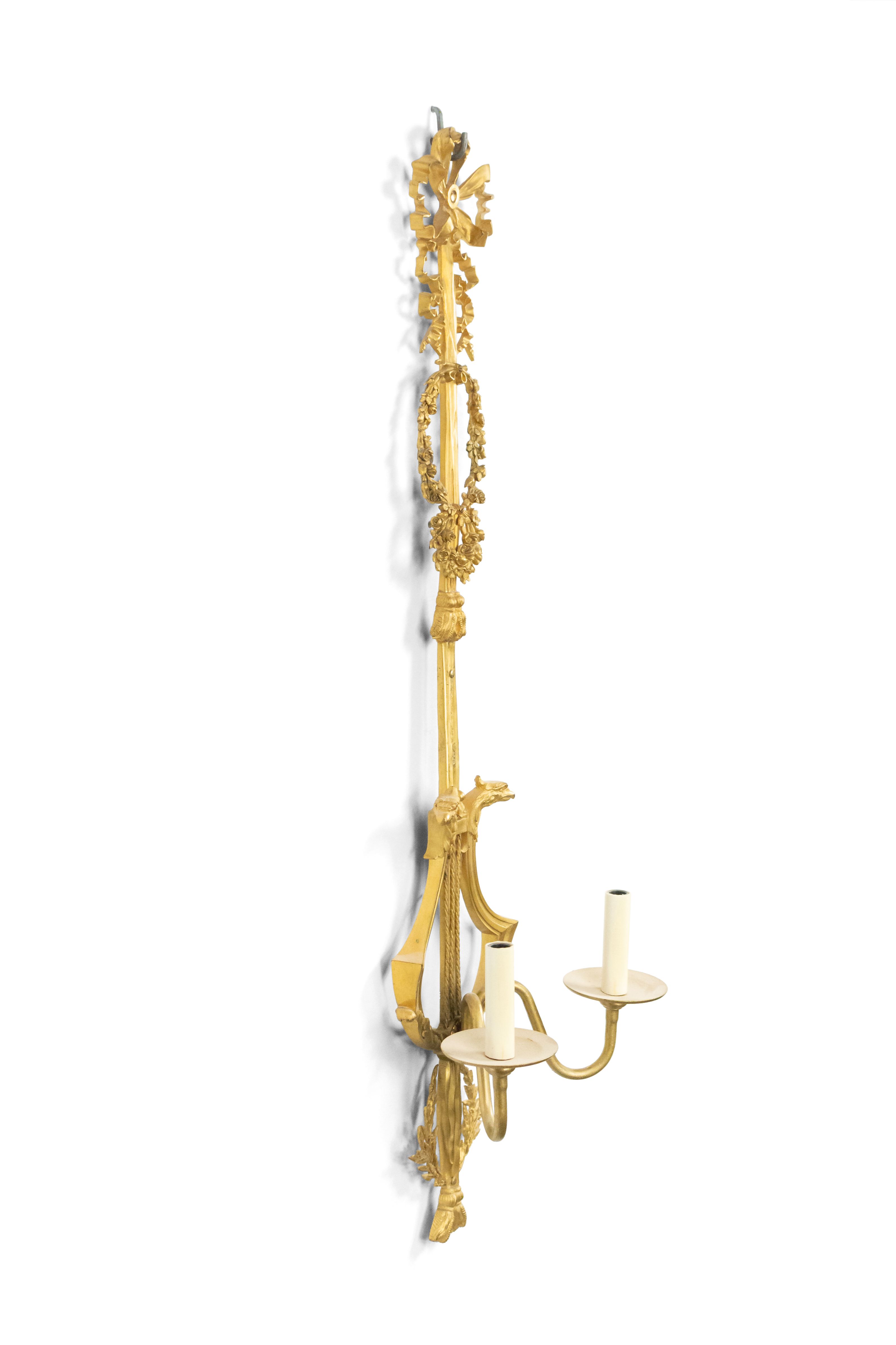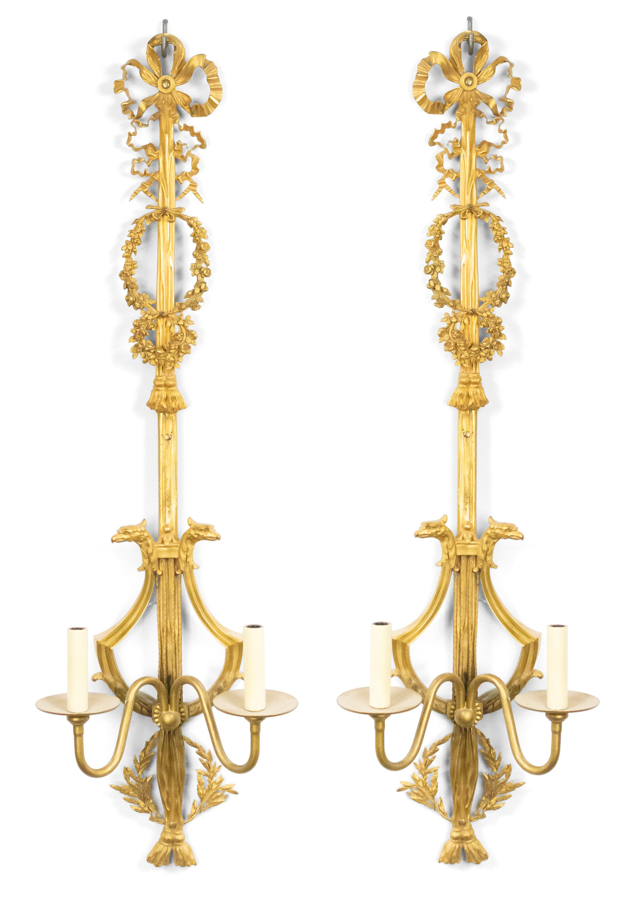 PAIR of French Louis XVI-Style (19th Century) 2 arm gilt bronze wall sconces with a bow knot top over a wreath design followed by an eagle head lyre with a tassel bottom. (PRICED AS PAIR)