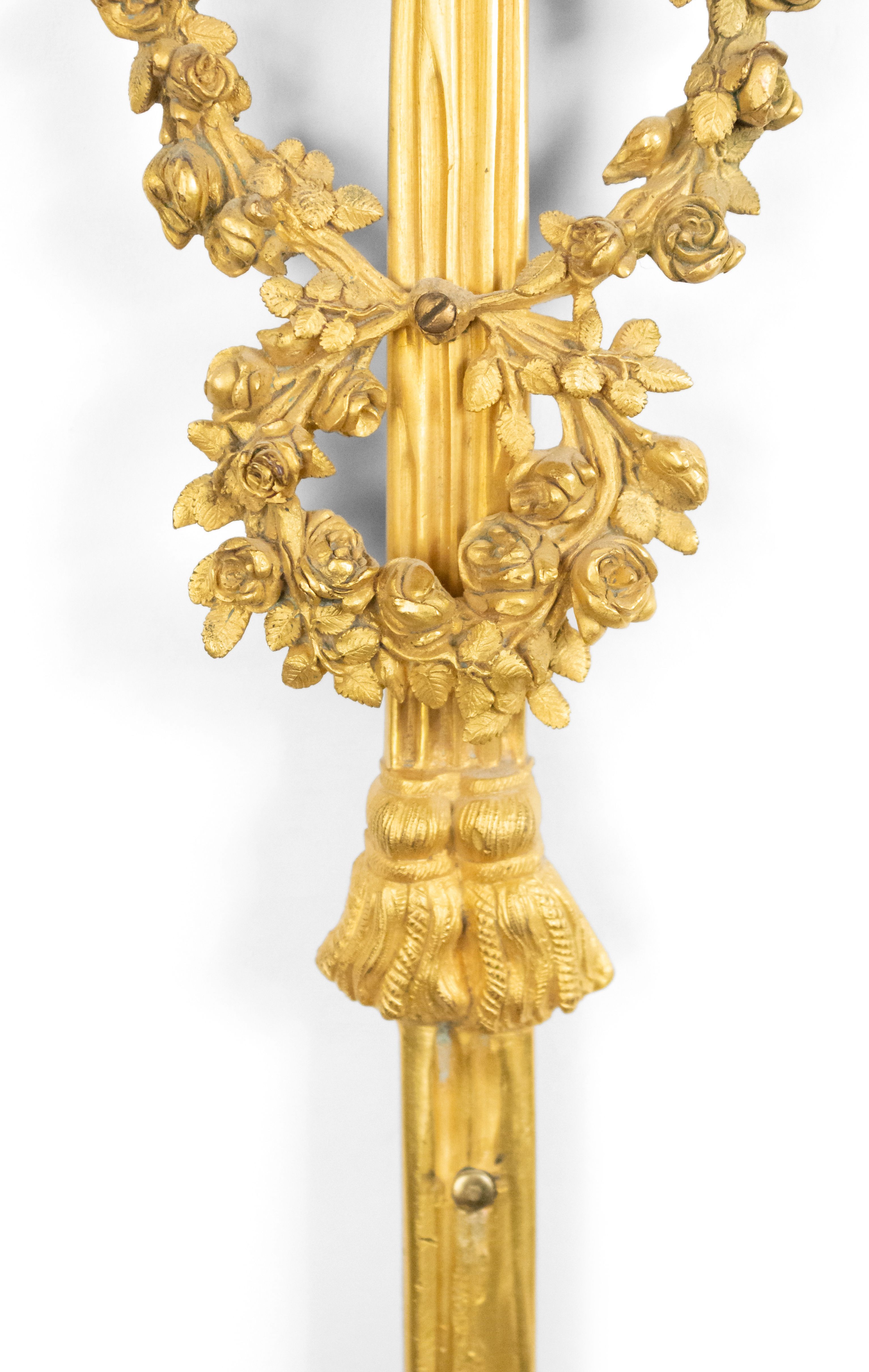 PAIR of French Louis XVI-Style (19th Century) 2 arm gilt bronze wall sconces with a bow knot top over a wreath design followed by an eagle head lyre with a tassel bottom. (PRICED AS PAIR).