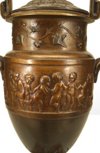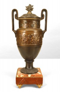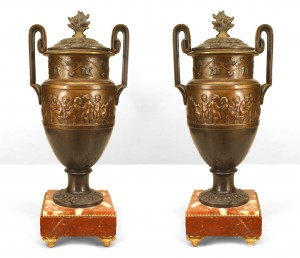 PAIR of French Victorian style bronze patinaed metal urns with handles and Neo-classical figures in relief with a cover having a flame finial all on a rouge marble base (PRICED AS PAIR)