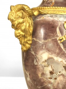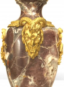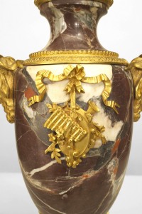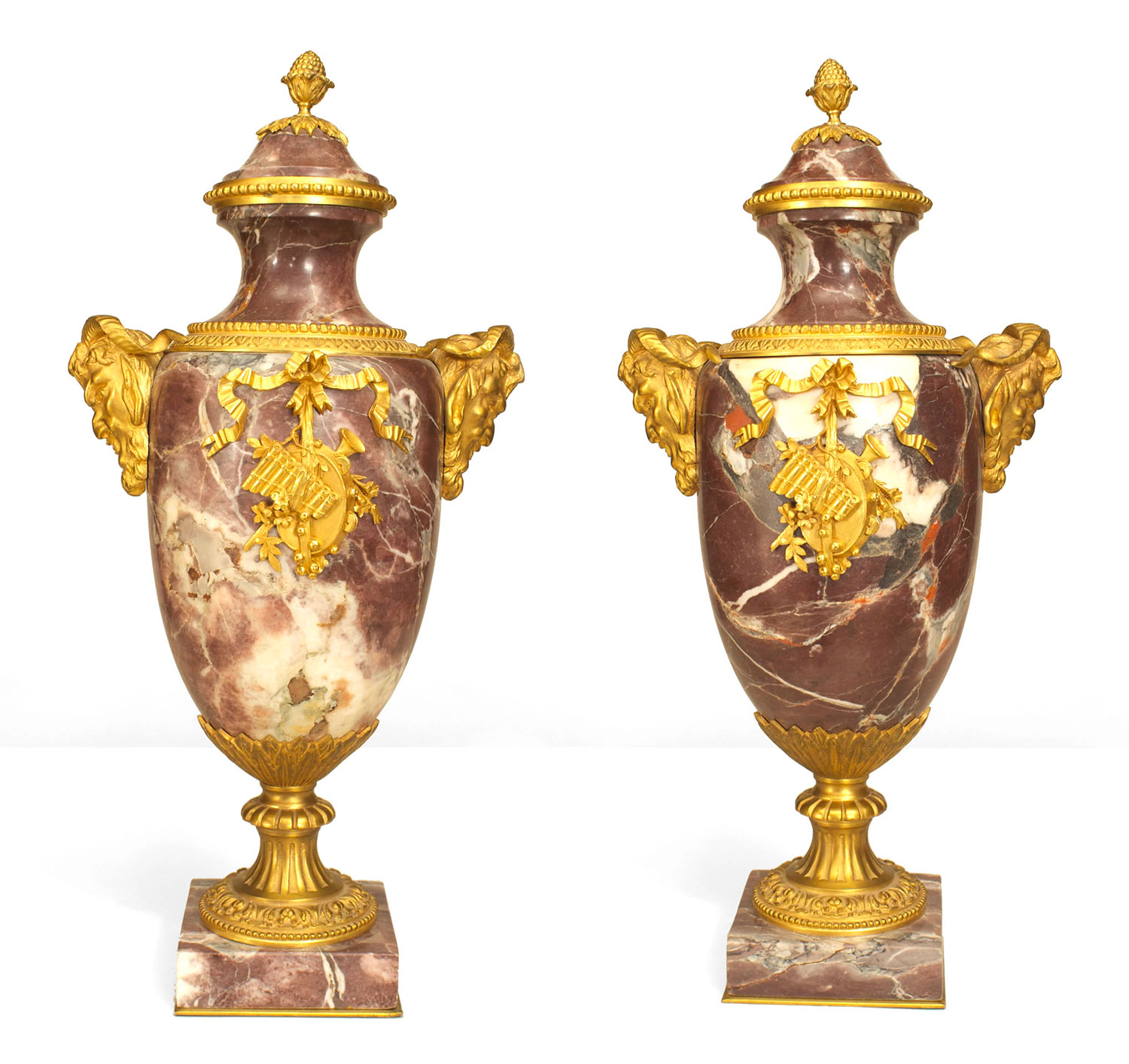 PAIR of French Victorian Neoclassical style rosso levanto marble urns with gilt bronze ram head sides and acorn finial top with musical relief trim supported on a square base. (PRICED AS PAIR)