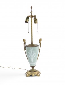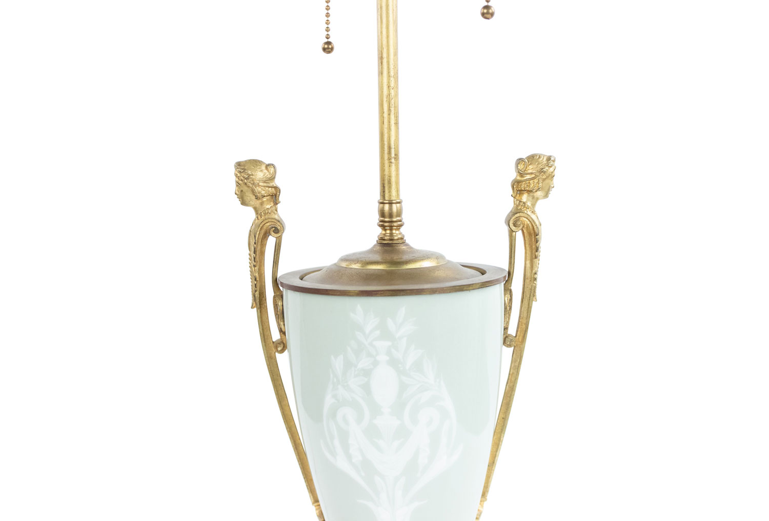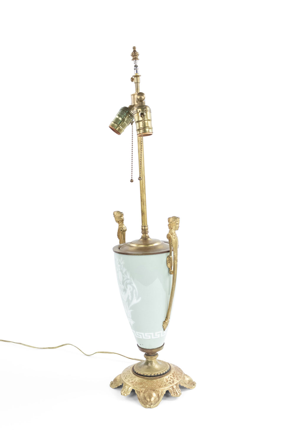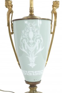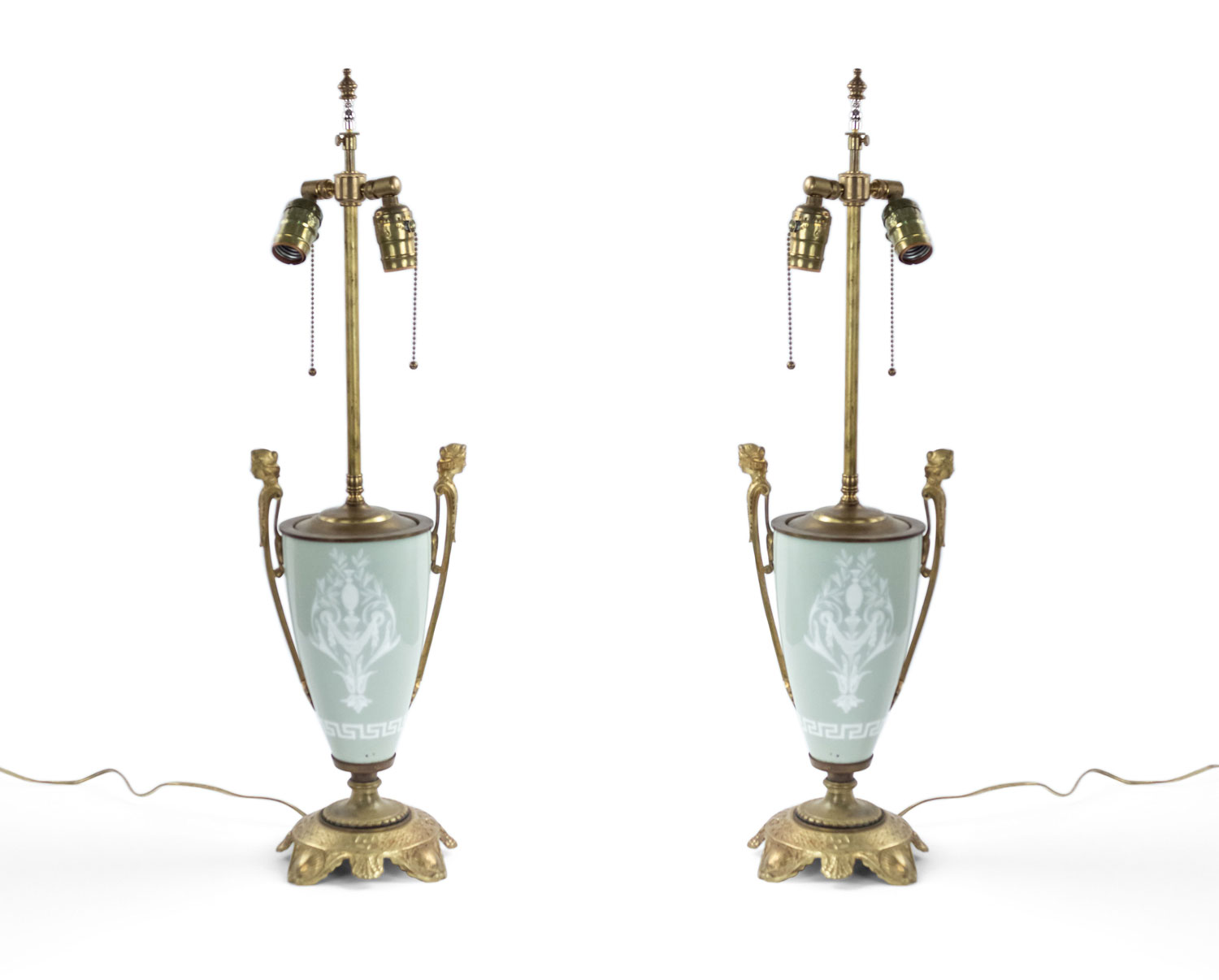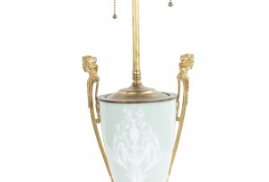 PAIR of French Victorian green and white pâte-sur-pâte porcelain urn shaped table lamps with bronze handles with heads and shaped base (PRICED AS PAIR).