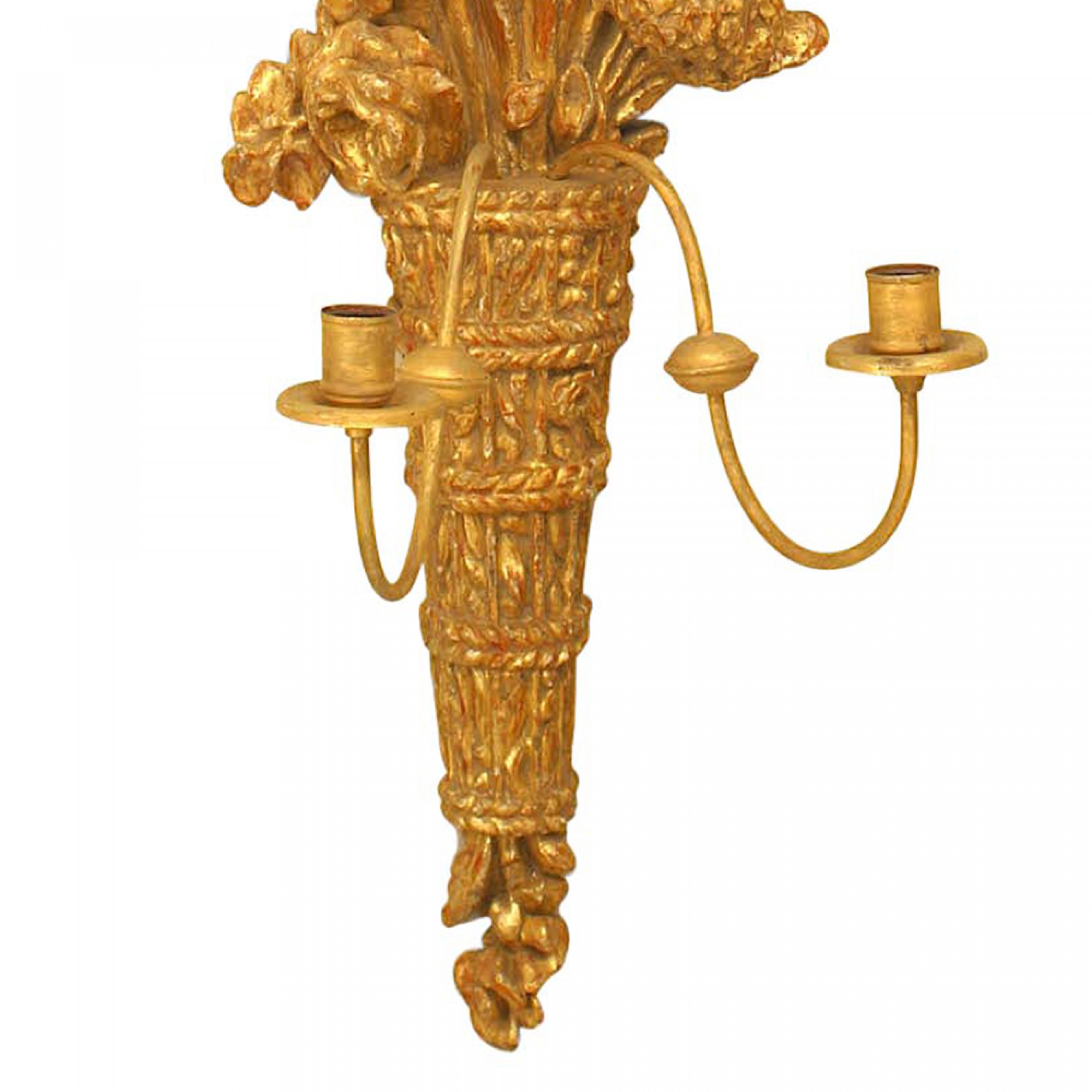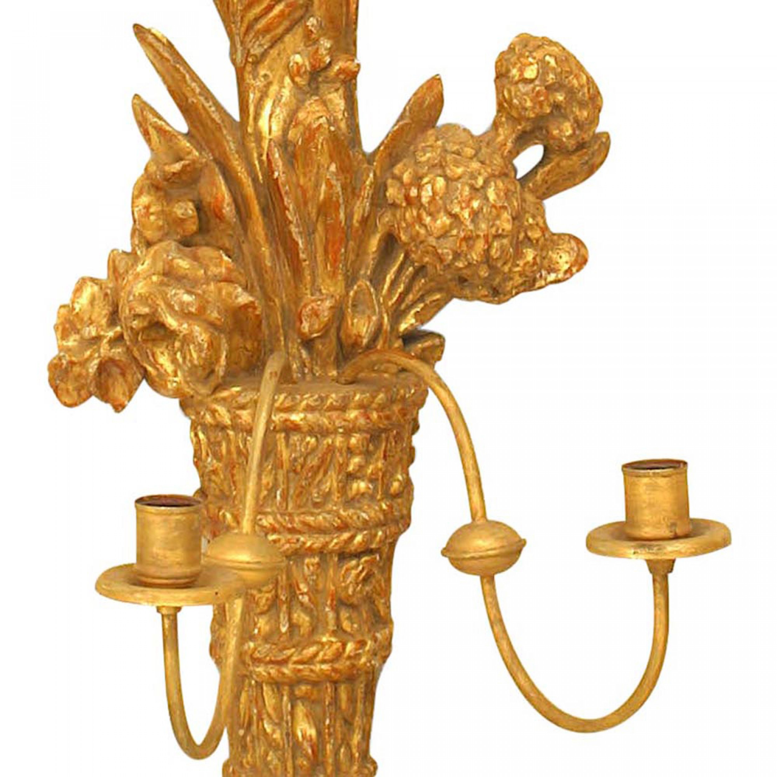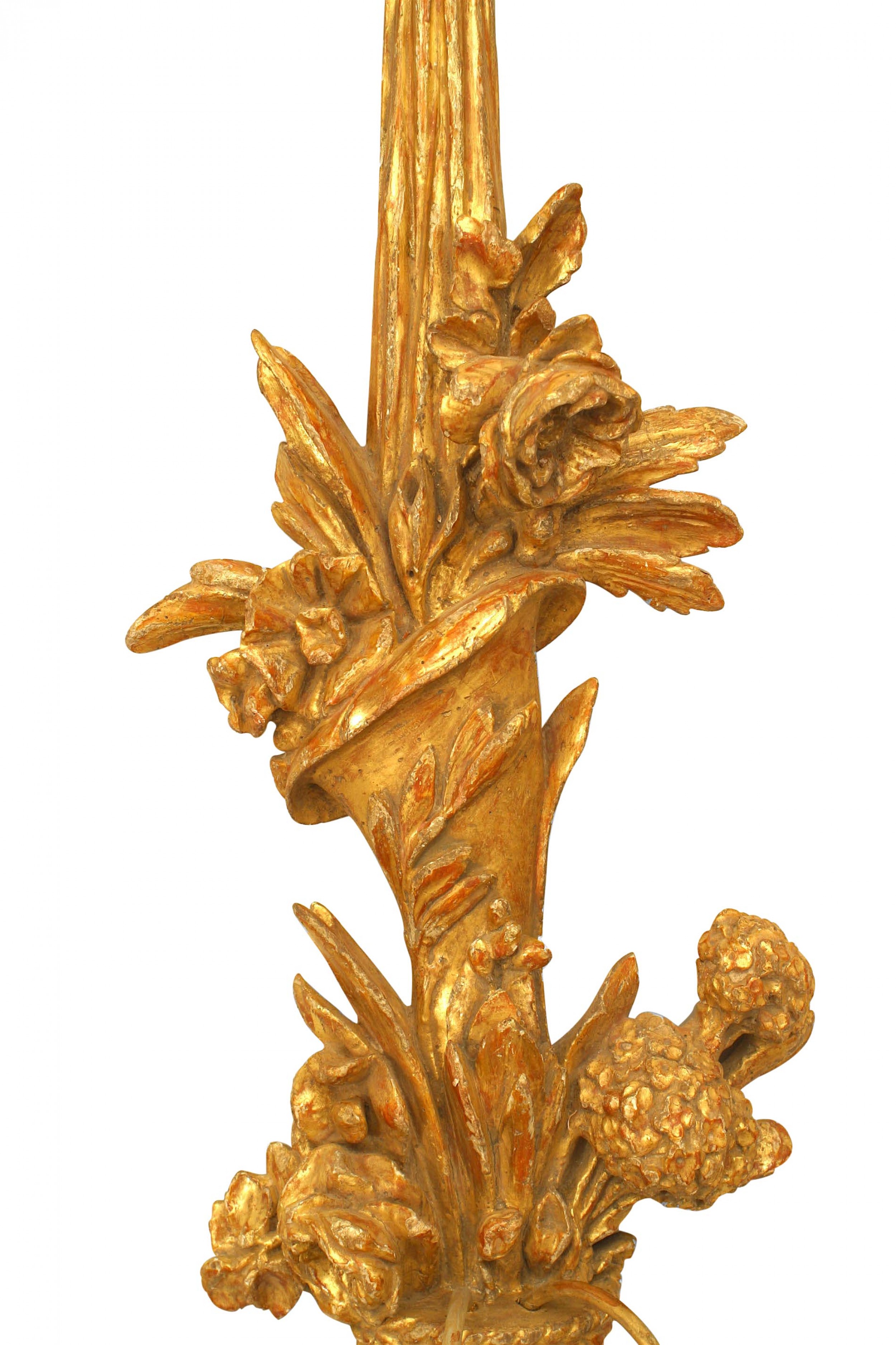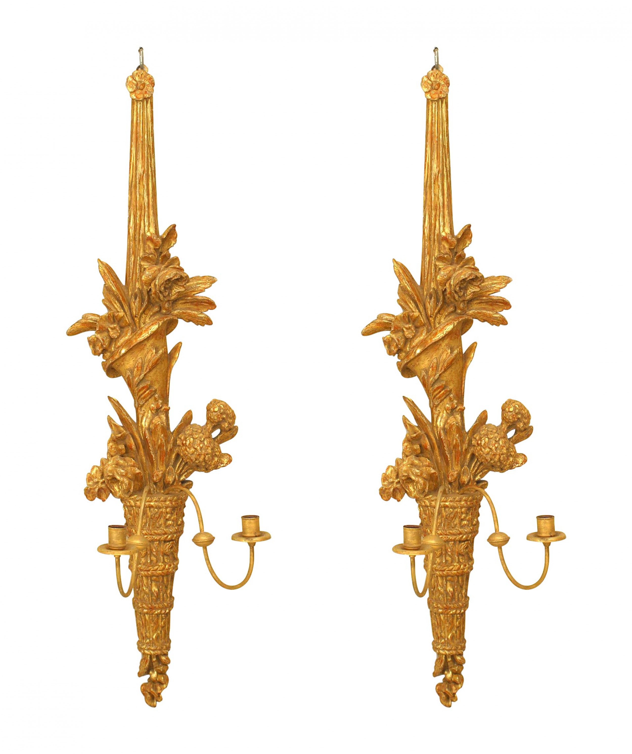 PAIR of Italian Neo-Classic-Style (19th Century) gilt wood 2 arm wall sconces carved with a cornucopia and floral motif. (PRICED AS PAIR)