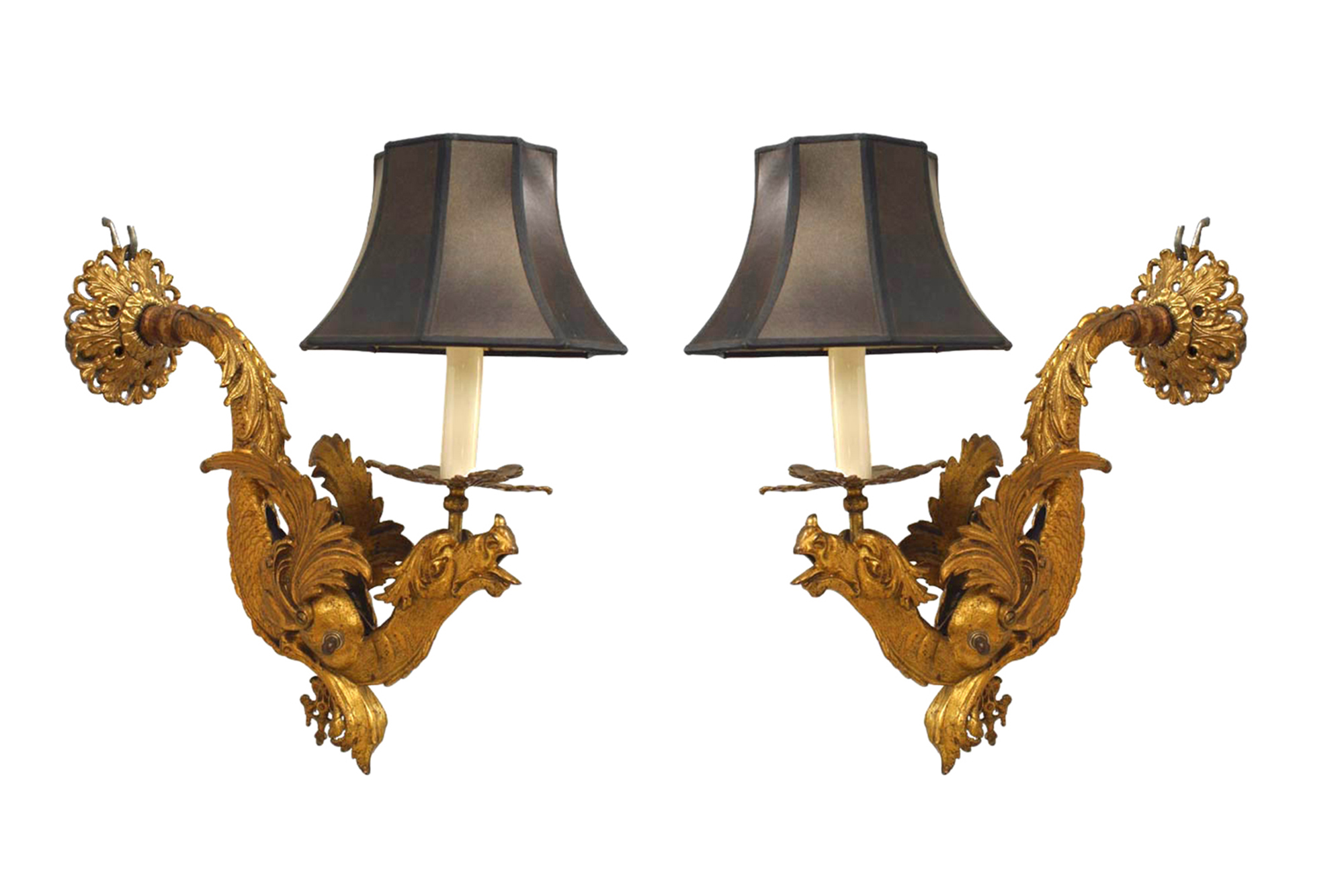 PAIR of Italian Renaissance-Style (19th/20th Century) gilt metal wall sconces with winged griffin form with new 8 sided shade (originally for gas) (PRICED AS PAIR).