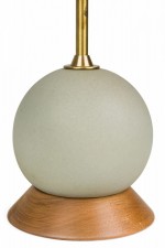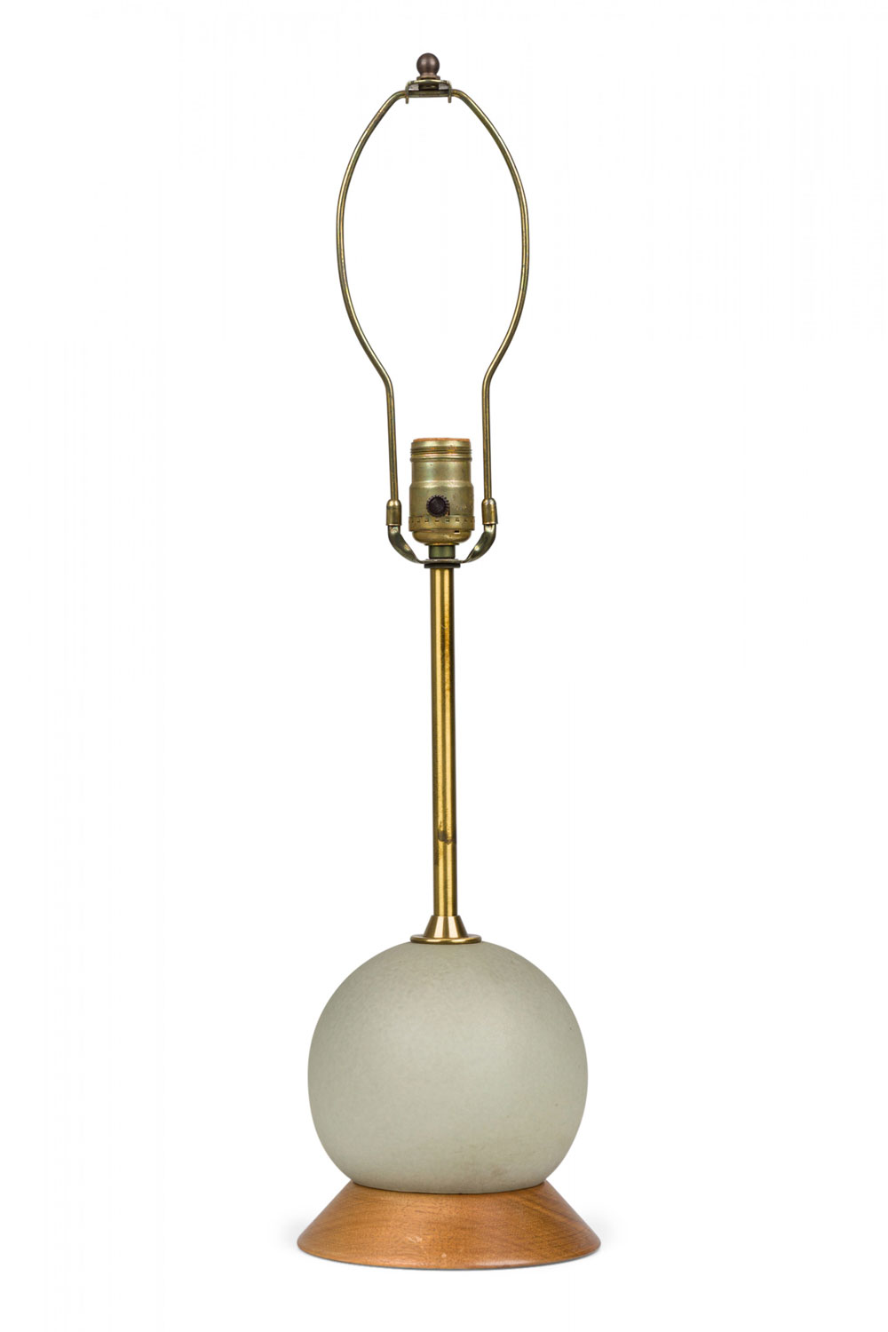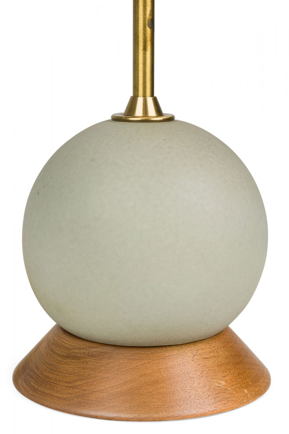 PAIR of Mid-Century American ceramic globe form table lamps with extended brass stems, finials and light switch sockets, fired in a matte robin's egg blue glaze with a subtle speckled texture, mounted on tapered circular wood bases in a smooth light veneer. (PRICED AS PAIR).