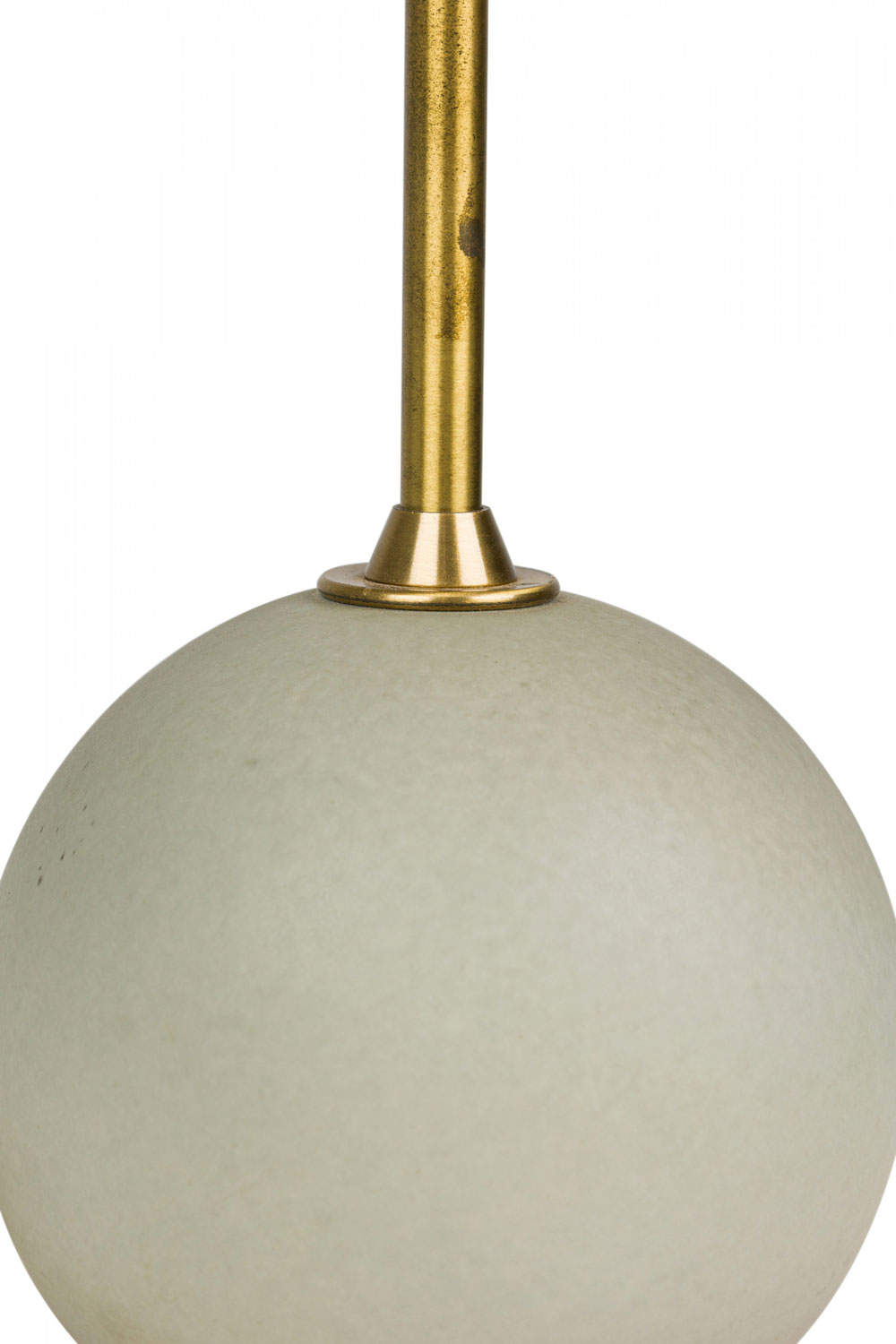 PAIR of Mid-Century American ceramic globe form table lamps with extended brass stems, finials and light switch sockets, fired in a matte robin's egg blue glaze with a subtle speckled texture, mounted on tapered circular wood bases in a smooth light veneer. (PRICED AS PAIR)