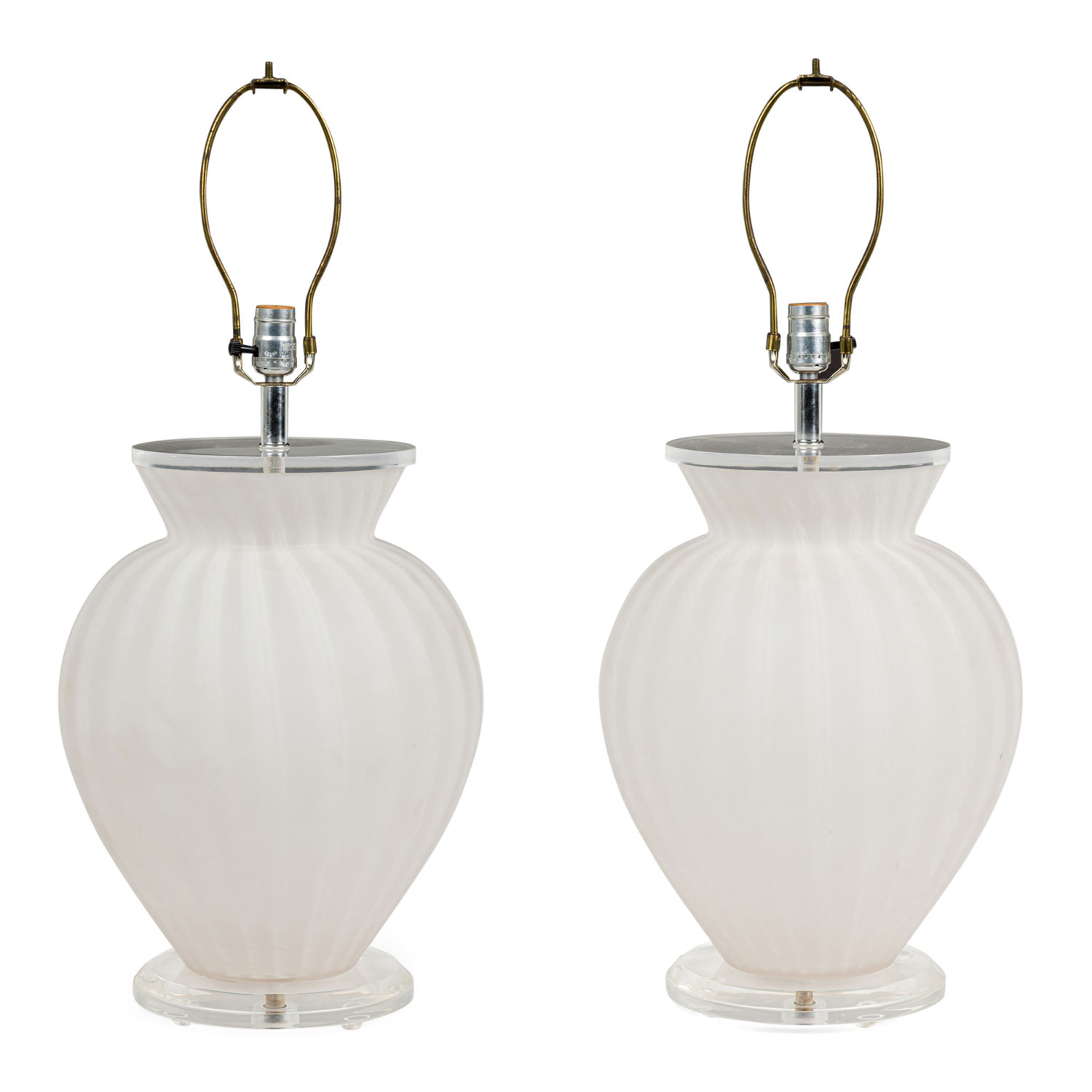 Pair of Mid-Century American White Frosted and Striped Footed Glass Table Lamps