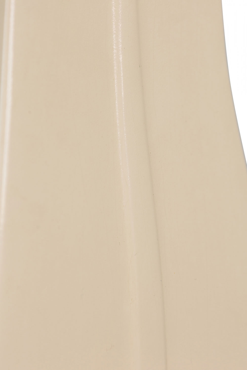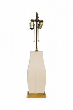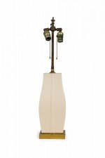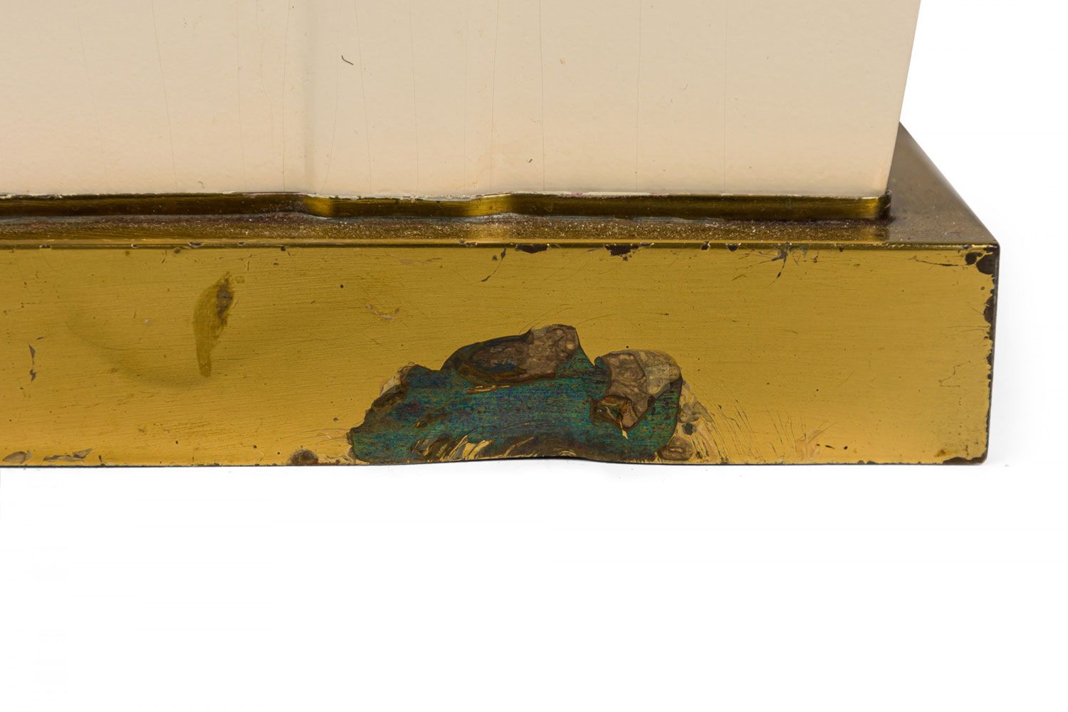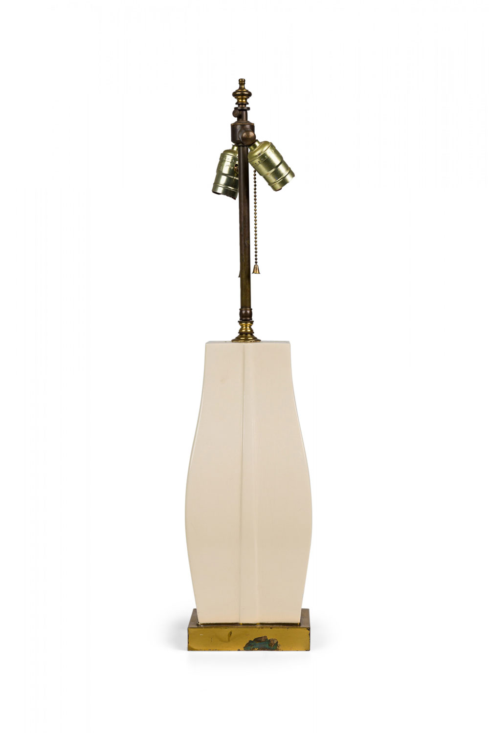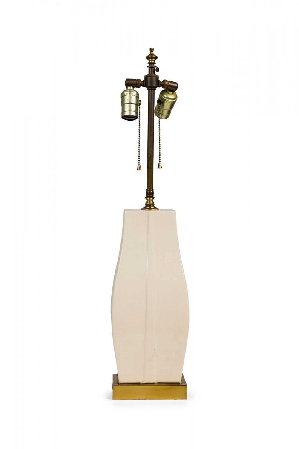 PAIR of Mid-Century American white lacquer square bombe form table lamps with finials having bodies accented by a subtle relief stripe contoured and centered on each side mounted on square form brass bases. (PRICED AS PAIR)