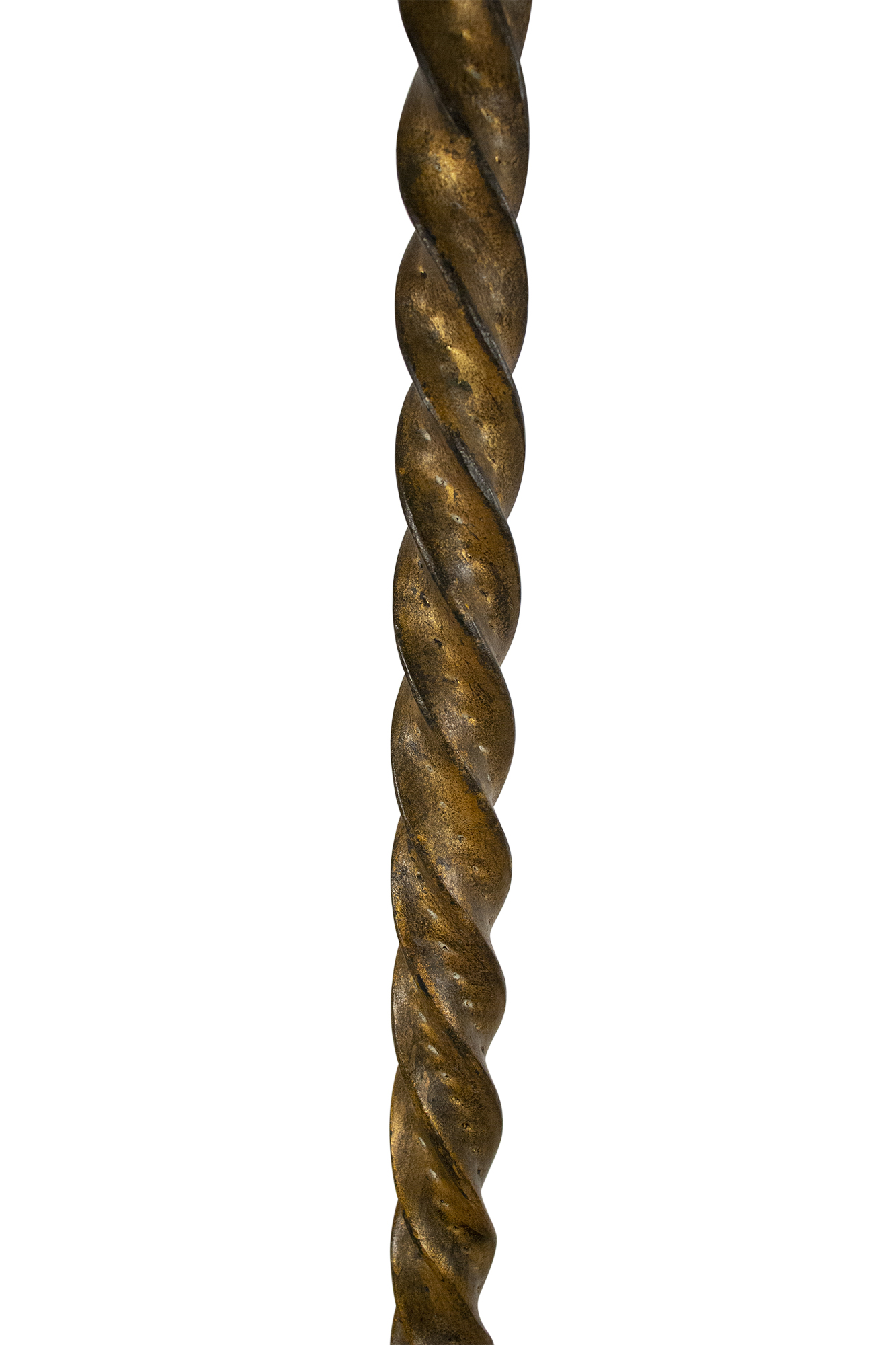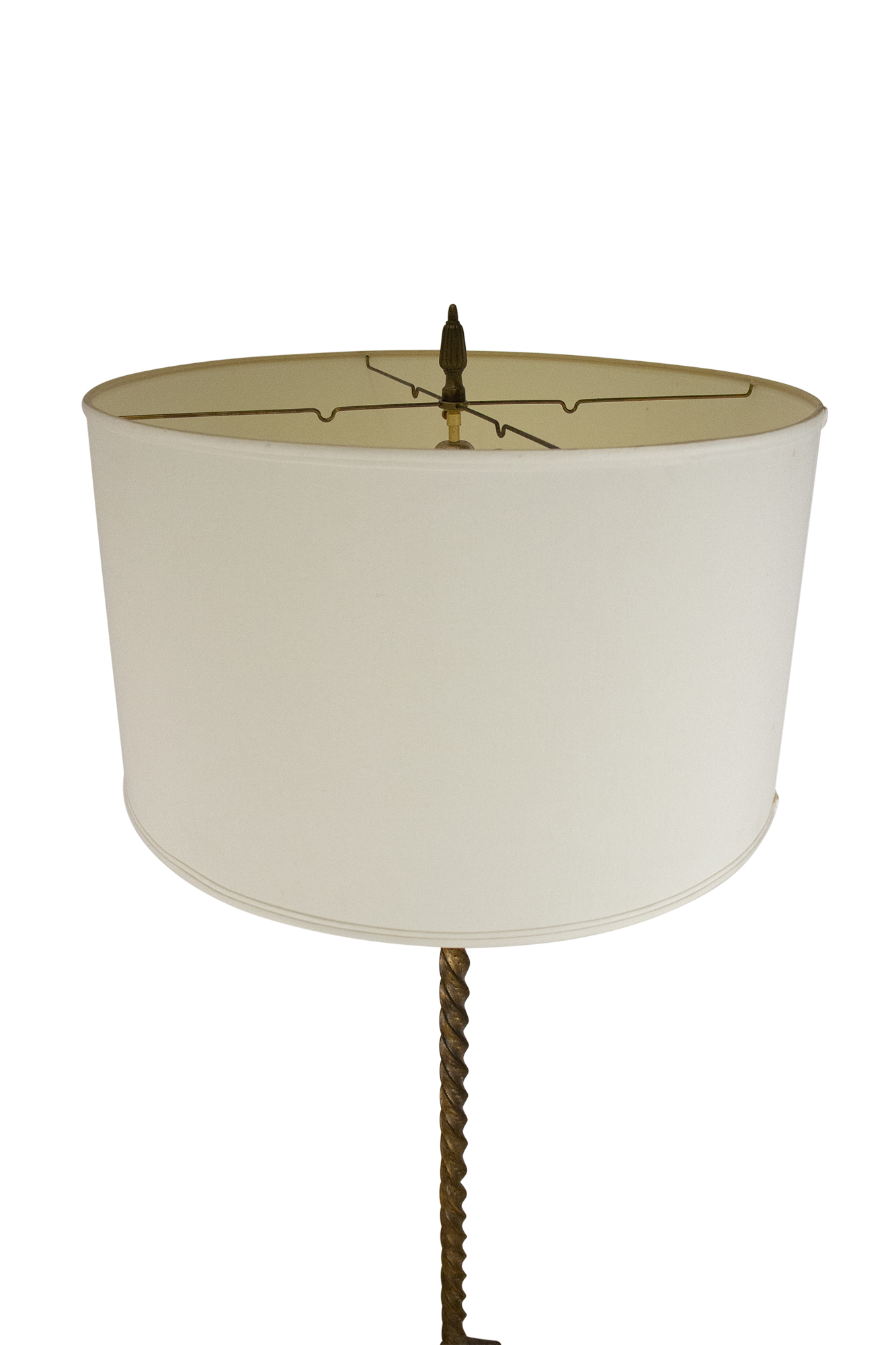 PAIR of Mid-Century gold painted iron floor lamps with a spiral rope design structure having a three legged base with beige fabric drum shades. (PRICED AS PAIR)