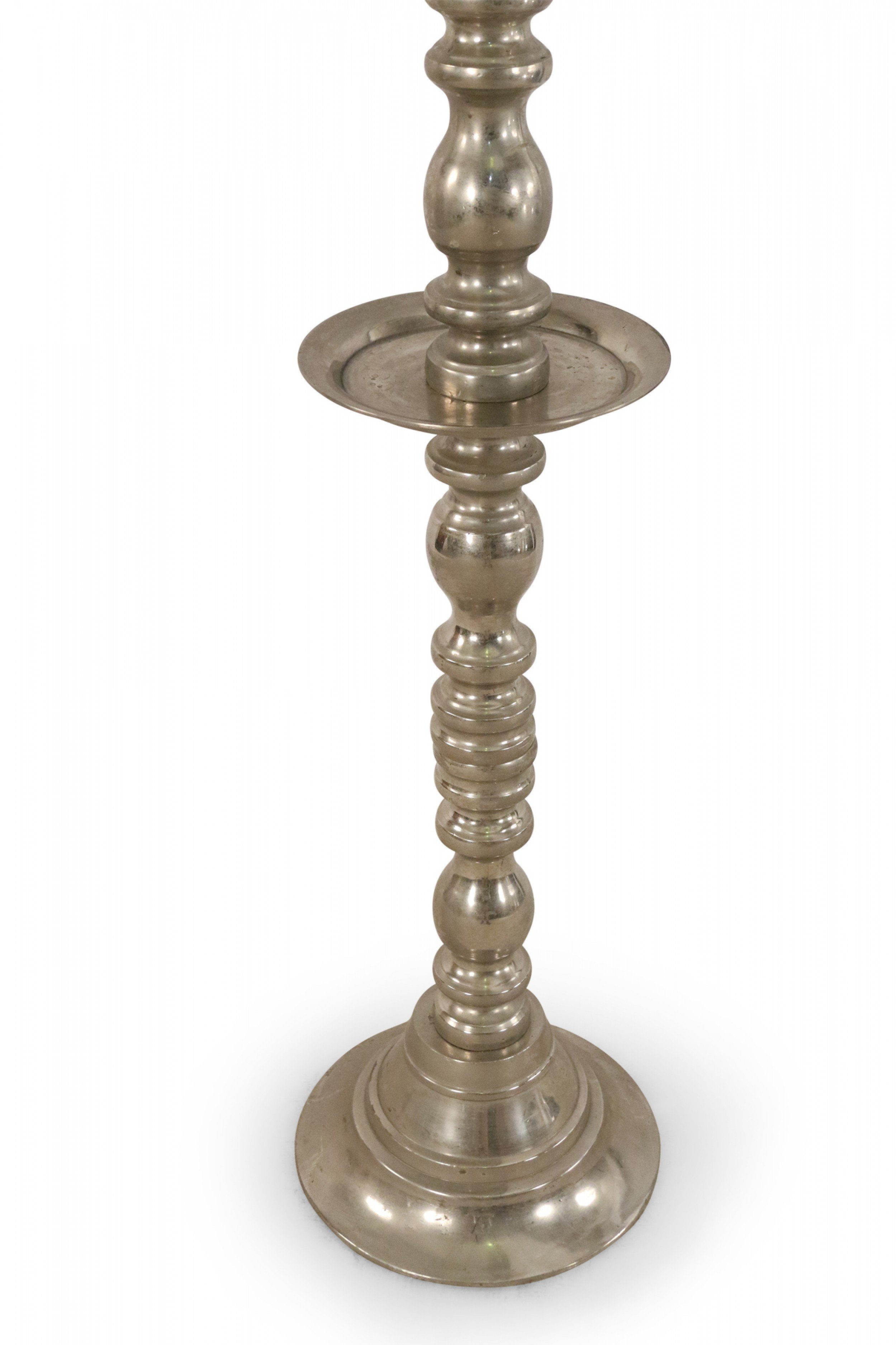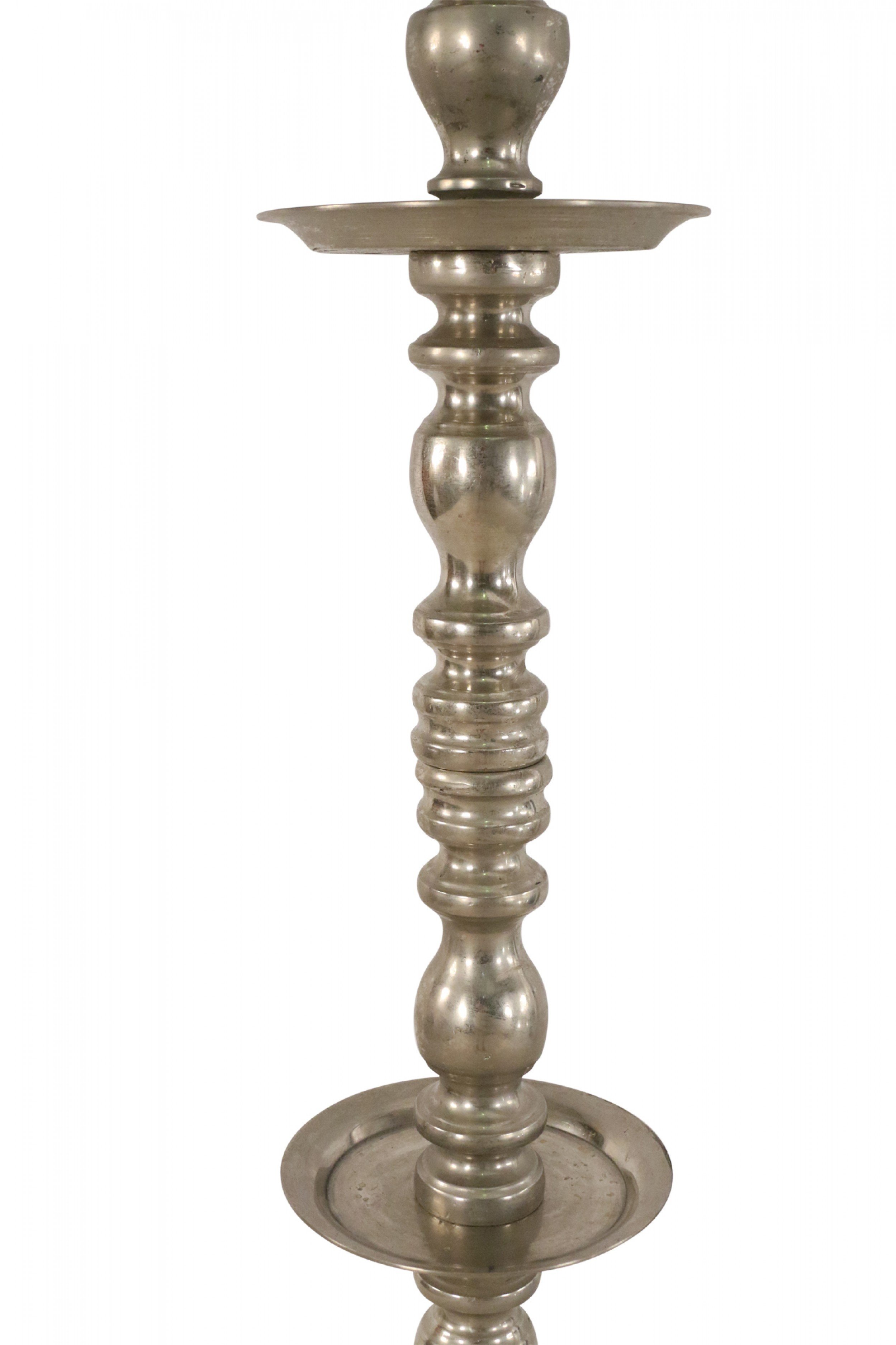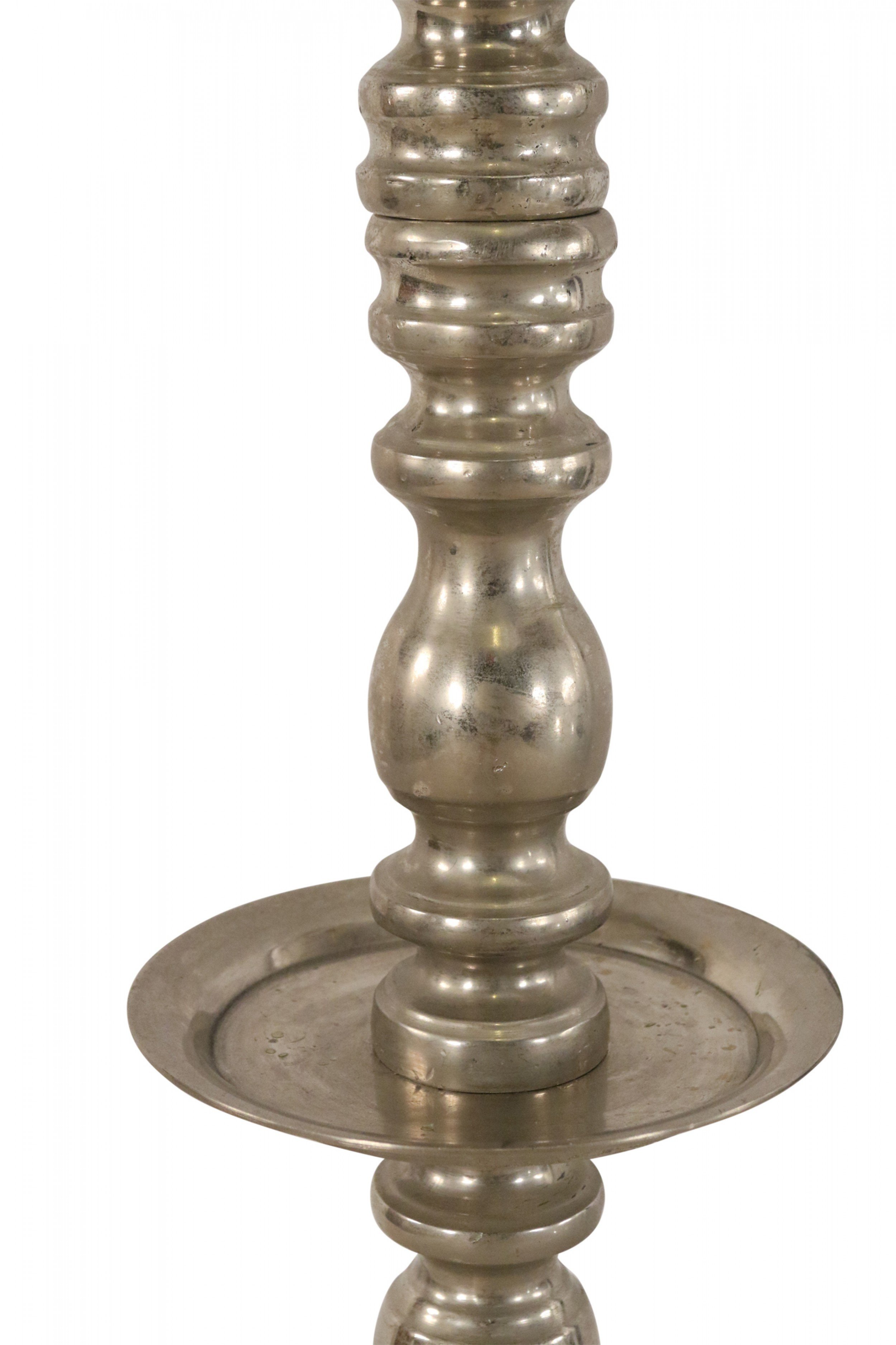 PAIR of Mid-Century silver metal floor torchiere/candleholders with circular bases and a turned design. (PRICED AS PAIR)