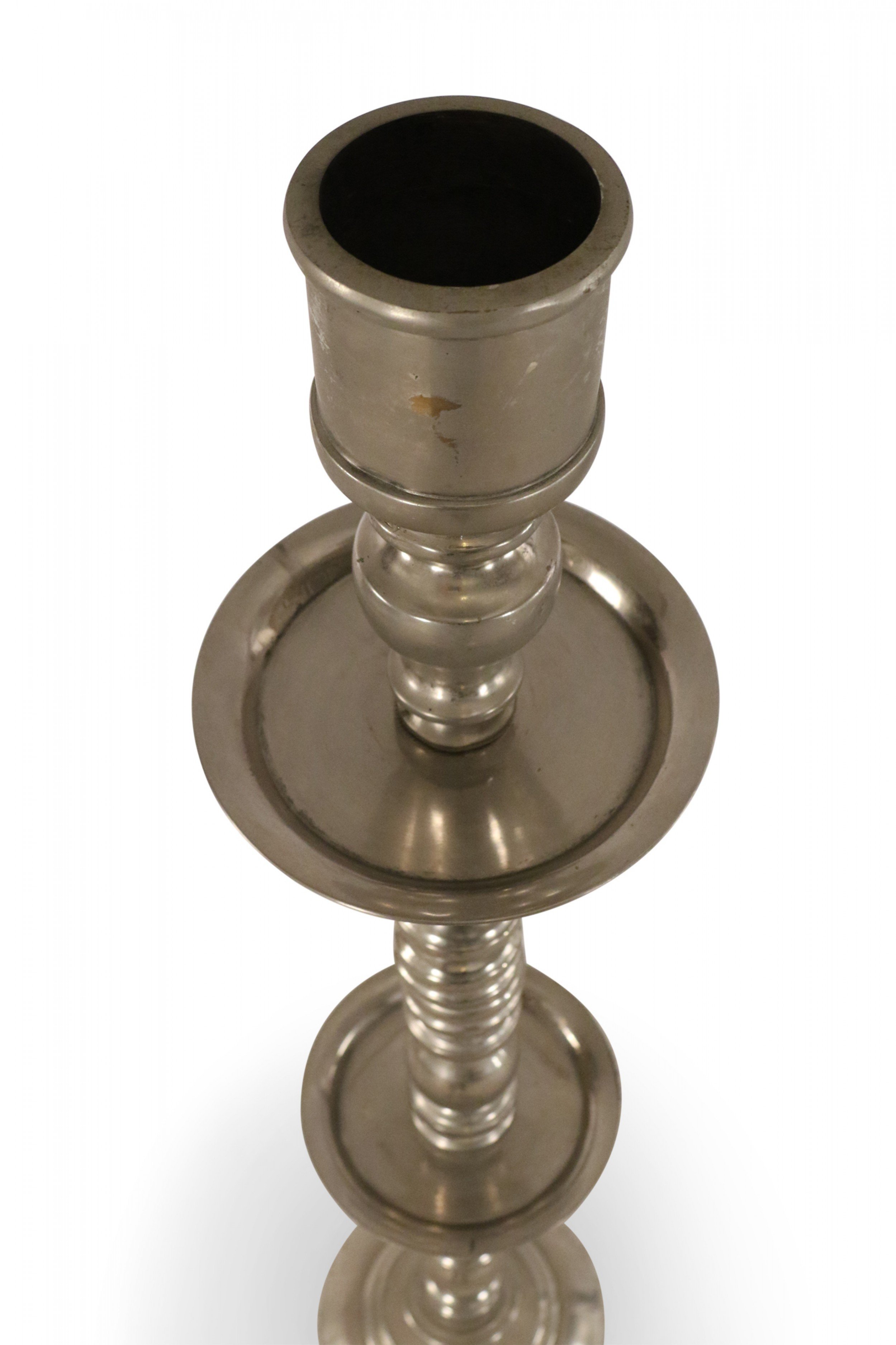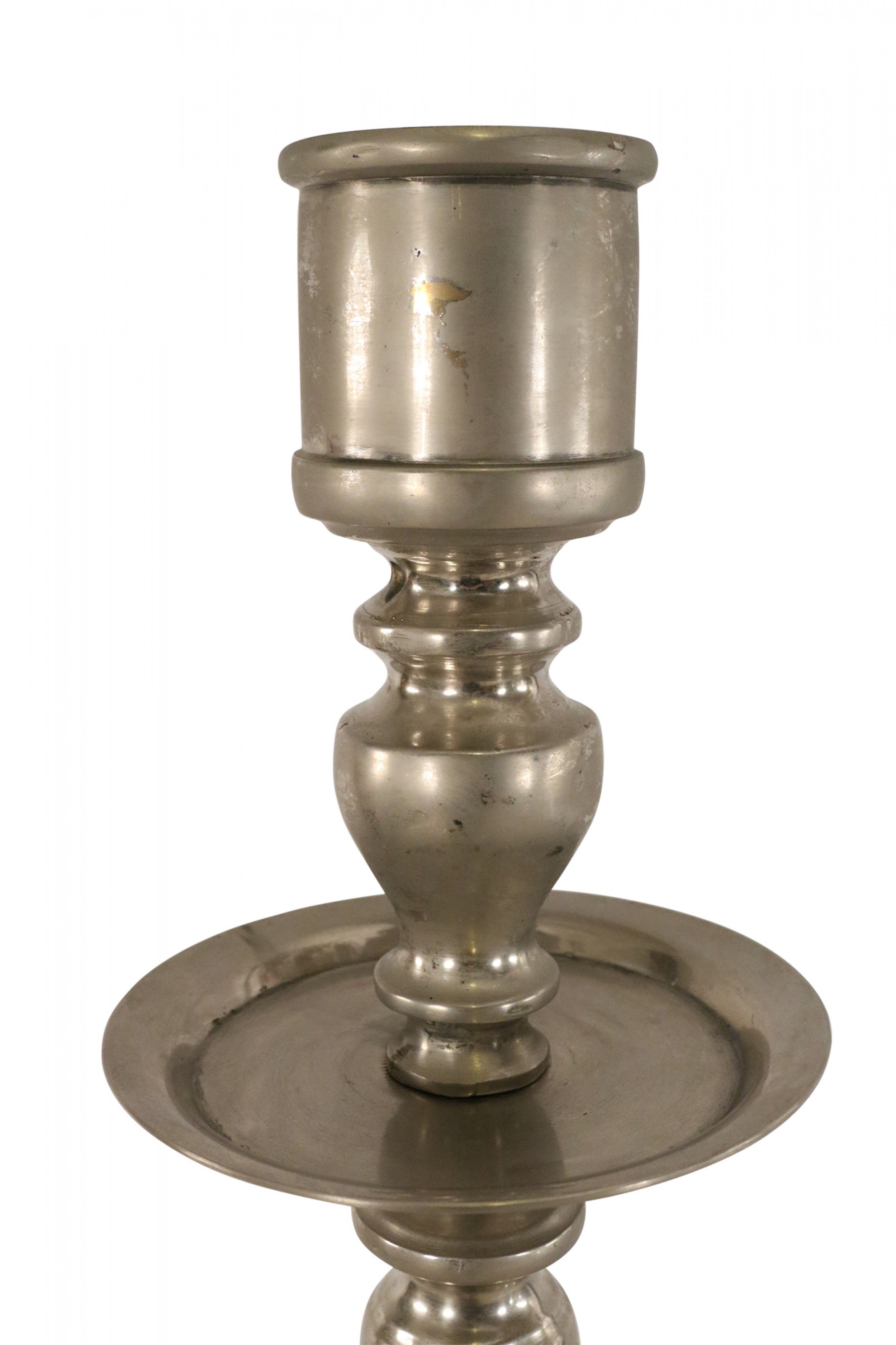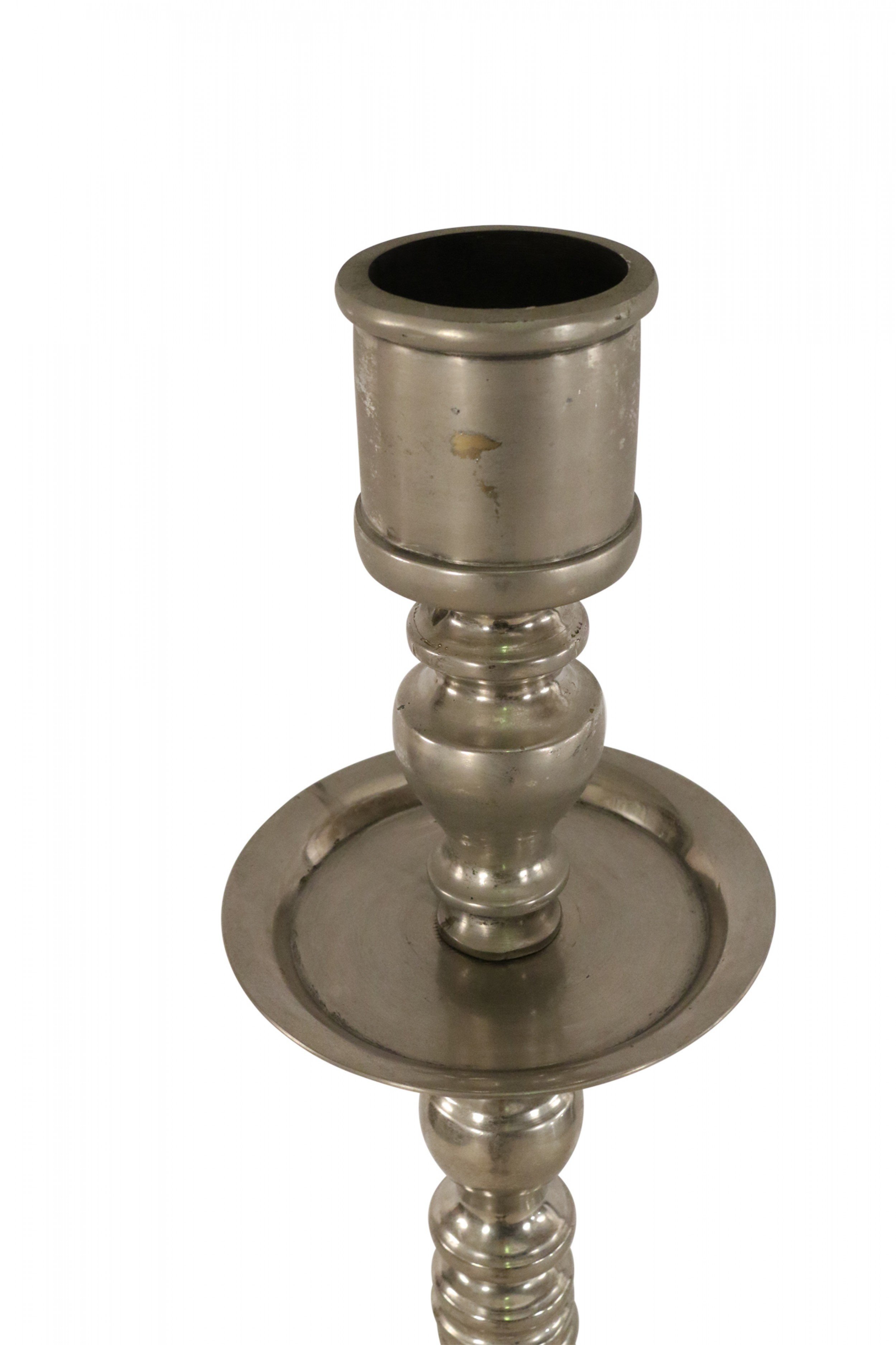 PAIR of Mid-Century silver metal floor torchiere/candleholders with circular bases and a turned design. (PRICED AS PAIR)
