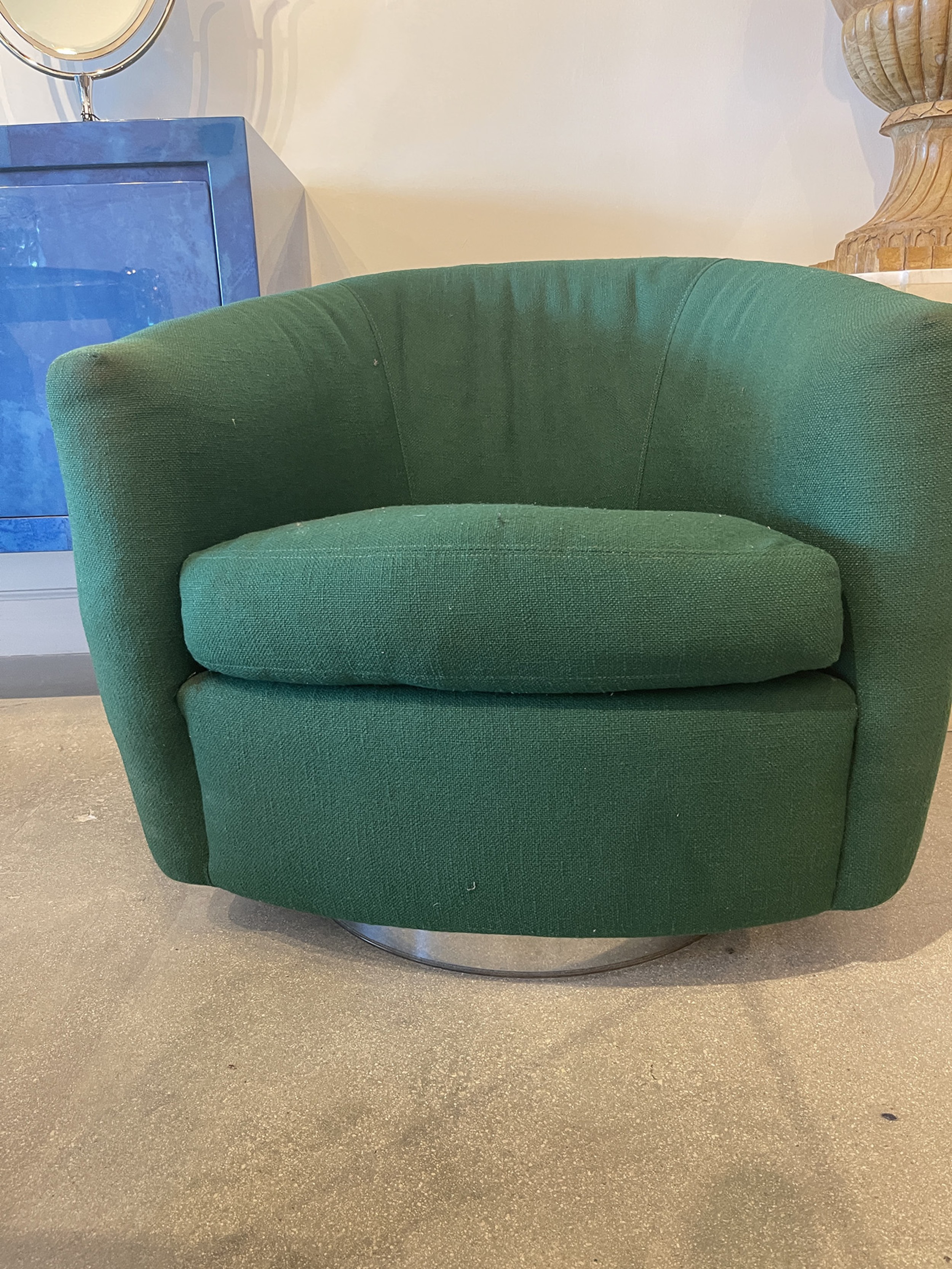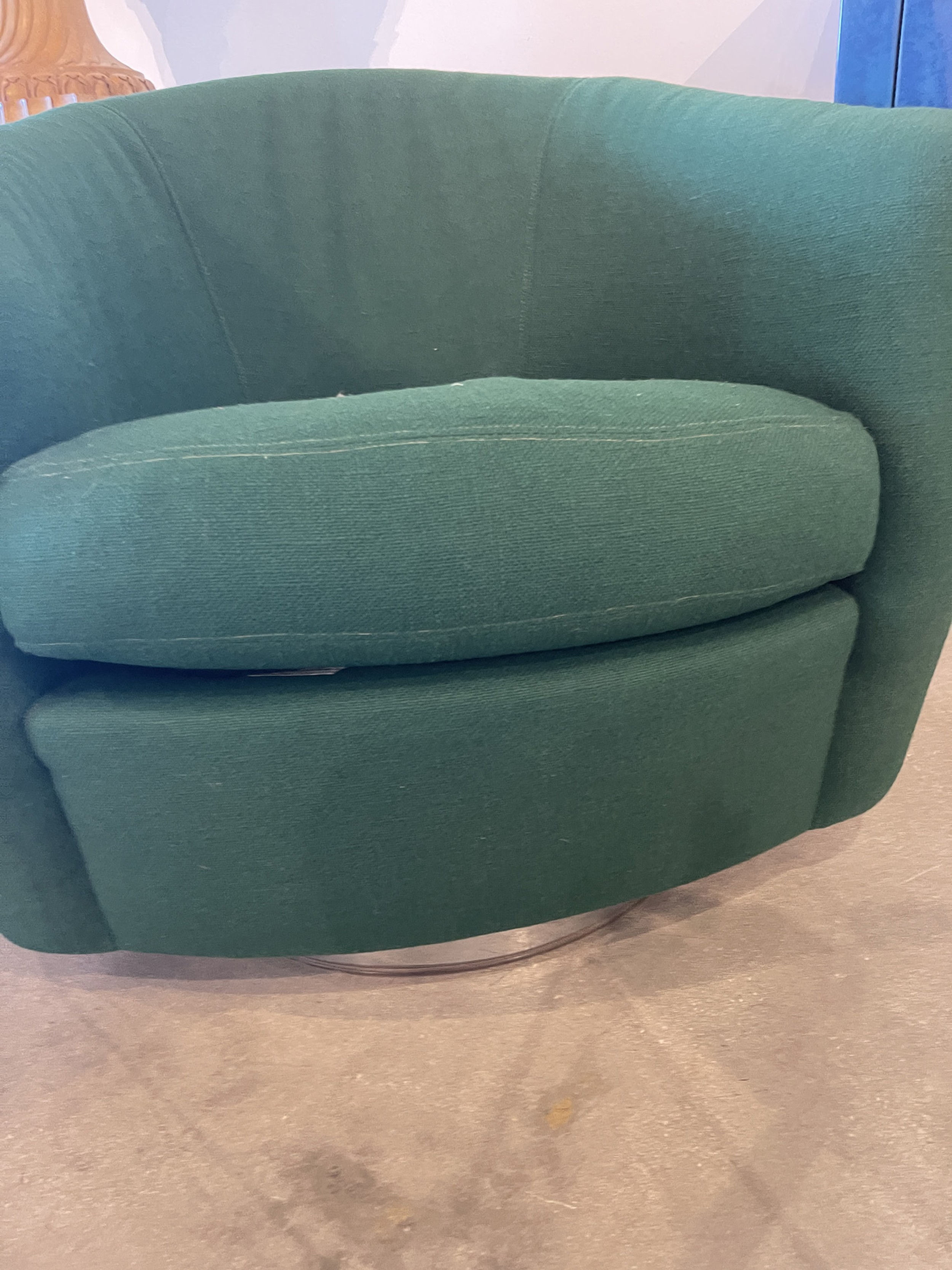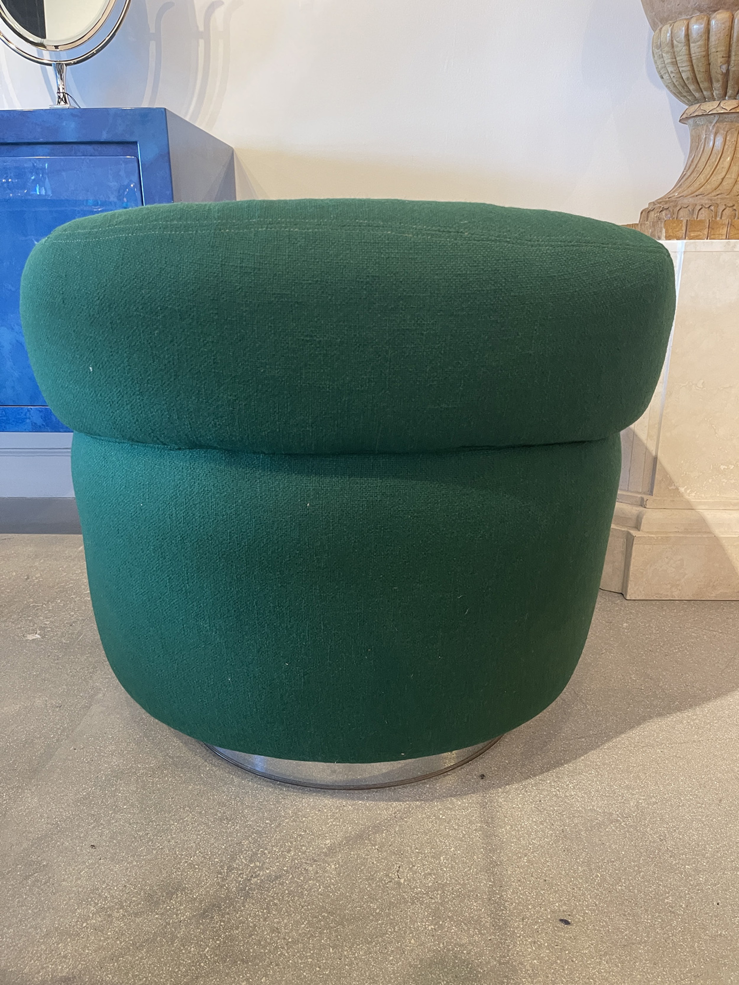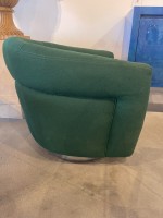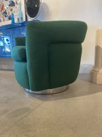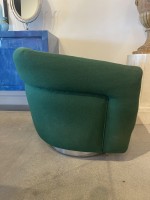 PAIR of American Mid-Century tub form swiveling lounge / armchairs upholstered in emerald green fabric and resting on circular chrome swivel bases. (MILO BAUGHMAN)(PRICED AS PAIR)