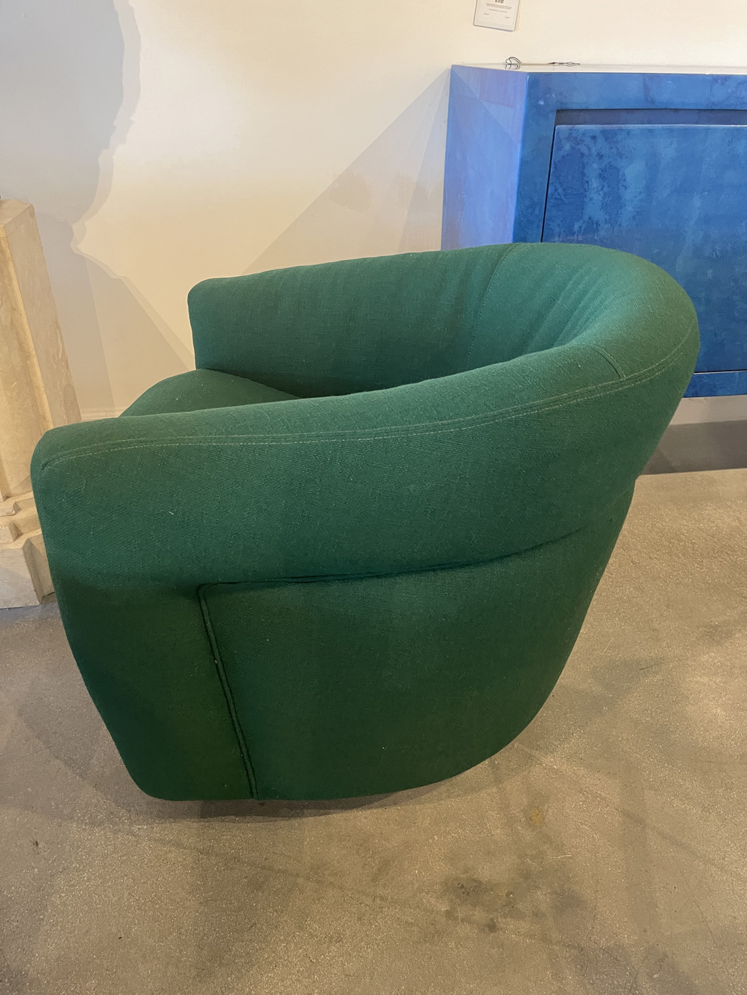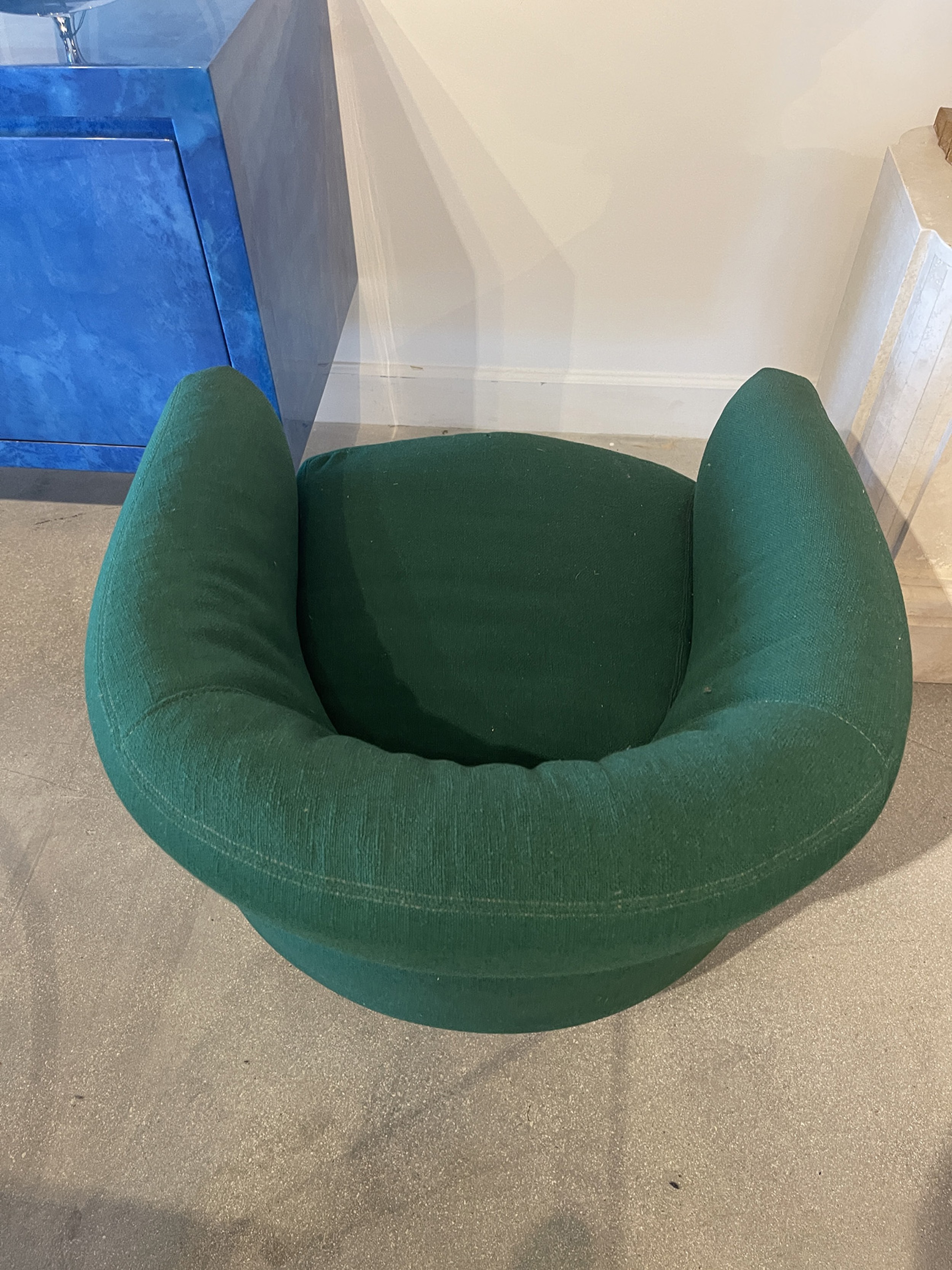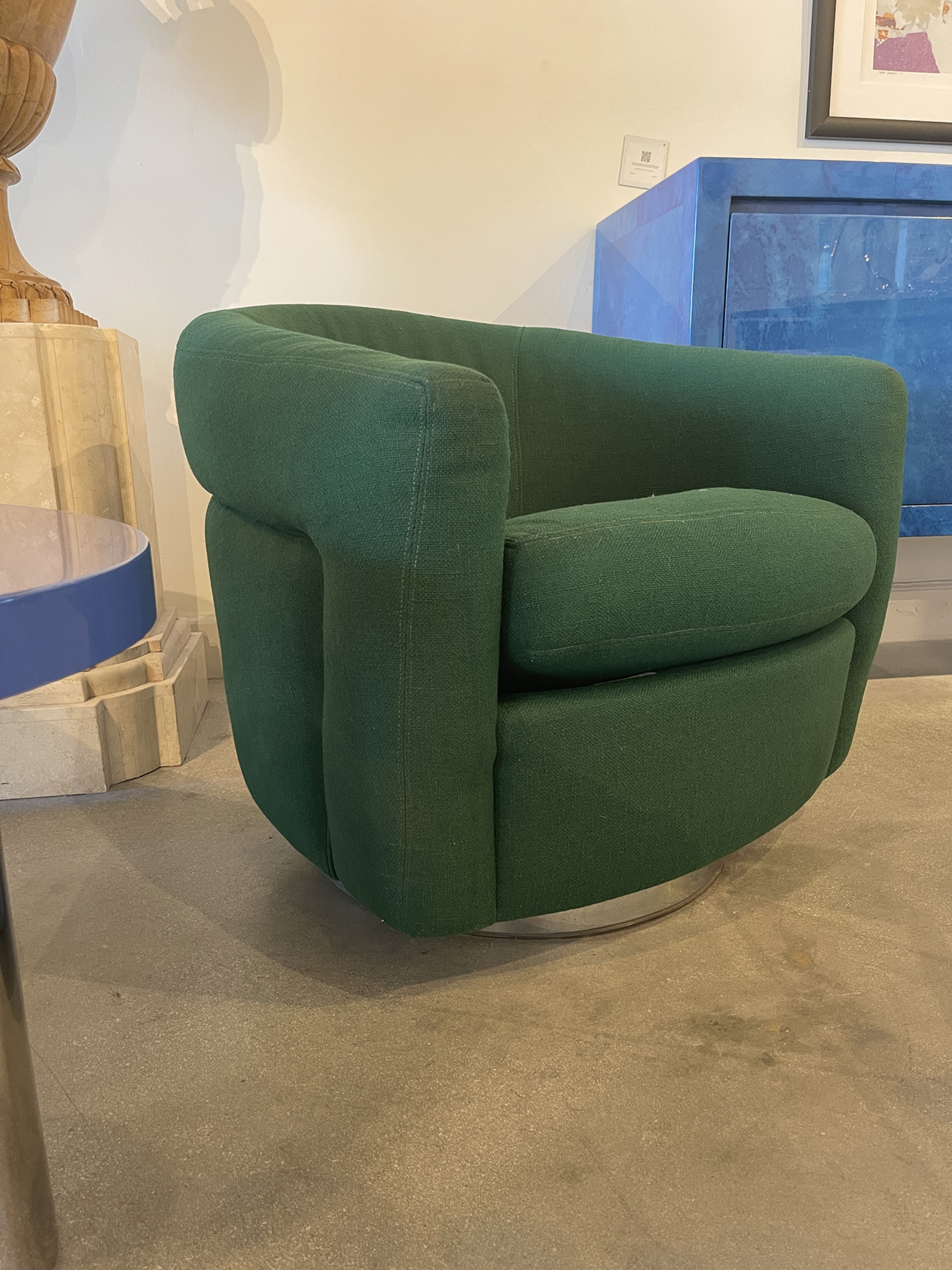 PAIR of American Mid-Century tub form swiveling lounge / armchairs upholstered in emerald green fabric and resting on circular chrome swivel bases. (MILO BAUGHMAN)(PRICED AS PAIR)
