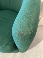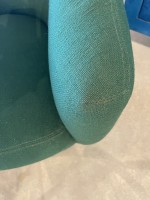 PAIR of American Mid-Century tub form swiveling lounge / armchairs upholstered in emerald green fabric and resting on circular chrome swivel bases. (MILO BAUGHMAN)(PRICED AS PAIR).