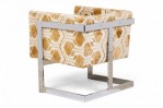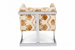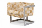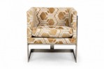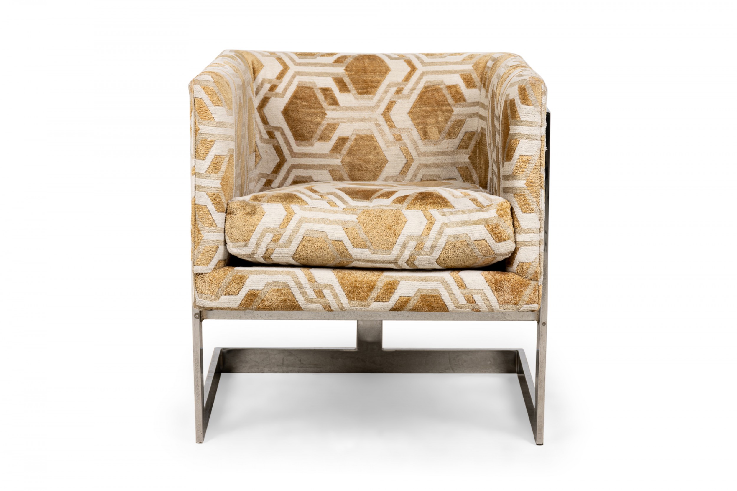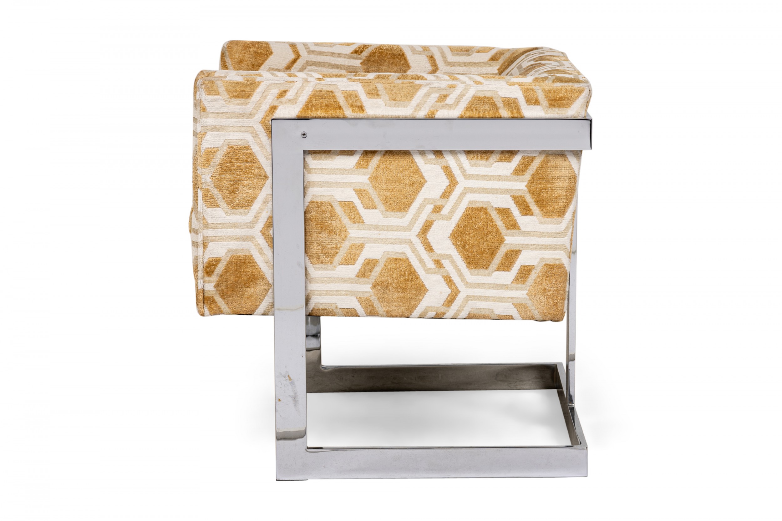 PAIR of American Mid-Century cube form lounge / armchairs with gold and white geometric patterned fabric upholstery and square cantilevered chrome frames. (MILO BAUGHMAN)(PRICED AS PAIR).
