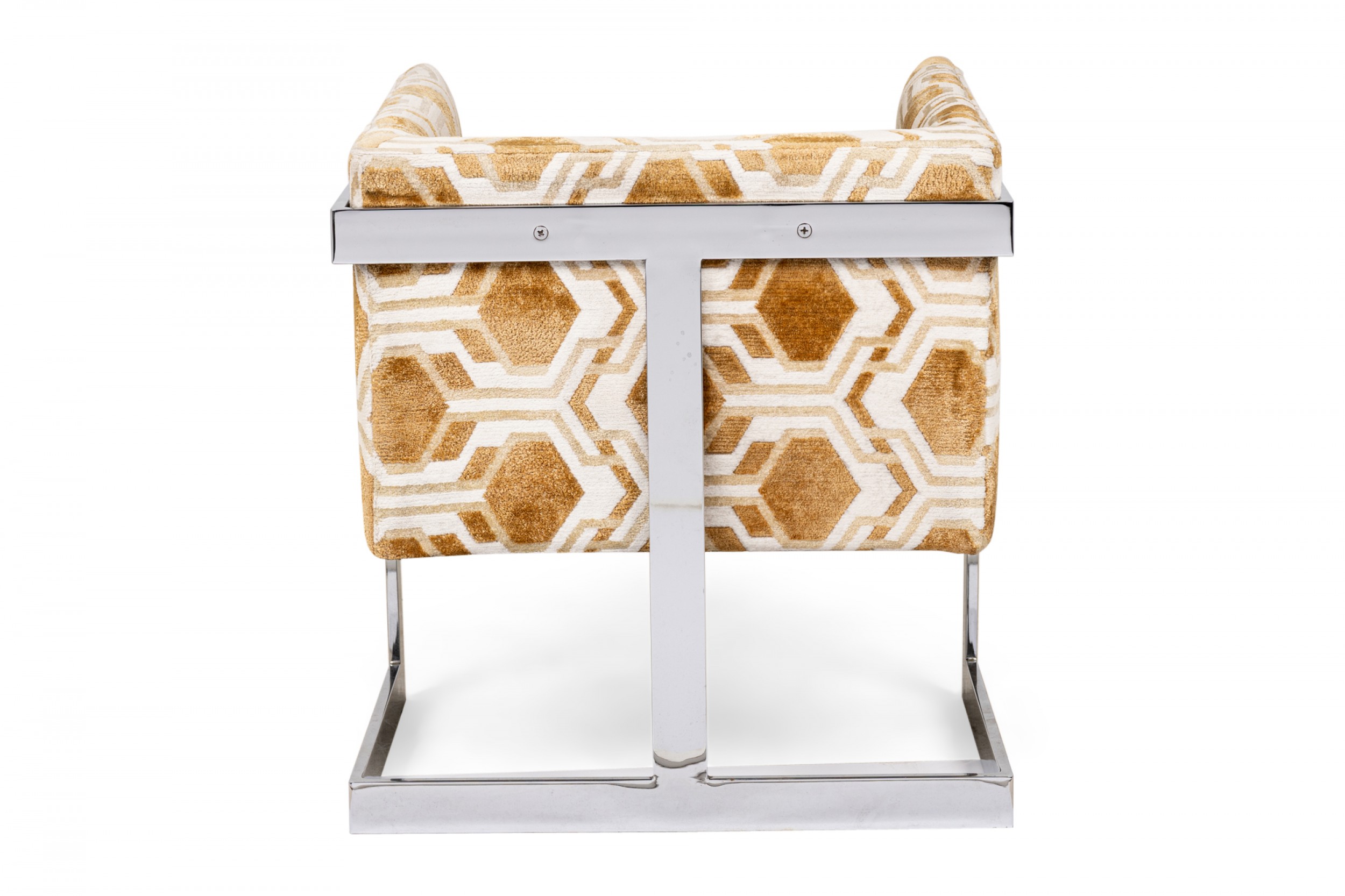 PAIR of American Mid-Century cube form lounge / armchairs with gold and white geometric patterned fabric upholstery and square cantilevered chrome frames. (MILO BAUGHMAN)(PRICED AS PAIR)