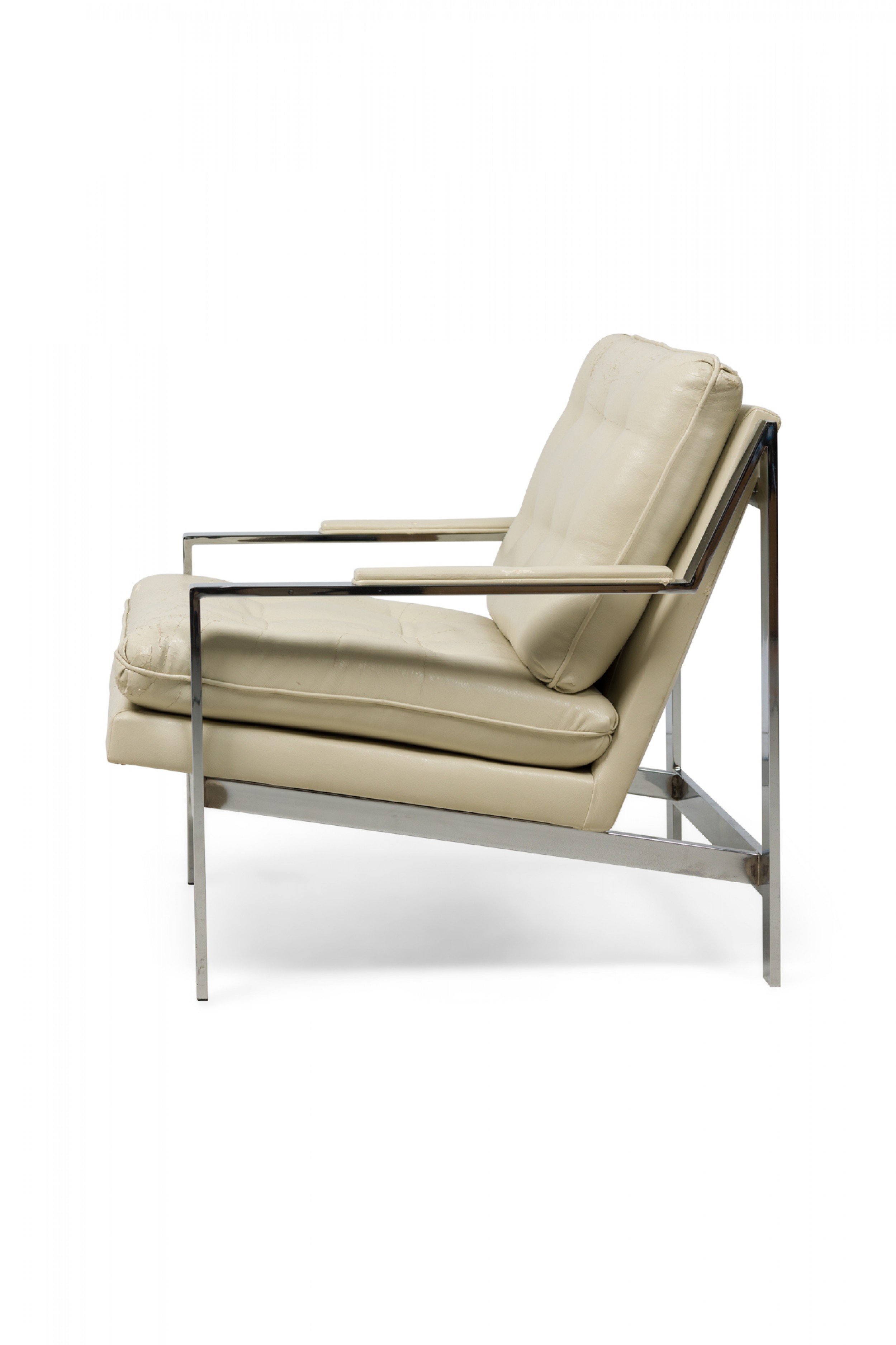 PAIR of Mid-Century American (1970s) chrome flat bar armchairs with an angular tilted frame, upholstered in button tufted beige faux leather. (MILO BAUGHMAN FOR THAYER COGGIN) (PRICED AS PAIR).