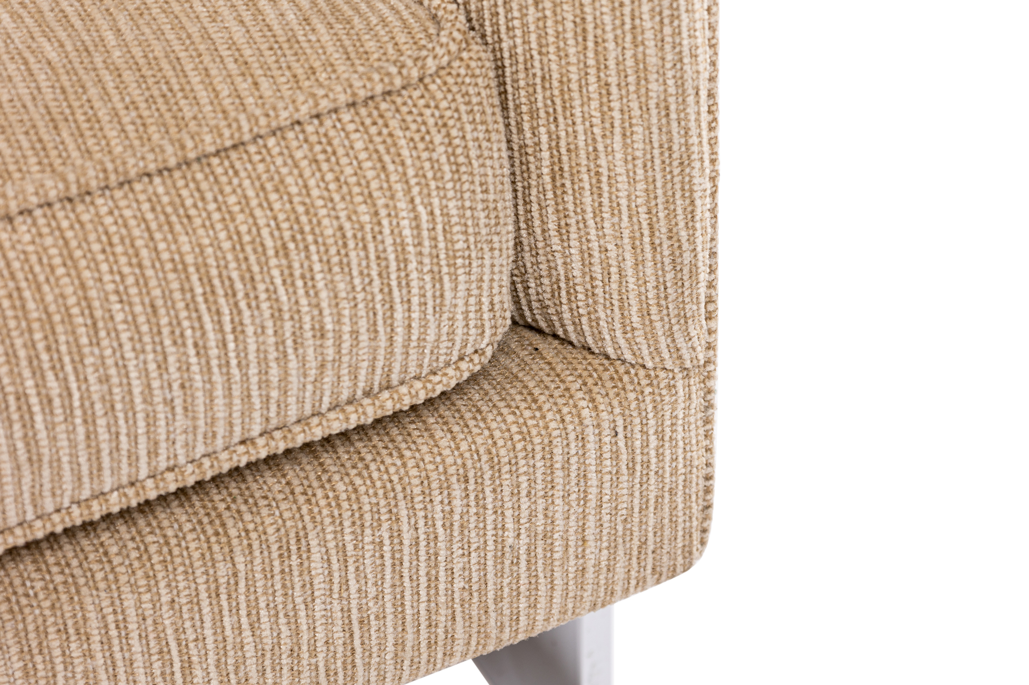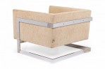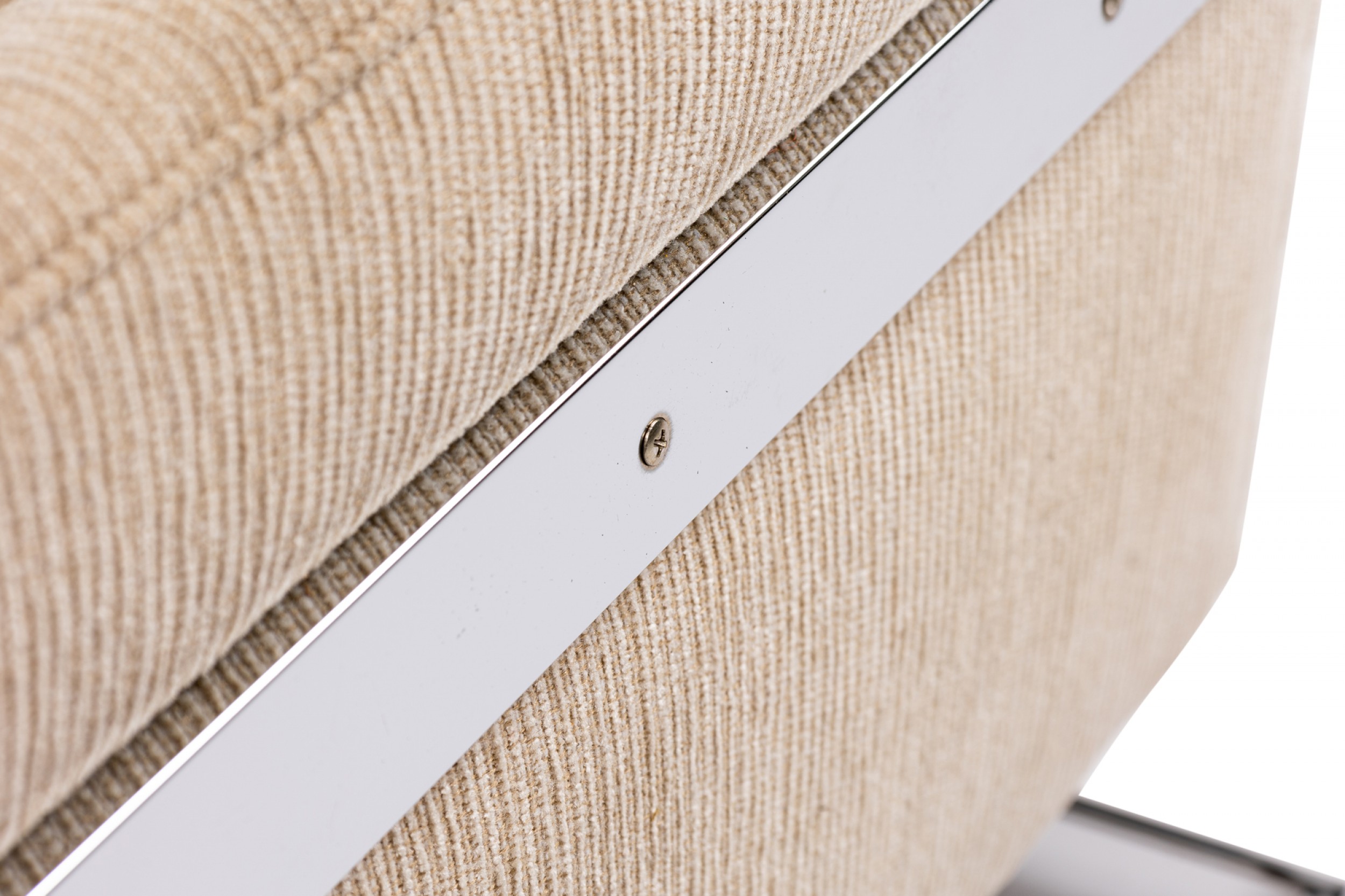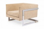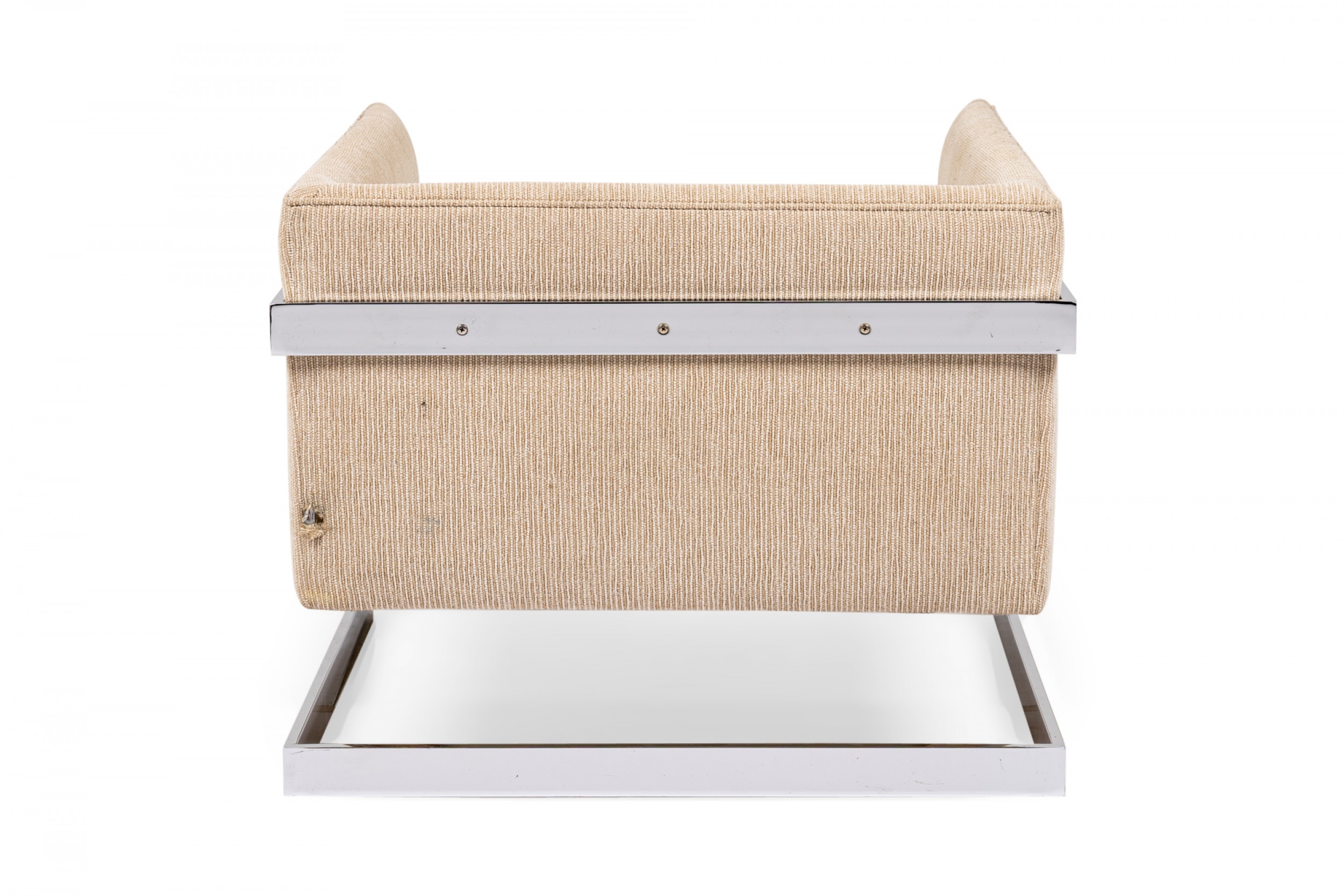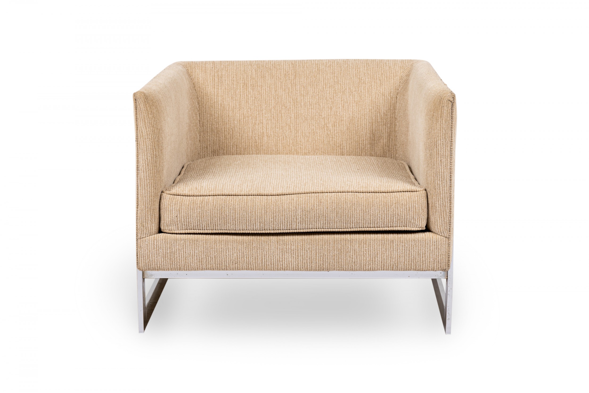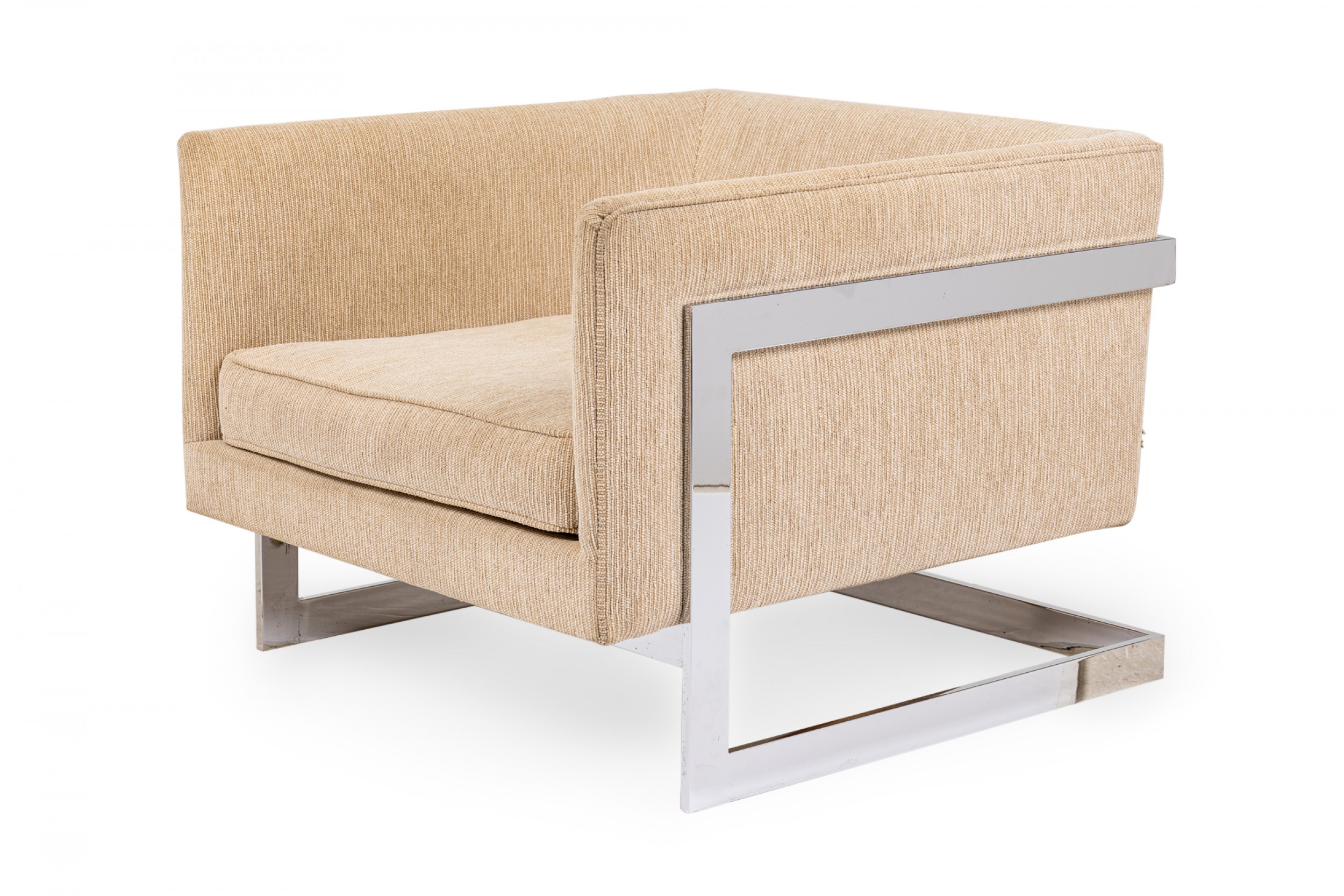 PAIR of American Mid-Century floating cube form lounge / armchairs with chrome plated metal frames and textured beige upholstery. (MILO BAUGHMAN FOR THAYER COGGIN)(PRICED AS PAIR)
