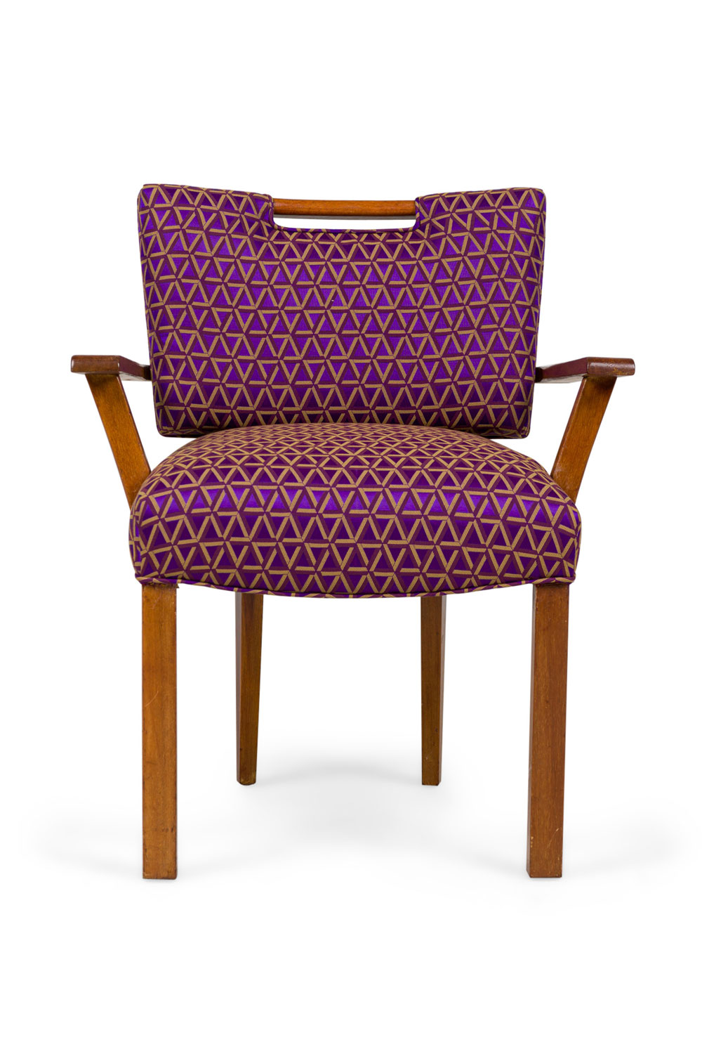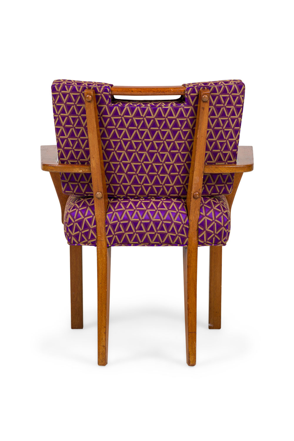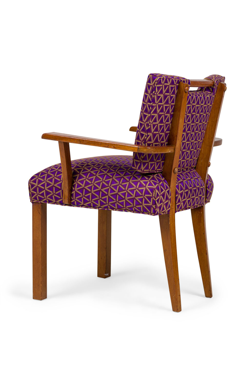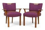 PAIR of Mid-Century (1950s) American armchairs with flat right-angled arms, padded backs upholstered in a brown tone geometric patterned fabric, seat wrapped in light brown canvas fitted & buttoned covers, the back legs tapered and slightly splayed. (PAUL LASZLO) (PRICED AS PAIR) (Part of Set: REG4079, Matching side chairs: REG4079B, companion table: REG4079C).
