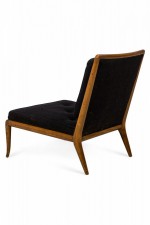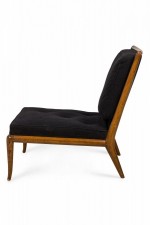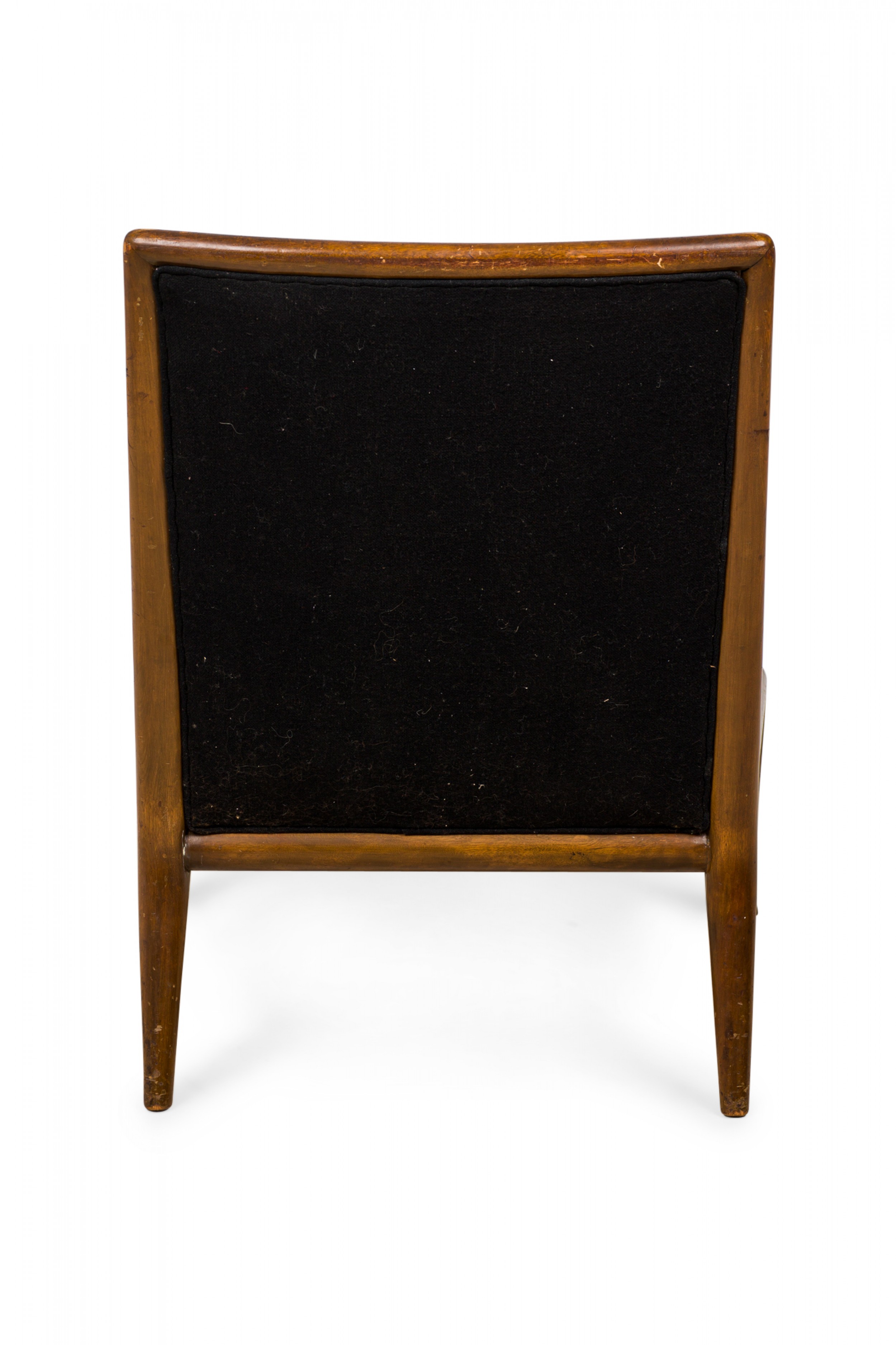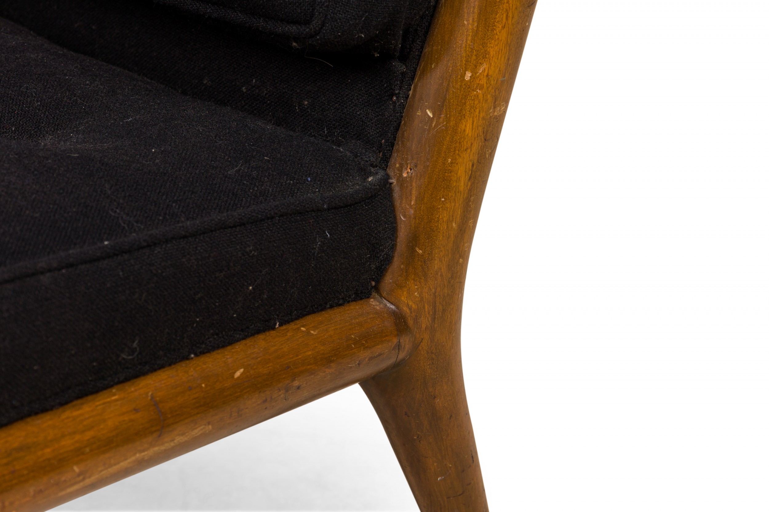 PAIR of American Mid-Century slipper / side chairs with black fabric upholstery with button tufted detail, and a walnut frame, resting on four gently curved and tapered legs. (T.H. ROBSJOHN-GIBBINGS FOR WIDDICOMB)(Similar pieces: DUF0544, DUF0545).