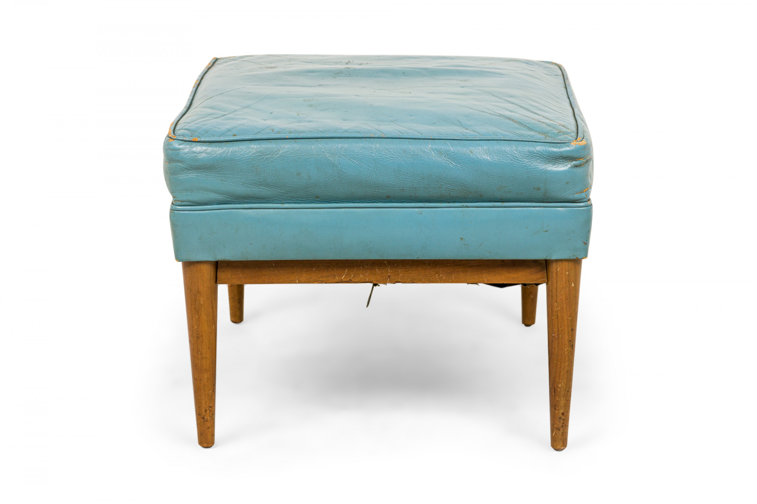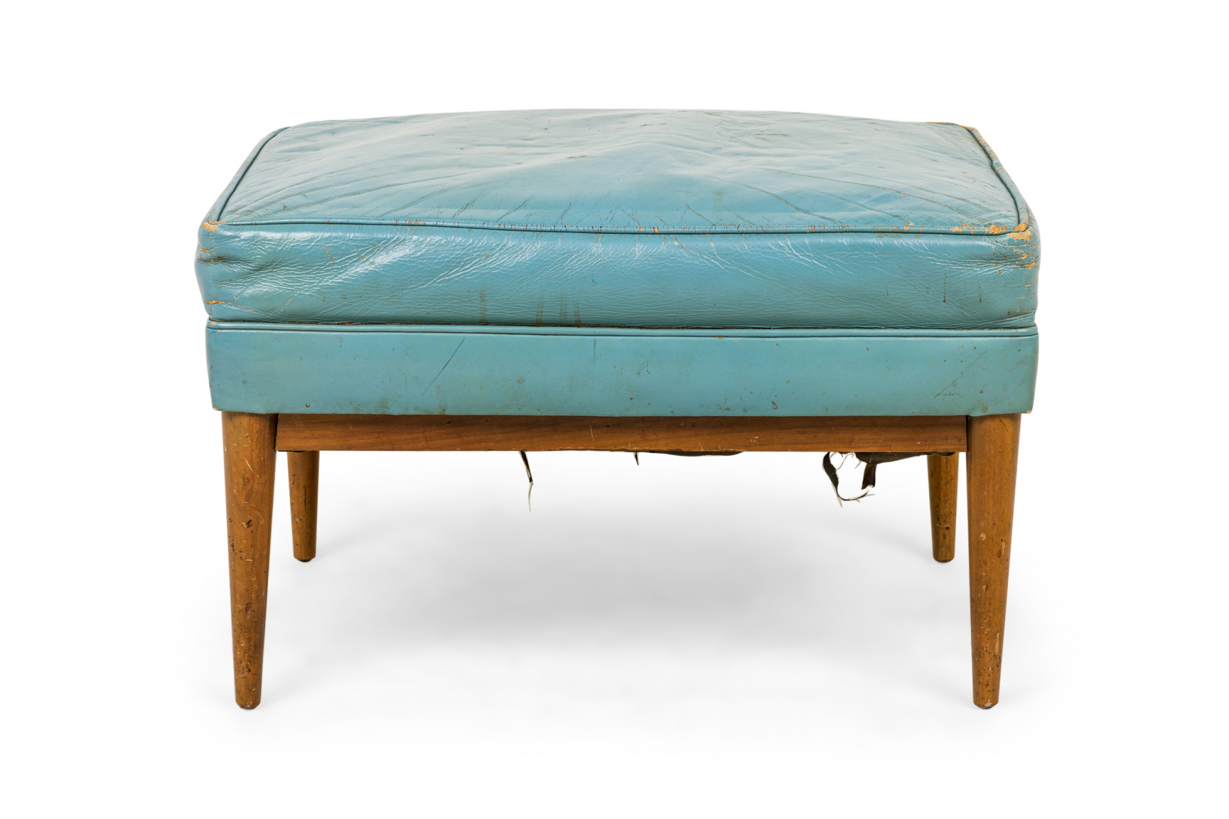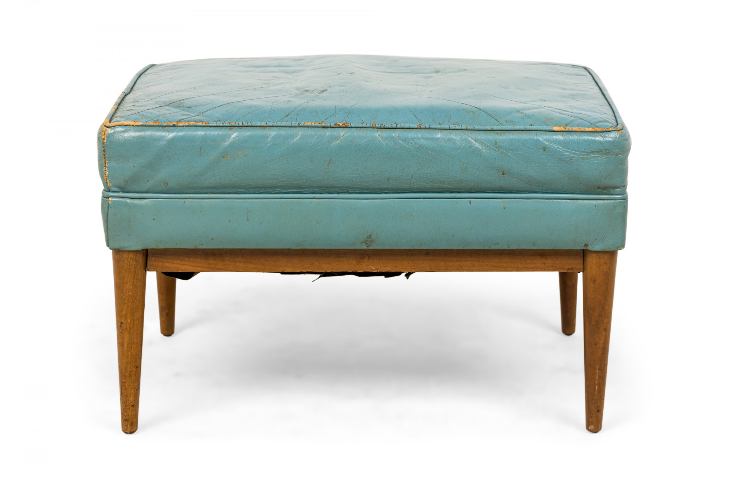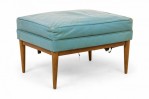 American Mid-Century rectangular ottoman with a blue leather upholstered seat resting on a walnut frame with tapered legs. (PAUL MCCOBB FOR DIRECTIONAL).
